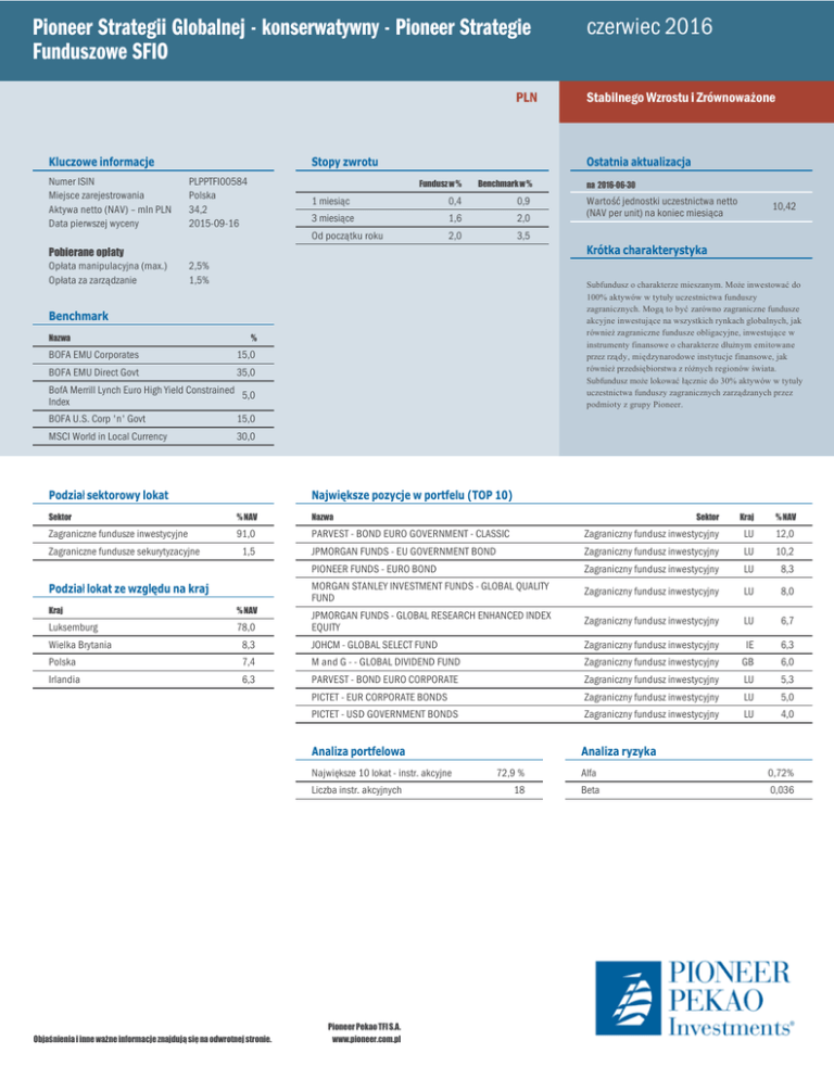 Pioneer Strategii Globalnej - konserwatywny - Pioneer Strategie Funduszowe SFIO PLN Kluczowe informacje Numer ISIN Miejsce zarejestrowania Aktywa netto (NAV) – mln PLN Data pierwszej wyceny Pobierane opłaty Opłata manipulacyjna (max.) Opłata za zarządzanie Stopy zwrotu PLPPTFI00584 Polska 34,2 2015-09-16 2,5% 1,5% Fundusz w % Benchmark w % 1 miesiąc 0,4 3 miesiące 1,6 0,9 2,0 Od początku roku 2,0 3,5 na 20160630 Wartość jednostki uczestnictwa netto (NAV per unit) na koniec miesiąca 10,42 Krótka charakterystyka Subfundusz o charakterze mieszanym. Może inwestować do 100% aktywów w tytuły uczestnictwa funduszy zagranicznych. Mogą to być zarówno zagraniczne fundusze akcyjne inwestujące na wszystkich rynkach globalnych, jak również zagraniczne fundusze obligacyjne, inwestujące w instrumenty finansowe o charakterze dłużnym emitowane przez rządy, międzynarodowe instytucje finansowe, jak również przedsiębiorstwa z różnych regionów świata. Subfundusz może lokować łącznie do 30% aktywów w tytuły uczestnictwa funduszy zagranicznych zarządzanych przez podmioty z grupy Pioneer. % BOFA EMU Corporates 15,0 BOFA EMU Direct Govt 35,0 BofA Merrill Lynch Euro High Yield Constrained 5,0 Index BOFA U.S. Corp 'n' Govt 15,0 MSCI World in Local Currency Stabilnego Wzrostu i Zrównoważone Ostatnia aktualizacja Benchmark Nazwa czerwiec 2016 30,0 Podział sektorowy lokat Największe pozycje w portfelu (TOP 10) Sektor % NAV Nazwa Sektor Kraj % NAV Zagraniczne fundusze inwestycyjne 91,0 1,5 PARVEST - BOND EURO GOVERNMENT - CLASSIC Zagraniczny fundusz inwestycyjny LU JPMORGAN FUNDS - EU GOVERNMENT BOND Zagraniczny fundusz inwestycyjny LU 12,0 10,2 PIONEER FUNDS - EURO BOND Zagraniczny fundusz inwestycyjny LU 8,3 MORGAN STANLEY INVESTMENT FUNDS - GLOBAL QUALITY FUND Zagraniczny fundusz inwestycyjny LU 8,0 JPMORGAN FUNDS - GLOBAL RESEARCH ENHANCED INDEX EQUITY Zagraniczny fundusz inwestycyjny LU 6,7 JOHCM - GLOBAL SELECT FUND Zagraniczny fundusz inwestycyjny IE M and G - - GLOBAL DIVIDEND FUND Zagraniczny fundusz inwestycyjny GB 6,3 6,0 PARVEST - BOND EURO CORPORATE Zagraniczny fundusz inwestycyjny LU PICTET - EUR CORPORATE BONDS Zagraniczny fundusz inwestycyjny LU 5,3 5,0 PICTET - USD GOVERNMENT BONDS Zagraniczny fundusz inwestycyjny LU 4,0 Analiza portfelowa Analiza ryzyka Zagraniczne fundusze sekurytyzacyjne Podział lokat ze względu na kraj Kraj % NAV Luksemburg 78,0 8,3 Wielka Brytania Polska Irlandia 7,4 6,3 Największe 10 lokat - instr. akcyjne Liczba instr. akcyjnych Objaśnienia i inne ważne informacje znajdują się na odwrotnej stronie. Pioneer Pekao TFI S.A. www.pioneer.com.pl 72,9 % 18 Alfa Beta 0,72% 0,036 Pioneer Strategii Globalnej - konserwatywny - Pioneer Strategie Funduszowe SFIO czerwiec 2016 Wzrost wartości 10 000 PLN Komentarz Proporcjonalny udział jednostek uczestnictwa lub tytułów uczestnictwa poszczególnych funduszy, w które są lokowane aktywa subfunduszu, jest uzależniony od decyzji zarządzającego portfelem inwestycyjnym subfunduszu. Podejmowana jest ona z uwzględnieniem celu inwestycyjnego subfunduszu, warunków ekonomicznych i sytuacji na rynkach instrumentów finansowych. Dobór jednostek uczestnictwa lub tytułów uczestnictwa poszczególnych funduszy, które są przedmiotem lokat subfunduszu, odbywa się poprzez pryzmat celów inwestycyjnych, polityki inwestycyjnej i stylu zarządzania tymi funduszami na podstawie decyzji zarządzającego portfelem inwestycyjnym subfunduszu, podejmowanej w oparciu o analizę procesu inwestycyjnego, ocenę zarządzającego i wspomagającego go zespołu, analizę osiąganych wyników, stosowanych Pioneer Strategii Globalnej konserwatywny Pioneer Strategie Funduszowe SFIO PLN Zespół inwestycyjny Pioneer Investment Austria GmbH z siedzibą w Wiedniu zarządza częścią portfela inwestycyjnego subfunduszu lokowaną w jednostki uczestnictwa, tytuły uczestnictwa funduszy zagranicznych. Pioneer Pekao Investment Management S.A. z siedzibą w Warszawie Bartosz Częścik (licencja doradcy inwestycyjnego nr 390) oraz Piotr Sałata (licencja doradcy inwestycyjnego nr 349) zarządzają pozostałą częścią portfela inwestycyjnego. Objaśnienia Jeśli nie stwierdzono inaczej wszystkie informacje są aktualne na 30 Nota prawna Niniejszy materiał został sporządzony w celu informacyjnym. czerwca 2016 roku. Z uwagi na fakt, że znaczna część aktywów subfunduszu może być lokowana w tytuły uczestnictwa funduszy zagranicznych, inwestujących w instrumenty Nie należy go traktować jako oferty funduszy inwestycyjnych lub finansowe o charakterze udziałowym, wartość jednostki uczestnictwa towarzystwa funduszy inwestycyjnych w rozumieniu przepisów kodeksu subfunduszu może charakteryzować się dużą zmiennością. cywilnego. Prezentowane w niniejszym materiale dane, stanowiące Indeksy MSCI MSCI, ani żadna inna strona uczestnicząca w lub związana ze opracowanie własne Pioneer Pekao TFI S.A. (PP TFI), są wynikiem zbieraniem, obliczaniem lub tworzeniem danych MSCI nie daje jakichkolwiek inwestycyjnym w konkretnym okresie historycznym i nie stanowią gwarancji wyraźnych lub dorozumianych gwarancji ani oświadczeń w odniesieniu do osiągnięcia podobnych wyników w przyszłości. Wyniki przedstawione w tych danych (lub do wyników uzyskanych przy ich wykorzystywaniu), i materiale nie uwzględniają opłaty manipulacyjnej ani podatków wszystkie te strony niniejszym wyraźnie wypierają się wszelkich gwarancji obciążających uczestnika. Kluczowe Informacje dla Inwestorów (KII) oryginalności, dokładności, kompletności, przydatności handlowej lub funduszy inwestycyjnych zarządzanych przez PP TFI, jak również prospekty przydatności do określonego celu w odniesieniu do wszelkich takich informacyjne tych Funduszy, zawierające szczegółowy opis czynników danych. Bez ograniczenia każdego z powyższych zastrzeżeń, MSCI i jego ryzyka związanego z inwestowaniem w te Fundusze oraz szczegóło