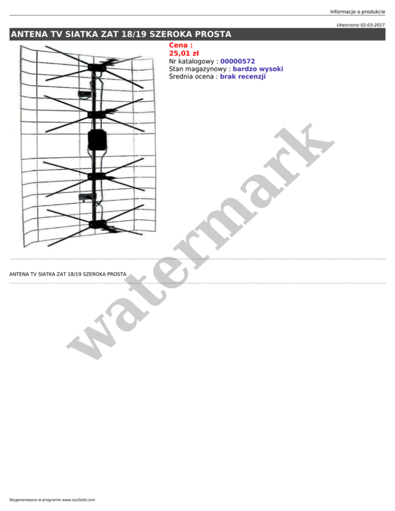 Informacje o produkcie Utworzono 02-03-2017 ANTENA TV SIATKA ZAT 18/19 SZEROKA PROSTA Cena : 25,01 zł er m ar k Nr katalogowy : 00000572 Stan magazynowy : bardzo wysoki Średnia ocena : brak recenzji w at ANTENA TV SIATKA ZAT 18/19 SZEROKA PROSTA Wygenerowano w programie www.oscGold.com