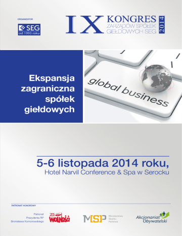 2014 IX ORGANIZATOR Ekspansja zagraniczna spółek giełdowych 5-6 listopada 2014 roku, Hotel Narvil Conference & Spa w Serocku PATRONAT HONOROWY Patronat Prezydenta RP Bronisława Komorowskiego 2014 IX Szanowni Państwo, Pragnę wszystkich Państwa serdecznie zaprosić na IX Kongres Zarządów Spółek Giełdowych SEG, który odbędzie się w dniach 5-6 listopada 2014 roku w Hotelu Narvil Conference & Spa w Serocku. Mam przyjemność również poinformować, iż wydarzenie zostało objęte Patronatem Honorowym Prezydenta RP Bronisława Komorowskiego – 25-lecie Wolności oraz Patronatem Honorowym Ministerstwa Skarbu Państwa i Akcjonariatu Obywatelskiego. Tematem przewodnim listopadowego Kongresu jest ekspansja zagraniczna spółek giełdowych. Pierwszego dnia zaprezentujemy trzy sesje plenarne, dyskutowane w gronie Zarządów czołowych polskich spółek, które poświęcone będą celom i uwarunkowaniom ekspansji zagranicznej, modelom zdobywania rynków zagranicznych oraz finansowaniu ekspansji zagranicznej. Po części merytorycznej odbędzie się Charytatywny Bieg Rynku Kapitałowego z udziałem Roberta Korzeniowskiego, wielokrotnego mistrza olimpijskiego. Minimalnym dystansem będzie 1 km – z możliwością przebiegnięcia go wielokrotnie – im więcej przebiegniemy, tym więcej środków przeznaczymy na cele charytatywne. Uzyskane podczas biegu środki zostaną przeznaczone na praktyczną edukację młodzieży ponadgimnazjalnej w zakresie przedsiębiorczości w ramach programu „Zarządzanie firmą”, który jest realizowany przez Fundację Młodzieżowej Przedsiębiorczości. Po części sportowej zapraszam Państwa na koktajl oraz uroczystą kolację. Drugiego dnia Kongresu zaplanowaliśmy warsztaty tematyczne, które w tegorocznej edycji odbędą się w nieco innej formule. Podczas pierwszej tury zajęć praktycznych skoncentrujemy się na ekspansji zagranicznej w poszczególnych obszarach geograficznych, natomiast podczas drugiej tury do wyboru pozostawiam Państwu jeden z czterech tematów istotnych z punktu widzenia członków zarządów spółek giełdowych. Mam nadzieję, że proponowana tematyka, która – jak sądzę – stanie się ważnym przyczynkiem do refleksji nad funkcjonowaniem firm w obecnym otoczeniu rynkowym, nakreśli Państwu również nowe strategie rozwoju w kontekście międzynarodowym. Życzę owocnego udziału w Kongresie! dr Mirosław Kachniewski Prezes Zarządu Stowarzyszenie Emitentów Giełdowych Udział w Kongresie jest bezpłatny dla spółek należących do SEG oraz Gości SEG. Spółki giełdowe nienależące do SEG mogą wziąć udział w Kongresie zgodnie z cennikiem zawartym w formularzu zgłoszeniowym bądź przystępując do Stowarzyszenia. Liczba miejsc jest ograniczona, decyduje kolejność zgłoszeń. Pierwszeństwo mają spółki SEG. Uczestnicy sami pokrywają koszt zakwaterowania. Formularz zgłoszeniowy należy wypełnić elektronicznie i odesłać do dnia 14 października 2014 roku, klikając w prawym górnym rogu „wyślij formularz”. W sprawie członkostwa prosimy o kontakt z p. Joanną Bielecką pod numerem tel. (22) 826 26 89 bądź mailowo na adres: [email protected] W sprawie kongresu prosimy o kontakt z p. Agatą Bednarczyk pod numerem tel. (22) 692 49 45 bądź mailowo na adres: [email protected] Ekspansja zagraniczna spółek giełdowych 5 – 6 listopada 2014 roku, Hotel Narvil Conference & Spa, Serock Czynniki konkurencyjności polskich przedsiębiorstw ? Bezpośrednie i pośrednie wsparcie państwa Cele ekspansji zagranicznej ? Specyfika poszczególnych rynków ? Zaostrzająca się konkurencja o inwestorów Forma ekspansji Finansowanie bankowe vs. rynkowe ? Zagraniczne finansowanie ekspansji zagranicznej www.seg.org.pl 2014 IX Program Kongresu 5 LISTOPADA 2014 (środa) 11.00 – 12.00 Rejestracja gości oraz kawa powitalna 12.00 – 12.10 Otwarcie Kongresu 12.10 – 13.40 dr Mirosław Kachniewski, Prezes Zarządu, Stowarzyszenie Emitentów Giełdowych Dyskusja panelowa I: Cele i uwarunkowania ekspansji zagranicznej • Czynniki konkurencyjności polskich przedsiębiorstw • Cele ekspansji zagranicznej • Bezpośrednie i pośrednie wsparcie państwa Moderator: Eryk Stankunowicz, I Zastępca Redaktora Naczelnego, Forbes Uczestnicy: Paweł Jarczewski, Prezes Zarządu, Grupa Azoty Katarzyna Kacperczyk, Podsekretarz Stanu, Ministerstwo Spraw Zagranicznych Wojciech Kowalczyk, Podsekretarz Stanu, Ministerstwo Skarbu Państwa Dariusz Jacek Krawiec, Prezes Zarządu, Dyrektor Generalny, PKN ORLEN* Paweł Tamborski, Prezes Zarządu, Giełda Papierów Wartościowych w Warszawie Herbert Wirth, Prezes Zarządu, KGHM Polska Miedź* 13.40 – 14.40 Lunch 14.40 – 16.10 Dyskusja panelowa II: Modele zdobywania rynków zagranicznych • Rodzaj produktu/usługi/działalności • Forma ekspansji • Specyfika poszczególnych rynków Moderator: Beata Stelmach, Prezes, General Electric Polska i kraje bałtyckie Uczestnicy: Ilona Antoniszyn-Klik, Podsekretarz Stanu, Ministerstwo Gospodarki Piotr Jeleński, Prezes Zarządu, Asseco South Eastern Europe Jerzy Kalinowski, Partner, szef grupy doradczej w zakresie strategii i operacji w Europie Środkowo- -Wschodniej i KPMG w Polsce Andrzej Maciejewski, Spencer Stuart Jarosław Michniuk, Prezes Zarządu, Selena FM 16.10 – 16.30 Przerwa kawowa Ekspansja zagraniczna spółek giełdowych 5 – 6 listopada 2014 roku, Hotel Narvil Conference & Spa, Serock Program Kongresu 5 LISTOPADA 2014 (środa) 16.30 – 18.00 Dyskusja panelowa III: Finansowanie ekspansji zagranicznej • Zaostrzająca się konkurencja o inwestorów • Finansowanie bankowe vs. rynkowe • Zagraniczne finansowanie ekspansji zagranicznej Moderator: Roman Młodkowski, Prezes Zarządu, RMVC Uczestnicy: Jarosław Bauc, Wiceprezes Zarządu ds. Finansowych, Polskie Górnictwo Naftowe i Gazownictwo Norbert Biedrzycki, Prezes Zarządu, ABC Data Marcin Petrykowski, Dyrektor Zarządzający, Standard & Poor’s Dorota Podedworna-T