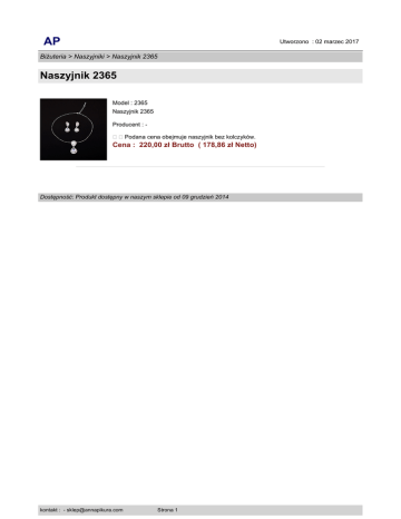 AP Utworzono : 02 marzec 2017 Biżuteria > Naszyjniki > Naszyjnik 2365 Naszyjnik 2365 Model : 2365 Naszyjnik 2365 Producent : ��Podana cena obejmuje naszyjnik bez kolczyków. Cena : 220,00 zł Brutto ( 178,86 zł Netto) Dostępność: Produkt dostępny w naszym sklepie od 09 grudzień 2014 kontakt : - [email protected] Strona 1