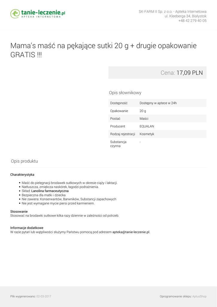 SK-FARM II Sp. z o.o. - Apteka Internetowa ul. Kleeberga 34, Białystok +48 42 279 40 05 Mama's maść na pękające sutki 20 g + drugie opakowanie GRATIS !!! Cena: 17,09 PLN Opis słownikowy Dostępność Dostępny w aptece w 24h Opakowanie 20 g Postać Maści Producent EQUALAN Rodzaj rejestracji Kosmetyk Substancja czynna - Opis produktu Charakterystyka Maść do pielęgnacji brodawek sutkowych w okresie ciąży i laktacji. Natłuszcza, zmiękcza naskórek, łagodzi podrażnienia. Skład: Lanolina farmaceutyczna Bezpieczna dla matki i dziecka Nie zawiera: Konserwantów, Barwników, Substancji zapachowych Nie jest wymagane mycie piersi przed karmieniem. Stosowanie Stosować na brodawki sutkowe kilka razy dziennie w zależności od potrzeb. Informacje dodatkowe W razie pytań lub wątpliwości służymy Państwu pomocą pod adresem [email protected]. Plik wygenerowano: 02-03-2017 Powered by TCPDF (www.tcpdf.org) Oprogramowanie sklepu: AptusShop