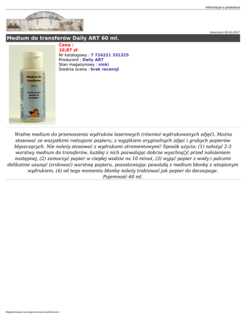 Informacje o produkcie Utworzono 02-03-2017 Medium do transferów Daily ART 60 ml. Cena : 10,87 zł Nr katalogowy : 7 724221 331325 Producent : Daily ART Stan magazynowy : niski Średnia ocena : brak recenzji Wodne medium do przenoszenia wydruków laserowych (również wydrukowanych zdjęć). Można stosować ze wszystkimi rodzajami papieru, z wyjątkiem oryginalnych zdjęć i grubych papierów błyszczących. Nie należy stosować z wydrukami atramentowymi! Sposób użycia: (1) nałożyć 2-3 warstwy medium do transferów, każdej z nich pozwalając dobrze wyschnąć przed nałożeniem następnej, (2) zamoczyć papier w ciepłej wodzie na 10 minut, (3) wyjąć papier z wody i palcami delikatnie usunąć (zrolować) warstwę papieru, pozostawiając powstałą z medium błonkę z wtopionym wydrukiem, (4) od tego momentu błonkę należy traktować jak papier do decoupage. Pojemność 60 ml. Wygenerowano w programie www.oscGold.com