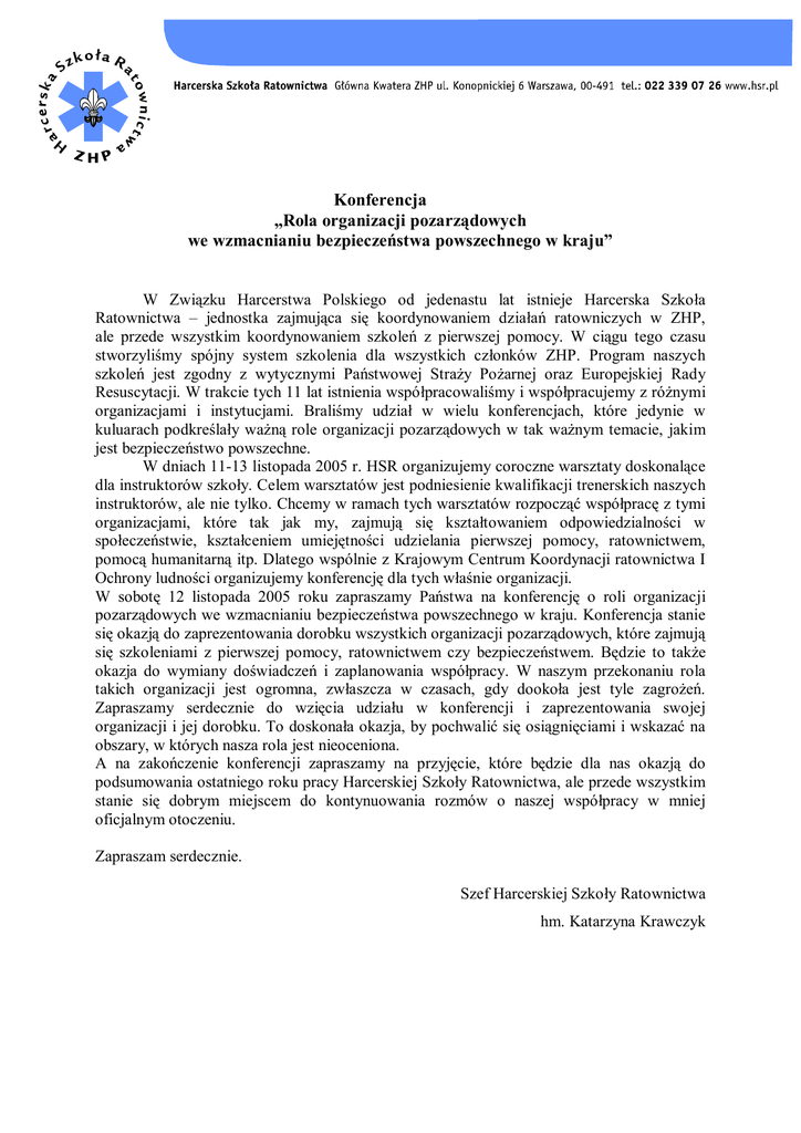 Konferencja „Rola organizacji pozarządowych we wzmacnianiu bezpieczeństwa powszechnego w kraju” W Związku Harcerstwa Polskiego od jedenastu lat istnieje Harcerska Szkoła Ratownictwa – jednostka zajmująca się koordynowaniem działań ratowniczych w ZHP, ale przede wszystkim koordynowaniem szkoleń z pierwszej pomocy. W ciągu tego czasu stworzyliśmy spójny system szkolenia dla wszystkich członków ZHP. Program naszych szkoleń jest zgodny z wytycznymi Państwowej Straży Pożarnej oraz Europejskiej Rady Resuscytacji. W trakcie tych 11 lat istnienia współpracowaliśmy i współpracujemy z różnymi organizacjami i instytucjami. Braliśmy udział w wielu konferencjach, które jedynie w kuluarach podkreślały ważną role organizacji pozarządowych w tak ważnym temacie, jakim jest bezpieczeństwo powszechne. W dniach 11-13 listopada 2005 r. HSR organizujemy coroczne warsztaty doskonalące dla instruktorów szkoły. Celem warsztatów jest podniesienie kwalifikacji trenerskich naszych instruktorów, ale nie tylko. Chcemy w ramach tych warsztatów rozpocząć współpracę z tymi organizacjami, które tak jak my, zajmują się kształtowaniem odpowiedzialności w społeczeństwie, kształceniem umiejętności udzielania pierwszej pomocy, ratownictwem, pomocą humanitarną itp. Dlatego wspólnie z Krajowym Centrum Koordynacji ratownictwa I Ochrony ludności organizujemy konferencję dla tych właśnie organizacji. W sobotę 12 listopada 2005 roku zapraszamy Państwa na konferencję o roli organizacji pozarządowych we wzmacnianiu bezpieczeństwa powszechnego w kraju. Konferencja stanie się okazją do zaprezentowania dorobku wszystkich organizacji pozarządowych, które zajmują się szkoleniami z pierwszej pomocy, ratownictwem czy bezpieczeństwem. Będzie to także okazja do wymiany doświadczeń i zaplanowania współpracy. W naszym przekonaniu rola takich organizacji jest ogromna, zwłaszcza w czasach, gdy dookoła jest tyle zagrożeń. Zapraszamy serdecznie do wzięcia udziału w konferencji i zaprezentowania swojej organizacji i jej dorobku. To doskonała okazja, by pochwalić się osiągnięciami i wskazać na obszary, w których nasza rola jest nieoceniona. A na zakończenie konferencji zapraszamy na przyjęcie, które będzie dla nas okazją do podsumowania ostatniego roku pracy Harcerskiej Szkoły Ratownictwa, ale przede wszystkim stanie się dobrym miejscem do kontynuowania rozmów o naszej współpracy w mniej oficjalnym otoczeniu. Zapraszam serdecznie. Szef Harcerskiej Szkoły Ratownictwa hm. Katarzyna Krawczyk Patronat honorowy Minister Zdrowia Minister Spraw Wewnętrznych i Administracji Komendant Główny Państwowej Straży Pożarnej Komendant Główny Policji Patronat medialny Przegląd Pożarniczy www.NGO.pl Organizatorzy Harcerska Szkoła Ratownictwa Związku Harcerstwa Polskiego Krajowe Centrum Koordynacji Ratownictwa i Ochrony Ludności Komendy Głównej Państwowej Straży Pożarnej Cele konferencji: - prezentacja dorobku organizacji pozarządowych w dziedzinie bezpieczeństwa powszechnego, - stworzenie propozycji współpracy organizacji pozarządowych w tym zakresie, oraz współpracy ze służbami i instytucjami państwowymi, - uświadomienie roli organizacji pozarządowych we wzmacnianiu bezpieczeństwa powszechnego. Termin: 12 listopada 2005 r. godz. 11.00 - 16.00 Miejsce: Warszawa, sala konferencyjna Szkoły Głównej Służby Pożarniczej, ul. Słowackiego 52/54 Zgłoszenia: do 4 listopada 2005 r. na załączonym formularzu. Prosimy również o wyrażenie wstępnej chęci udziału w konferencji do dnia 30 października 2005 Uczestnicy: Przedstawiciele służb i instytucji zajmujących się bezpieczeństwem., Przedstawiciele organizacji pozarządowych zajmujących się ratownictwem, bezpieczeństwem, pierwszą pomocą itp. Instruktorzy Harcerskiej Szkoły Ratownictwa, szefowie Harcerskich Grup Ratowniczych. Program konferencji 10.30 – 11.00 – rejestracja uczestników konferencji 11.00 – 11.05 - powitanie uczestników i gości konferencji 11.05 – 12.30 – Referaty wstępne: 1. Ministerstwo Spraw Wewnętrznych i Administracji Departament Bezpieczeństwa Powszechnego, Wydział Ochrony Ludności i Ratownictwa 2. Komenda Główna Państwowej Straży Pożarnej „Kierunki zmian w organizacji systemu ratowniczego w Polsce – rola organizacji pozarządowych” – zastępca Dyrektora Krajowego Centrum Koordynacji Ratownictwa i Ochrony Ludności KG PSP bryg. Dariusz Marczyński „Problematyka medycznych działań ratowniczych w zdarzeniach masowych” – Koordynator ratownictwa medycznego Komendy Wojewódzkiej PSP we Wrocławiu - lek.med. Wojciech Kopacki „Współpraca Komendanta Głównego PSP – Szefa Obrony Cywilnej Kraju z organizacjami pozarządowymi w zakresie realizacji programu Bezpieczne Życie” – Naczelnik Wydziału Obrony Cywilnej i Ochrony Ludności Biura Szkolenia KG PSP mgr Wiktor Zmysłowski 12.30 – 12.50 – przerwa 12.50 – 14.00 – prezentacje organizacji pozarządowych cz.1 1. Krajowy Sztab Ratownictwa Społecznej Sieci Ratunkowej, Jerzy Płóknarz, „Społeczna Krajowa Sieć Ratunkowa – jako uzupełnienie służb państwowych we wzmacnianiu bezpieczeństwa powszechnego w kraju” 2. Polski Czerwony Krzyż – Katarzyna Stępińska, „Ratownictwo i pierwsza pomoc w Polskim Czerwonym Krzyżu” 3. Fundacja „Świat dzieciom” – Serce na start – edukacyjny program udzielania pierwszej pomocy w sytuacjach zagrożenia dla dzieci i młodzieży (od 5 do 15 lat) a także dla ich nauczycieli i wychowawców – Katarzyna Szoch-Jedrys 4. Fundacja Wielka Orkiestra Świątecznej Pomocy – Jerzy Owsiak i Radosław Mysłek, „Program edukacyjny Fundacji WOŚP – uczymy ratować”, „Ogólnopolski program nauki pierwszej pomocy w ramach akcji 1% defibrylator” 5. Maltańska Służba Medyczna – prof. dr hab. Henryk Kubiak, „ 15 lat działalności Maltańskiej Służby Medycznej” 6. Harcerska Szkoła Ratownictw