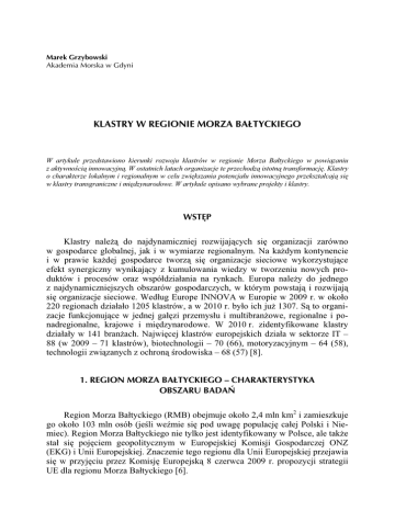 Marek Grzybowski Akademia Morska w Gdyni KLASTRY W REGIONIE MORZA BAŁTYCKIEGO W artykule przedstawiono kierunki rozwoju klastrów w regionie Morza Bałtyckiego w powiązaniu z aktywnością innowacyjną. W ostatnich latach organizacje te przechodzą istotną transformację. Klastry o charakterze lokalnym i regionalnym w celu zwiększania potencjału innowacyjnego przekształcają się w klastry transgraniczne i międzynarodowe. W artykule opisano wybrane projekty i klastry. WSTĘP Klastry należą do najdynamiczniej rozwijających się organizacji zarówno w gospodarce globalnej, jak i w wymiarze regionalnym. Na każdym kontynencie i w prawie każdej gospodarce tworzą się organizacje sieciowe wykorzystujące efekt synergiczny wynikający z kumulowania wiedzy w tworzeniu nowych produktów i procesów oraz współdziałania na rynkach. Europa należy do jednego z najdynamiczniejszych obszarów gospodarczych, w którym powstają i rozwijają się organizacje sieciowe. Według Europe INNOVA w Europie w 2009 r. w około 220 regionach działało 1205 klastrów, a w 2010 r. było ich już 1307. Są to organizacje funkcjonujące w jednej gałęzi przemysłu i multibranżowe, regionalne i ponadregionalne, krajowe i międzynarodowe. W 2010 r. zidentyfikowane klastry działały w 141 branżach. Najwięcej klastrów europejskich działa w sektorze IT – 88 (w 2009 – 71 klastrów), biotechnologii – 70 (66), motoryzacyjnym – 64 (58), technologii związanych z ochroną środowiska – 68 (57) [8]. 1. REGION MORZA BAŁTYCKIEGO – CHARAKTERYSTYKA OBSZARU BADAŃ Region Morza Bałtyckiego (RMB) obejmuje około 2,4 mln km2 i zamieszkuje go około 103 mln osób (jeśli weźmie się pod uwagę populację całej Polski i Niemiec). Region Morza Bałtyckiego nie tylko jest identyfikowany w Polsce, ale także stał się pojęciem geopolitycznym w Europejskiej Komisji Gospodarczej ONZ (EKG) i Unii Europejskiej. Znaczenie tego regionu dla Unii Europejskiej przejawia się w przyjęciu przez Komisję Europejską 8 czerwca 2009 r. propozycji strategii UE dla regionu Morza Bałtyckiego [6]. 32 ZESZYTY NAUKOWE AKADEMII MORSKIEJ W GDYNI, nr 72, luty 2012 W regionie Morza Bałtyckiego znajduje się osiem państw członkowskich UE, a jedynym państwem nienależącym do UE jest Rosja. Przyjmuje się, że tworzą go kraje skandynawskie (Dania, Finlandia, Norwegia, Szwecja), północne Niemcy (Meklemburgia-Pomorze Wschodnie, Szlezwig-Holsztyn oraz Hamburg), Polska (województwo pomorskie, warmińsko-mazurskie, zachodniopomorskie), państwa bałtyckie (Litwa, Łotwa, Estonia) oraz Rosja (obwód kalinigradzki i leningradzki). Region zróżnicowany jest zarówno pod względem politycznym, geograficznym, demograficznym, jak i gospodarczym. Kraje nordyckie, które zamieszkuje około 24 mln osób (41% populacji regionu), wytwarzają PKB o wartości około 800 mld euro, północno-wschodnie Niemcy, które zamieszkuje 6,3 mln osób (11% populacji regionu), wytwarzają około 174 mld euro PKB; w położonych nad Bałtykiem obwodach Rosji z PKB na poziomie 46 mld euro mieszka około 16 mln osób; w krajach nadbałtyckich 7,4 mln mieszkańców wytwarza PKB o wartości 34 mld euro; północne województwa Polski z populacją 5,4 mln wytwarzają około 24 mld euro PKB. Należące do tego regionu kraje funkcjonujące w Europejskim Obszarze Gospodarczym zajmują 46% powierzchni obszaru Unii Europejskiej, mieszka w nich 23% populacji UE i wytwarza się ponad 1600 mld euro [1]. W latach 1995–2004 PKB tego regionu wzrósł o 42,4%, a w latach 2005–2007 rósł rocznie średnio o 1–4,5%, by w latach 2008–2009 zmniejszyć dynamikę (w zależności od kraju) od 1,5% do 5,3% przy średnim spadku PKB w Unii Europejskiej latem 2009 r. o 4% [7]. W 2010 r. Europa bałtycka pod względem dynamiki PKB wypadała na tle Unii Europejskiej bardzo dobrze. W strefie euro PKB wzrósł w 2010 r. (w porównaniu do 2009 r.) o 1,7%, podczas gdy w całej Unii Europejskiej (EU27) osiągnął 1,8%; z kolei w 2009 r. odnotowano istotne spadki, odpowiednio: o 4,1% oraz 4,2% [15]. Wysoką dynamikę PKB krajów regionu Morza Bałtyckiego dobrze ilustrują dane z 4. kwartału 2010 r. W Polsce PKB w stosunku do 4. kwartału 2009 r. był wyższy o 3,9%, na Litwie wyniósł 4,6%, Łotwie – 3,7%, w Niemczech 4%, w Danii – 2,7%, ale w Estonii – 6,6%, Finlandii – 5%, a w Szwecji – 7,2%, przy średniej dla Unii Europejskiej 2,1% [15]. 2. INNOWACYJNOŚĆ PODSTAWĄ TWORZENIA KLASTRÓW Klastry najdynamiczniej rozwijają się w krajach i regionach o dużej aktywności innowacyjnej. Kraje regionu bałtyckiego cechują się wciąż istotnym zróżnicowaniem ze względu na aktywność innowacyjną. Kraje nordyckie oraz Niemcy wyraźnie wyróżniają się na tle Europy i świata, koncentrując się na rozwoju innowacji i gospodarek opartych na wiedzy. Polska i pozostałe kraje regionu wyraźnie odstają od dynamiki innowacyjnej przedsiębiorstw działających w krajach skandynawskich i Niemczech. Kraje nordyckie i Niemcy zajmują pozycję liderów, zarówno w tworzeniu rozwiązań innowacyjnych, jak i w rozwoju przedsiębiorczości opartego na nowych technologiach i wiedzy według autorów opublikowanego na początku 2010 r. raportu European Innovation Scoreboard 2009 [9]. Natomiast Estonia zaliczona została do „naśladowców” (krajów, których wartość wskaźnika jest prawie równa bądź wyższa od średniej), a Polska i Litwa do „umiarkowanych” M. Grzybowski, Klastry w regionie Morza Bałtyckiego 33 innowatorów (państwa o wartości poniżej średniej w Unii Europejskiej) [12]. To lepszy wynik niż przed rokiem, kiedy kraje regionu bałtyckiego w 2008 r. zaliczono do grupy „pościgowej” (w której została Łotwa) podążającej za państwami o „umiarkowanej” innowacyjności. Aby zilustrować stan „rozwarstwienia innowacyjnego” w Europie Bałtyckiej, trzeba wyjaśnić, że w ramach European Innovation Scoreboard dokonuje się analiz