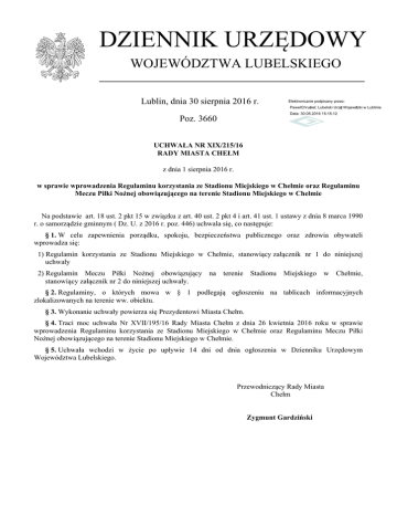 DZIENNIK URZĘDOWY WOJEWÓDZTWA LUBELSKIEGO Lublin, dnia 30 sierpnia 2016 r. Elektronicznie podpisany przez: Paweł Chruściel; Lubelski Urząd Wojewódzki w Lublinie Data: 30.08.2016 15:15:12 Poz. 3660 UCHWAŁA NR XIX/215/16 RADY MIASTA CHEŁM z dnia 1 sierpnia 2016 r. w sprawie wprowadzenia Regulaminu korzystania ze Stadionu Miejskiego w Chełmie oraz Regulaminu Meczu Piłki Nożnej obowiązującego na terenie Stadionu Miejskiego w Chełmie Na podstawie art. 18 ust. 2 pkt 15 w związku z art. 40 ust. 2 pkt 4 i art. 41 ust. 1 ustawy z dnia 8 marca 1990 r. o samorządzie gminnym ( Dz. U. z 2016 r. poz. 446) uchwala się, co następuje: § 1. W celu zapewnienia porządku, spokoju, bezpieczeństwa publicznego oraz zdrowia obywateli wprowadza się: 1) Regulamin korzystania ze Stadionu Miejskiego w Chełmie, stanowiący załącznik nr 1 do niniejszej uchwały 2) Regulamin Meczu Piłki Nożnej obowiązujący na terenie Stadionu Miejskiego w Chełmie, stanowiący załącznik nr 2 do niniejszej uchwały. § 2. Regulaminy, o których mowa w § 1 podlegają ogłoszeniu na tablicach informacyjnych zlokalizowanych na terenie ww. obiektu. § 3. Wykonanie uchwały powierza się Prezydentowi Miasta Chełm. § 4. Traci moc uchwała Nr XVII/195/16 Rady Miasta Chełm z dnia 26 kwietnia 2016 roku w sprawie wprowadzenia Regulaminu korzystania ze Stadionu Miejskiego w Chełmie oraz Regulaminu Meczu Piłki Nożnej obowiązującego na terenie Stadionu Miejskiego w Chełmie. § 5. Uchwała wchodzi w życie po upływie 14 dni od dnia ogłoszenia w Dzienniku Urzędowym Województwa Lubelskiego. Przewodniczący Rady Miasta Chełm Zygmunt Gardziński Dziennik Urzędowy Województwa Lubelskiego –2– Poz. 3660 Załącznik Nr 1 do Uchwały Nr XIX/215/16 Rady Miasta Chełm z dnia 01.08.2016 r. Regulamin Stadionu Miejskiego w Chełmie ul. I Pułku Szwoleżerów 15A 1. Administratorem Stadionu Miejskiego w Chełmie jest Miejski Ośrodek Sportu i Rekreacji w Chełmie, ul. Graniczna 2A, 22-100 Chełm, tel/fax 082/563 00 03. 2. Do korzystania z obiektu uprawnione są wyłącznie grupy zorganizowane i osoby indywidualne, które uzyskały zgodę administratora i zapoznały się z regulaminem. 3. Kluby sportowe oraz grupy zorganizowane prowadzą zajęcia pod kierunkiem trenera, instruktora lub innej osoby odpowiedzialnej za grupę. 4. Za bezpieczeństwo osób i przedmiotów stanowiących własność wynajmującego MOSiR w Chełmie nie ponosi odpowiedzialności. 5. Osoby niepełnoletnie, przebywające na terenie obiektu, pozostają pod opieką dorosłych. 6. Korzystający ze stadionu ponoszą odpowiedzialność materialną za wyrządzone zniszczenia obiektu (sprzęt sportowy, szatnie, trybuny dla kibiców i inne wykorzystywane pomieszczenia). 7. O ewentualnych szkodach korzystający zobowiązani są poinformować administratora obiektu. 8. W czasie meczu piłki nożnej na terenie całego obiektu obowiązuje całkowity zakaz: wnoszenia i spożywania napojów alkoholowych i środków odurzających, wprowadzania zwierząt i poruszania się pojazdami. 9. Wszystkie osoby przebywające na terenie obiektu zobowiązane są do podporządkowania się poleceniom pracowników stadionu, służb porządkowych i innych osób reprezentujących administratora. 10. Osoby zakłócające porządek będą zmuszone do opuszczenia obiektu. 1/3 Dziennik Urzędowy Województwa Lubelskiego –3– Poz. 3660 Przepisy szczegółowe dotyczące przebywania na obiekcie 1. W czasie trwania rozgrywek piłkarskich i imprez sportowo - rekreacyjnych należy podporządkować się następującym zasadom: a) przebywać na obiekcie oraz korzystać z urządzeń Stadionu mogą tylko osoby posiadające przy sobie ważną kartę wstępu lub inny dowód uprawniający do przebywania na obiekcie, ww. dokumenty należy okazywać na żądanie służb porządkowych lub policji, b) każdy jest zobowiązany przy wejściu na stadion bez wezwania okazać służbie porządkowej swoją kartę wstępu lub dowód uprawniający do wstępu i na żądanie okazać do sprawdzenia, c) służba porządkowa jest uprawniona do sprawdzenia osób – również przy użyciu środków technicznych – w celu stwierdzenia, czy nie stanowią one zagrożenia bezpieczeństwa z powodu stosowania środków odurzających lub wskutek wnoszenia broni i innych przedmiotów niebezpiecznych, d) osoby, które nie posiadają kart wstępu i stwarzające ryzyko wywołania zamieszek nie będą wpuszczane na stadion. 2. Przebywający na stadionie zobowiązani są do stosowania się do zarządzeń policji, straży pożarnej, służby porządkowej oraz zaleceń spikera stadionu. 3. Na stadionie sportowym obowiązują następujące zakazy: a) zastawiania wejść, wyjść oraz dróg ewakuacyjnych, b) wnoszenia na stadion następujących przedmiotów: - broni wszelkiego rodzaju i przedmiotów, które mogą być użyte jako środek przymusu, - pojemników do rozpylania gazów, substancji żrących lub farbujących, butelek, dzbanków lub puszek, wykonanych z kruchego lub szczególnie twardego materiału, - przedmiotów o dużych rozmiarach, - fajerwerków, kul świecących i innych przedmiotów pirotechnicznych, - drzewców do flag i transparentów, c) wchodzenia lub przechodzenia przez fasady, płoty, ogrodzenia boiska, urządzenia oświetleniowe, drzewa, maszty, wchodzenia na obszary, które nie są dopuszczone dla widzów pomieszczenia służbowe), (np. boisko, pomieszczenia wewnętrzne, 2/3 Dziennik Urzędowy Województwa Lubelskiego –4– Poz. 3660 d) rzucania wszelkimi przedmiotami, rozniecania ognia, zapalania fajerwerków, sprzedawania towarów i kart wstępu bez zezwolenia, rozdawania druków i przeprowadzania zbiórek, e) pisania na budowlach, urządzeniach, ich malowania i naklejania, f) zaśmiecania stadionu. 4. Osoby naruszające zasady bezpieczeństwa i porządku na stadionie będą pociągnięte do odpowiedzialności karno – administracyjnej. 3/3 Dziennik Urzędowy Województwa Lubelskiego –5– 