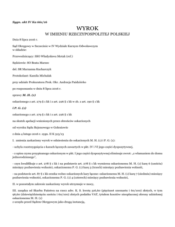 Sygn. akt IV Ka 661/16 WYROK W IMIENIU RZECZYPOSPOLITEJ POLSKIEJ Dnia 8 lipca 2016 r. Sąd Okręgowy w Szczecinie w IV Wydziale Karnym Odwoławczym w składzie: Przewodniczący: SSO Władysława Motak (ref.) Sędziowie: SO Beata Marzec del. SR Marzanna Kucharczyk Protokolant: Kamila Michalak przy udziale Prokuratora Prok. Okr. Andrzeja Paździórko po rozpoznaniu w dniu 8 lipca 2016 r. sprawy M. H. (1) oskarżonego z art. 279 § 1 kk i z art. 226 § 1 kk w zb. z art. 190 § 1 kk i P. G. (1) oskarżonego z art. 279 § 1 kk i z art. 226 § 1 kk na skutek apelacji wniesionych przez obrońców oskarżonych od wyroku Sądu Rejonowego w Goleniowie z dnia 4 lutego 2016 r. sygn. II K 313/13 I. zmienia zaskarżony wyrok w odniesieniu do oskarżonych M. H. (1) i P. G. (1): - uchyla rozstrzygnięcia o karach łącznych zawartych w pkt. IV i VI jego części dyspozytywnej, - z opisu czynu przypisanego oskarżonym w pkt. I jego części dyspozytywnej eliminuje zwrot: „z włamaniem do domu jednorodzinnego”, - czyn kwalifikuje z art. 278 § 1 kk i na podstawie art. 278 § 1 kk wymierza oskarżonemu M. H. (1) karę 6 (sześciu) miesięcy pozbawienia wolności, oskarżonemu P. G. (1) karę 3 (trzech) miesięcy pozbawienia wolność, - na podstawie art. 87 § 1 kk orzeka wobec oskarżonych kary łączne: oskarżonemu M. H. (1) karę 7 (siedmiu) miesięcy pozbawienia wolności, oskarżonemu P. G. (1) 4 (czterech) miesięcy pozbawienia wolności, II. w pozostałym zakresie zaskarżony wyrok utrzymuje w mocy, III. zasądza od Skarbu Państwa na rzecz adw. K. S. kwotę 516,60 (pięciuset szesnastu i 60/100) złotych, w tym 96,60 (dziewięćdziesięciu sześciu i 60/100) złotych podatku VAT, tytułem kosztów nieopłaconej obrony udzielonej oskarżonemu M. H. (1) z urzędu przed Sądem Okręgowym jako drugą instancją, IV. zasądza od oskarżonych na rzecz Skarbu Państwa wydatki za postępowanie odwoławcze po ½ części i wymierza im opłatę za obie instancje: - oskarżonemu M. H. (1) w kwocie 180 (stu osiemdziesięciu) złotych, - oskarżonemu P. G. (1) w kwocie 120 (stu dwudziestu) złotych. del. SR M. K. SSO Władysława Motak SSO Beata Marzec IV Ka 661/16 UZASADNIENIE Sąd Rejonowy w Goleniowie wyrokiem z dnia 4 lutego 2016r. uznał oskarżonego P. G. (1) i M. H. (1) za winnych popełnienia czynów z art.279§1kk i art.226§1kk w zw. art.12 kk, a oskarżonego M. H. (1) także z art.190§1 kk, ( karta 686 – 688 akt ). Rozstrzygnięcie Sądu I instancji zaskarżył obrońca oskarżonego P. G. (1) oraz obrońca oskarżonego M. H. (1). Obrońca oskarżonego zakwestionował wyrok w całości. ( karta 719-720 akt). Rozstrzygnięcie Sądu Rejonowego zaskarżył w całości obrońca oskarżonego. ( karta 742-745) Sąd Okręgowy zważył, co następuje: Apelacja obrońców oskarżonego okazała się częściowo zasadna. Z uwagi na tożsamość stawianych apelacjami zarzutów i wniosków, Sąd odwoławczy postanowił łącznie ustosunkować się do wywiedzionych przez obrońców apelacji. W pierwszej kolejności stwierdzić należy, iż Sąd orzekający zgromadził w sprawie w sposób prawidłowy wszystkie niezbędne dowody które pozwoliły mu na ustalenie stanu faktycznego, zarówno odnoszącego się do inkryminowanego zdarzenia w dniu 22 sierpnia 2012r. jak zdarzenia w dniu 19 października 2012r. Dokonując oceny prawnej zajścia które miało miejsce w dniu 22 sierpnia 2012r. Sąd I instancji uznał, iż oskarżeni wespół z pozostałym oskarżonym dopuścili się popełnienia przestępstwa kradzieży z włamaniem do domu mieszkalnego. Zaprezentowana przez Sąd I instancji ocena prawna działań oskarżonych nie znajduje akceptacji Sądu odwoławczego. Oskarżeni pojechali w miejsce zamieszkania M. W. (1) wespół z M. S. (1) w godzinach południowych. W wyjaśnieniach wszystkich oskarżonych, w ocenie Sądu II instancji konsekwentnych, powodem udania się do domu M. W. (1) było odebranie od niego pożyczki. Czy pożyczka faktycznie istniała wiedział tylko M. S.. Oskarżeni mogli nie mieć wiedzy w tym zakresie. Bazowali na informacji przedstawionej przez M. S.. Po przyjeździe pod dom M. W. oskarżeni zachowywali się na głośno, przemieszczali się po posesji, swoją obecnością, zainteresowali sąsiadkę państwa W. świadka G. G. która miała możliwość obserwacji nie krytego zachowania oskarżonych, słyszała kierowane do M. W. (1) słowa obelżywe. Zatem, z ich zachowania, jak słusznie dostrzegają Autorzy apelacji, nie wynika aby w jakikolwiek sposób chcieli ukryć swój cel przyjazdu. Zatem, dać wiarę należy oskarżonym, iż powodem ich przybycia w miejsce zamieszkania M. W. było udzielenie pomocy M. S. w odebraniu od pokrzywdzonego pożyczki. Brak jest podstaw do podważania wyjaśnień oskarżonych w tym zakresie. Samo twierdzenie M. W. że pieniędzy nie pożyczał nie zmienia faktu, że oskarżeni wiedzeni tym zamiarem przyjechali w miejsce zamieszkania M. W.. Za wersją oskarżonych przemawia zdarzenie które miało miejsce dzień przed inkryminowanym zajściem, kiedy to oskarżeni również przybyli w to samo miejsce i podjęli nieudana próba odebrania owej pożyczki. Oskarżeni do domu M. W. dostali się wykorzystując uchylone okno. W pierwszej kolejności, co sam ustala Sąd Rejonowy, rozpoczęli penetrację domu w celu odnalezienia M. W.. Takie zachowanie potwierdza wersję oskarżonych, że cel ich wizyty nie wiązał się z zaborem mienia, lecz zamiarem ich było spotkanie z M. W., a w konsekwencji odebranie od niego pieniędzy udzielonych mu tytułem pożyczki. Będąc już w mieszkaniu, po bezskutecznym odnalezieniu M. W. dopiero wówczas zrodził się u oskarżonych zamiar zaboru przedmiotów tam znajdujących się, które później sprzedali rekompensując częściowo kwotę pożyczki. Powyższe zachowanie oskarżonych nie wyczerpuje, jak trafnie podnoszą skarżący, ustawowych znamion przestępstwa kradzieży z włamaniem. Z przestępstwem kradzieży z wła