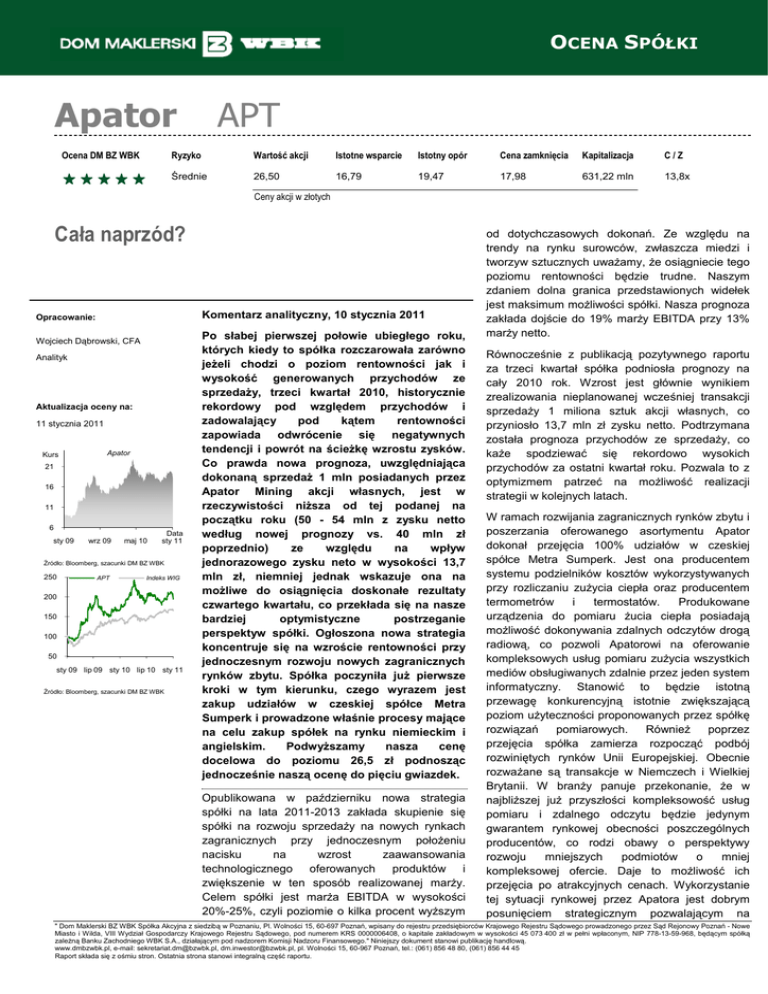 OCENA SPÓŁKI Apator Ocena DM BZ WBK APT Ryzyko Wartość akcji Istotne wsparcie Istotny opór Cena zamknięcia Kapitalizacja C/Z Średnie 26,50 16,79 19,47 17,98 631,22 mln 13,8x Ceny akcji w złotych Cała naprzód? Komentarz analityczny, 10 stycznia 2011 Opracowanie: Wojciech Dąbrowski, CFA Analityk Aktualizacja oceny na: 11 stycznia 2011 Kurs Apator 21 16 11 6 sty 09 wrz 09 maj 10 Data sty 11 Źródło: Bloomberg, szacunki DM BZ WBK 250 APT Indeks WIG 200 150 100 50 sty 09 lip 09 sty 10 lip 10 sty 11 Źródło: Bloomberg, szacunki DM BZ WBK Po słabej pierwszej połowie ubiegłego roku, których kiedy to spółka rozczarowała zarówno jeŜeli chodzi o poziom rentowności jak i wysokość generowanych przychodów ze sprzedaŜy, trzeci kwartał 2010, historycznie rekordowy pod względem przychodów i zadowalający pod kątem rentowności zapowiada odwrócenie się negatywnych tendencji i powrót na ścieŜkę wzrostu zysków. Co prawda nowa prognoza, uwzględniająca dokonaną sprzedaŜ 1 mln posiadanych przez Apator Mining akcji własnych, jest w rzeczywistości niŜsza od tej podanej na początku roku (50 - 54 mln z zysku netto według nowej prognozy vs. 40 mln zł poprzednio) ze względu na wpływ jednorazowego zysku neto w wysokości 13,7 mln zł, niemniej jednak wskazuje ona na moŜliwe do osiągnięcia doskonałe rezultaty czwartego kwartału, co przekłada się na nasze bardziej optymistyczne postrzeganie perspektyw spółki. Ogłoszona nowa strategia koncentruje się na wzroście rentowności przy jednoczesnym rozwoju nowych zagranicznych rynków zbytu. Spółka poczyniła juŜ pierwsze kroki w tym kierunku, czego wyrazem jest zakup udziałów w czeskiej spółce Metra Sumperk i prowadzone właśnie procesy mające na celu zakup spółek na rynku niemieckim i angielskim. PodwyŜszamy nasza cenę docelowa do poziomu 26,5 zł podnosząc jednocześnie naszą ocenę do pięciu gwiazdek. Opublikowana w październiku nowa strategia spółki na lata 2011-2013 zakłada skupienie się spółki na rozwoju sprzedaŜy na nowych rynkach zagranicznych przy jednoczesnym połoŜeniu nacisku na wzrost zaawansowania technologicznego oferowanych produktów i zwiększenie w ten sposób realizowanej marŜy. Celem spółki jest marŜa EBITDA w wysokości 20%-25%, czyli poziomie o kilka procent wyŜszym od dotychczasowych dokonań. Ze względu na trendy na rynku surowców, zwłaszcza miedzi i tworzyw sztucznych uwaŜamy, Ŝe osiągniecie tego poziomu rentowności będzie trudne. Naszym zdaniem dolna granica przedstawionych widełek jest maksimum moŜliwości spółki. Nasza prognoza zakłada dojście do 19% marŜy EBITDA przy 13% marŜy netto. Równocześnie z publikacją pozytywnego raportu za trzeci kwartał spółka podniosła prognozy na cały 2010 rok. Wzrost jest głównie wynikiem zrealizowania nieplanowanej wcześniej transakcji sprzedaŜy 1 miliona sztuk akcji własnych, co przyniosło 13,7 mln zł zysku netto. Podtrzymana została prognoza przychodów ze sprzedaŜy, co kaŜe spodziewać się rekordowo wysokich przychodów za ostatni kwartał roku. Pozwala to z optymizmem patrzeć na moŜliwość realizacji strategii w kolejnych latach. W ramach rozwijania zagranicznych rynków zbytu i poszerzania oferowanego asortymentu Apator dokonał przejęcia 100% udziałów w czeskiej spółce Metra Sumperk. Jest ona producentem systemu podzielników kosztów wykorzystywanych przy rozliczaniu zuŜycia ciepła oraz producentem termometrów i termostatów. Produkowane urządzenia do pomiaru Ŝucia ciepła posiadają moŜliwość dokonywania zdalnych odczytów drogą radiową, co pozwoli Apatorowi na oferowanie kompleksowych usług pomiaru zuŜycia wszystkich mediów obsługiwanych zdalnie przez jeden system informatyczny. Stanowić to będzie istotną przewagę konkurencyjną istotnie zwiększającą poziom uŜyteczności proponowanych przez spółkę rozwiązań pomiarowych. RównieŜ poprzez przejęcia spółka zamierza rozpocząć podbój rozwiniętych rynków Unii Europejskiej. Obecnie rozwaŜane są transakcje w Niemczech i Wielkiej Brytanii. W branŜy panuje przekonanie, Ŝe w najbliŜszej juŜ przyszłości kompleksowość usług pomiaru i zdalnego odczytu będzie jedynym gwarantem rynkowej obecności poszczególnych producentów, co rodzi obawy o perspektywy rozwoju mniejszych podmiotów o mniej kompleksowej ofercie. Daje to moŜliwość ich przejęcia po atrakcyjnych cenach. Wykorzystanie tej sytuacji rynkowej przez Apatora jest dobrym posunięciem strategicznym pozwalającym na " Dom Maklerski BZ WBK Spółka Akcyjna z siedzibą w Poznaniu, Pl. Wolności 15, 60-697 Poznań, wpisany do rejestru przedsiębiorców Krajowego Rejestru Sądowego prowadzonego przez Sąd Rejonowy Poznań - Nowe Miasto i Wilda, VIII Wydział Gospodarczy Krajowego Rejestru Sądowego, pod numerem KRS 0000006408, o kapitale zakładowym w wysokości 45 073 400 zł w pełni wpłaconym, NIP 778-13-59-968, będącym spółką zaleŜną Banku Zachodniego WBK S.A., działającym pod nadzorem Komisji Nadzoru Finansowego." Niniejszy dokument stanowi publikację handlową. www.dmbzwbk.pl, e-mail: [email protected], [email protected], pl. Wolności 15, 60-967 Poznań, tel.: (061) 856 48 80, (061) 856 44 45 Raport składa się z ośmiu stron. Ostatnia strona stanowi integralną część raportu. Apator Ocena DM BZ WBK APT Ryzyko Wartość akcji Istotne wsparcie Istotny opór Cena zamknięcia Kapitalizacja C/Z Średnie 26,50 16,79 19,47 17,98 631,22 mln 13,8x Ceny akcji w złotych względnie nisko kosztowe wejście na nowe rynki zbytu. Bardziej odległym w czasie posunięciem rozwojowym (planowanym na rok 2012) jest przeniesienie toruńskiego zakładu na teren specjalnej strefy ekonomicznej. Koszt inwestycji szacowany na kwotę około 40-45 mln zł sfinansowany zostanie w duŜej mierze z wpływów ze sprzedaŜy nieruchomości na której obecnie znajduje się zakład produkcyjny. W ramach SSE spółka powinna uzyskać ulgę podatkow