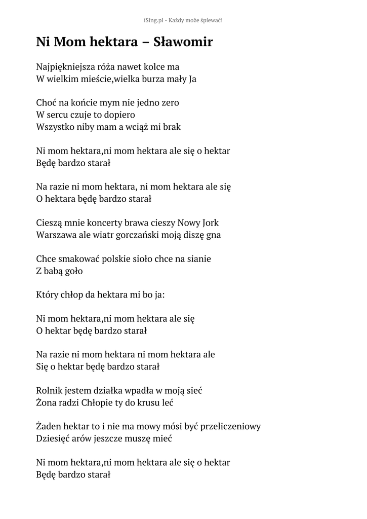 iSing.pl - Każdy może śpiewać! Ni Mom hektara – Sławomir Najpiękniejsza róża nawet kolce ma W wielkim mieście,wielka burza mały Ja Choć na końcie mym nie jedno zero W sercu czuje to dopiero Wszystko niby mam a wciąż mi brak Ni mom hektara,ni mom hektara ale się o hektar Będę bardzo starał Na razie ni mom hektara, ni mom hektara ale się O hektara będę bardzo starał Cieszą mnie koncerty brawa cieszy Nowy Jork Warszawa ale wiatr gorczański moją diszę gna Chce smakować polskie sioło chce na sianie Z babą goło Który chłop da hektara mi bo ja: Ni mom hektara,ni mom hektara ale się O hektar będę bardzo starał Na razie ni mom hektara ni mom hektara ale Się o hektar będę bardzo starał Rolnik jestem działka wpadła w moją sieć Żona radzi Chłopie ty do krusu leć Żaden hektar to i nie ma mowy mósi być przeliczeniowy Dziesięć arów jeszcze muszę mieć Ni mom hektara,ni mom hektara ale się o hektar Będę bardzo starał Ni mom hektara,ni mom hektara ale się o hektar Będę bardzo starał Z przeliczeniem hektar przepadł no i cześć I do kogo tera zażalenie wnieść Bięgnę rano do Kościoła i do Boga głośno Wołam A z modlitwy mej wypływa taka treść: Cześć tu ( swoje imie) Panie boże dziękuję ci za siły Za to że jestem urodziwy Za golfa trójkę A Adam to miał cały Eden do dyspozycji A ja: Ni mom hektara ni mom hektara, ale sie o hektar Bede bardzo staral Ni mom hektara,ni mom hektara ale sie o hektar bede Bardzo staral Ni mom hektara,ni mom hektara ale sie o hektar Bede bardzo staral Ni mom hektara ni mom hektara ale sie o hektar Bardyo staral Słowa: brak danych Muzyka: brak danych Rok wydania: brak danych Płyta: brak danych