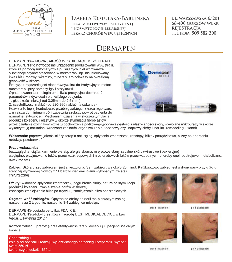 DERMAPEN® – NOWA JAKOŚĆ W ZABIEGACH MEZOTERAPII. DERMAPEN® to nowoczesne urządzenie produkowane w Australii, które za pomocą automatycznie pulsujących igieł wprowadza substancje czynne stosowane w mezoterapii np. nieusieciowany kwas hialuronowy, witaminy, minerały, aminokwasy na określoną głębokość w skórze. Precyzja urządzenia jest nieporównywalna do tradycyjnych metod mezoterapii przy pomocy igły i strzykawki. Opatentowana technologia umożliwia precyzyjne dobranie 2 parametrów indywidualnie u każdego pacjenta: 1. głębokości iniekcji (od 0,25mm do 2,5 mm ) 2. częstotliwości nakłuć (od 220-990 nakłuć na sekundę) Pozwala to lepiej kontrolować przebieg zabiegu, skraca jego czas, zmniejsza do minimum ból i zapewnia szybszy powrót pacjenta do normalnej aktywności. Mechanizm działania w skórze:stymulacja produkcji kolagenu i elastyny w skórze,stymulacja fibroblastów przez działanie czynników wzrostu pochodzenia płytkowego,poprawa gęstości i elastyczności skóry, wywołane mikrourazy w skórze wykorzystują naturalne ,wrodzone zdolności organizmu do autoodnowy czyli naprawy skóry i indukcji remodelingu tkanek. Wskazania: poprawa jakości skóry, terapia anti-aging, spłycenie zmarszczek, rozstępy, blizny potrądzikowe, blizny po oparzeniu redukcja przebarwień Przeciwskazania: bezwzględne: ciąża, karmienie piersią, alergia skórna, miejscowe stany zapalne skóry (wirusowe i bakteryjne) względne: przyjmowanie leków przeciwzakrzepowych i niesterydowych leków przeciwzapalnych, choroby ogólnoustrojowe: metaboliczne, nowotworowe Zabieg: Skóra przed zabiegiem jest znieczulona. Sam zabieg trwa około 20 minut. Każdorazowo zabieg jest wykonywany przy użyciu sterylnej wymiennej głowicy z 11 bardzo cienkimi igłami wykonanymi ze stali chirurgicznej. Efekty: widoczne spłycenie zmarszczek, pogrubienie skóry, naturalna stymulacja produkcji kolagenu, zmniejszenie porów w skórze, znaczące zmniejszenie blizn po trądziku, zmniejszenie blizn oparzeniowych. Częstotliwość zabiegów: Optymalne efekty po serii :po pierwszym zabiegu następny za 2 tygodnie, następnie 3-4 zabiegi co miesiąc. DERMAPEN® posiada certyfikat FDA i CE. DERMAPEN® zdobył prestiżową nagrodę BEST MEDICAL DEVICE w Las Vegas w kwietniu 2012 r. Komfort zabiegu, precyzję oraz efektywność terapii docenili już pacjenci na całym świecie. Cena zabiegu: zależy od obszaru i rodzaju wykorzystanego do zabiegu preparatu i wynosi: twarz 550 zł twarz, szyja, dekolt - 650 zł