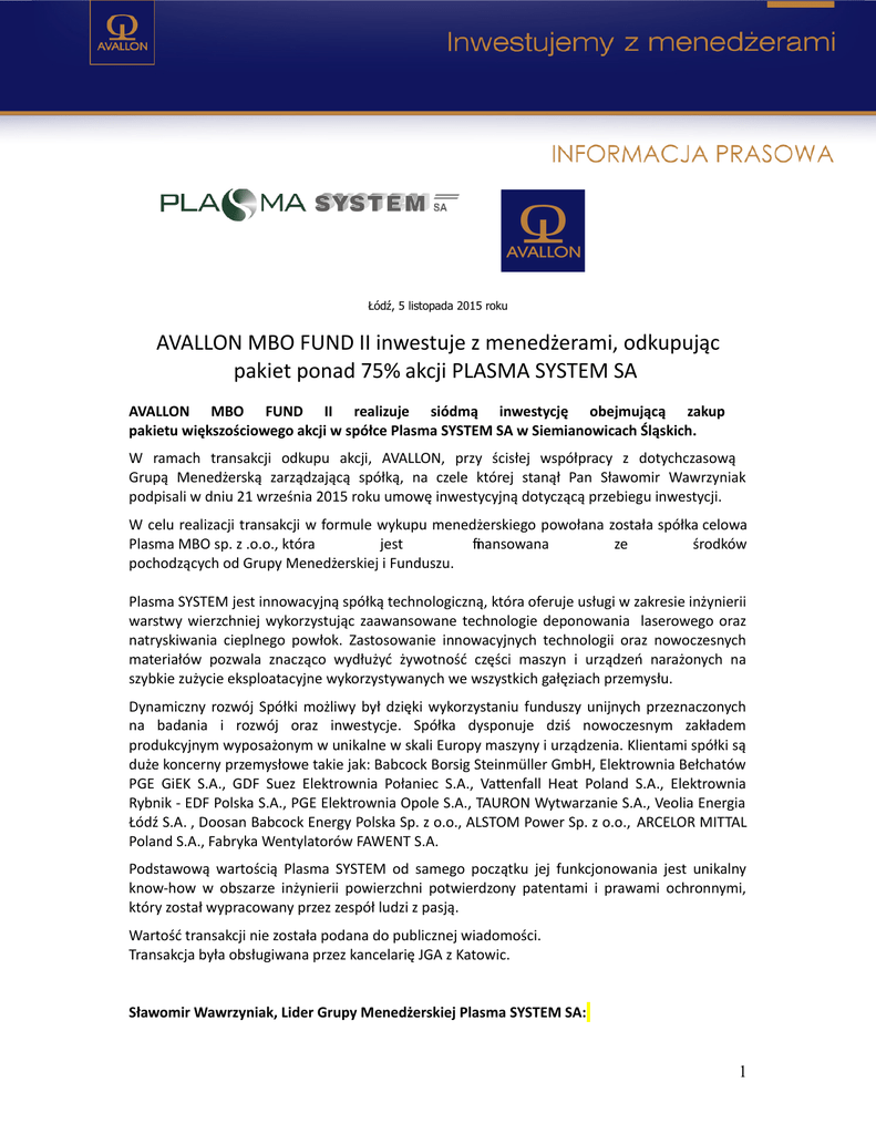 Łódź, 5 listopada 2015 roku AVALLON MBO FUND II inwestuje z menedżerami, odkupując pakiet ponad 75% akcji PLASMA SYSTEM SA AVALLON MBO FUND II realizuje siódmą inwestycję obejmującą zakup pakietu większościowego akcji w spółce Plasma SYSTEM SA w Siemianowicach Śląskich. W ramach transakcji odkupu akcji, AVALLON, przy ścisłej współpracy z dotychczasową Grupą Menedżerską zarządzającą spółką, na czele której stanął Pan Sławomir Wawrzyniak podpisali w dniu 21 września 2015 roku umowę inwestycyjną dotyczącą przebiegu inwestycji. W celu realizacji transakcji w formule wykupu menedżerskiego powołana została spółka celowa Plasma MBO sp. z .o.o., która jest fnansowana ze środków pochodzących od Grupy Menedżerskiej i Funduszu. Plasma SYSTEM jest innowacyjną spółką technologiczną, która oferuje usługi w zakresie inżynierii warstwy wierzchniej wykorzystując zaawansowane technologie deponowania laserowego oraz natryskiwania cieplnego powłok. Zastosowanie innowacyjnych technologii oraz nowoczesnych materiałów pozwala znacząco wydłużyć żywotność części maszyn i urządzeń narażonych na szybkie zużycie eksploatacyjne wykorzystywanych we wszystkich gałęziach przemysłu. Dynamiczny rozwój Spółki możliwy był dzięki wykorzystaniu funduszy unijnych przeznaczonych na badania i rozwój oraz inwestycje. Spółka dysponuje dziś nowoczesnym zakładem produkcyjnym wyposażonym w unikalne w skali Europy maszyny i urządzenia. Klientami spółki są duże koncerny przemysłowe takie jak: Babcock Borsig Steinmüller GmbH, Elektrownia Bełchatów PGE GiEK S.A., GDF Suez Elektrownia Połaniec S.A., Vatenfall Heat Poland S.A., Elektrownia Rybnik - EDF Polska S.A., PGE Elektrownia Opole S.A., TAURON Wytwarzanie S.A., Veolia Energia Łódź S.A. , Doosan Babcock Energy Polska Sp. z o.o., ALSTOM Power Sp. z o.o., ARCELOR MITTAL Poland S.A., Fabryka Wentylatorów FAWENT S.A. Podstawową wartością Plasma SYSTEM od samego początku jej funkcjonowania jest unikalny know-how w obszarze inżynierii powierzchni potwierdzony patentami i prawami ochronnymi, który został wypracowany przez zespół ludzi z pasją. Wartość transakcji nie została podana do publicznej wiadomości. Transakcja była obsługiwana przez kancelarię JGA z Katowic. Sławomir Wawrzyniak, Lider Grupy Menedżerskiej Plasma SYSTEM SA: 1 Dotychczasowy intensywny rozwój Spółki był możliwy dzięki efektywnemu wykorzystaniu środków unijnych w ramach Programu Operacyjnego Innowacyjna Gospodarka oraz funduszy pozyskanych od inwestorów na rynku NewConnect. Szans na dalszy rozwój Spółki Zarząd upatruje w ekspansji na rynki zagraniczne i w tym zakresie pożądane było pozyskanie przyjaznego inwestora - partnera. Poszukiwania trwały już od kilku lat, ale dopiero zderzenie inicjatywy Grupy Menedżerskiej w zakresie kapitałowego zaangażowania się w Spółkę z zamiarem wyjścia z akcjonariatu poprzedniego właściciela - spółki SYSTEM SA dało efekt w postaci MBO. Czynnikiem, który skłonił menedżerów do wyboru procedury MBO jest przekonanie o wartości Spółki oraz wiara w dalszy jej rozwój. Fundusz AVALLON spełnił oczekiwania Zarządu – najlepiej spośród zainteresowanych inwestorów zrozumiał specyfkę Spółki a dzięki przedsiębiorstwom znajdującym się już w jego portelu inwestycyjnym umożliwi poszerzenie krajowych i zagranicznych rynków zbytu. Efekt synergii, jak również wysoka kultura i profesjonalizm przedstawicieli Funduszu AVALLON zdecydowały o jego wyborze. Aleksander Borek, Prezes Zarządu SYSTEM SA: Głównym impulsem do podjęcia decyzji o poszukiwaniu inwestora dla Spółki było przekonanie, że dalszy jej rozwój wymaga silnego i kompetentnego partnera, który będzie nastawiony na ścisłą współpracę z kluczową kadrą menedżerską, dzięki której Spółka zbudowała swoją dotychczasową pozycję. Znalezienie odpowiedniego inwestora dla frmy jest procesem długotrwałym i skomplikowanym, dlatego warto do niego dobrze się przygotować i zawczasu go zaplanować. Istotnymi elementami takiego procesu jest właściwe zaplanowanie działalności operacyjnej i fnansów frmy oraz zgromadzenie wysoko wykwalifkowanej i kompetentnej kadry, która silnie utożsamia się z celami Spółki. Dla osoby, która od początku istnienia frmy była silnie zaangażowana, także emocjonalnie, w powodzenie unikalnego projektu jakim jest Plasma SYSTEM istotnym była nie tylko maksymalizacja wartości transakcji, ale przekonanie o przekazaniu Spółki odpowiedzialnemu inwestorowi, który jest w stanie stymulować dalszy rozwój biznesu. Zakończone sukcesem wielomiesięczne negocjacje wytworzyły we mnie przekonanie, że fundusz Avallon jest takim partnerem. Korzystając z okazji chcę bardzo gorąco podziękować całemu zespołowi za wieloletnie zaangażowanie w rozwój Plasma SYSTEM. Bez ich ogromnego poświęcenia i wiary w sukces nie byłoby możliwe stworzenie technologicznej Spółki, która jest wyjątkowa w skali europejskiej. Michał Zawisza, AVALLON MBO FUND: Spółka przyciągnęła naszą uwagę przede wszystkim swoją unikalną technologią, którą można wdrożyć w większości gałęzi przemysłu oraz nowoczesnym parkiem maszynowym. Na tle krajów Europy Zachodniej, Ameryki Północnej i Azji wiedza o wykorzystaniu technologii inżynierii 2 warstwy wierzchniej w krajach Europy Środkowej jest nadal mało popularna, ale o wysokim potencjale zastosowania. Wyzwaniem projektu będzie skomercjalizowanie gotowych technologii i aplikacji w nowych obszarach. Wierzymy, że doświadczenie i motywacja członków Grupy Menedżerskiej - partnerów Funduszu, są gwarantem sukcesu. AVALLON rozpoczął także prowadzenie działań rynkowych wykorzystując posiadane relacje w przemyśle, które z pewnością przełożą się na pozyskanie nowych, atrakcyjnych klientów. Głównymi korzyściami płynącymi z wdrożenia technologii Plasmy System prz