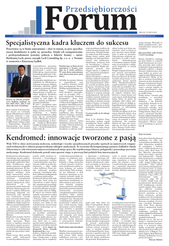 nr 6 (6) 12 LIPCA 2013 dodAtek PromoCyjno-InformACyjny www.forum-PrzedsIebIorCzosCI.PL Specjalistyczna kadra kluczem do sukcesu Pracownicy są w firmie najważniejsi – choć to truizm, to przy specyfice naszej działalności w pełni się sprawdza. Dzięki ich zaangażowaniu i profesjonalizmowi jesteśmy jednym z liderów branży – mówi Bartłomiej Lech, prezes zarządu Lech Consulting Sp. z o. o. z Torunia w rozmowie z Katarzyną Gędłek. Kończy się obecnie perspektywa budżetu unijnego na lata 2007-2013. Jaki to był okres dla Lech Consulting? Przez ostatnie 8 lat firma bardzo mocno się rozwinęła. Mamy kilkudziesięciu stałych klientów, zwłaszcza z województwa kujawsko-pomorskiego, którym pomagamy w aplikowaniu o dotacje unijne z Regionalnego Programu Operacyjnego oraz programów krajowych. Poza naszym województwem pracujemy również przy poważniejszych inwestycjach z terenu całej Polski, jak np. rozwój systemu komunikacji publicznej w Radomiu czy budowa biogazowi w Legnicy. Od początku działalności pozyskaliśmy ok. 500 dotacji na realizację inwestycji, badania, wdrożenia, szkolenia, udział w targach czy promocję. W tym czasie zdobyliśmy ogromne doświadczenie w bardzo szerokim spektrum doradztwa unijnego. Obecnie firma zatrudnia na stałe blisko 20 osób i zajmuje się kilkudziesięcioma projektami. W 2011 r. przejęliśmy także konkurencyjną firmę Innova Consulting Sp. z o.o., posiadającą uznaną renomę i doświadczenie w bardzo poważnych projektach z całego kraju, jak np. przebudowa metra w Warszawie czy utworzenie największego w Europie Środkowo-Wschodniej ośrodka do badań biomedycznych i biotechnologicznych (388,4 mln zł). Pomimo tego, że firma nie jest największą w branży, znajduje się w ścisłej czołówce. W czym tkwią najważniejsze atuty kierowanej przez pana firmy? Od kilku lat jesteśmy liderem w województwie oraz w czołówce krajowej wśród firm pozyskujących dotacje. Według ogólnopolskiego rankingu „Najskuteczniejsze firmy doradcze”, sporządzonego na początku 2012 r. przez miesięcznik „Fundusze Europejskie”, firma Lech Consulting zajęła 3 miejsce w Polsce pod względem ilości projektów zakwalifikowanych do dofinansowania. Co więcej, Bank Gospodarstwa Krajowego wybrał nas do współpracy jako Pewnego Partnera Unijnego. Jesteśmy jedną z pięciu firm i jedyną z północnej części kraju. Głównym pionem naszej działalności zawsze były dotacje unijne. Naszym atutem jest kompleksowa obsługa – od doradztwa w zakresie możli- wości pozyskania środków do rozliczenia przyznanego dofinansowania. Tematyka funduszy unijnych jest dość szeroka, dlatego mamy osobny dział zajmujący się sektorem biznesowym, inny publicznym, szkoleniami, promocją firm czy koordynacją i rozliczaniem projektów. Wąska spepozwala nam cjalizacja osiągać sukcesy w aplikowaniu i utrzymywać ponadprzeciętną skuteczność. Oprócz doradztwa w zakresie funduszy unijnych zajmujemy się też doradztwem strategicznym. Przygotowujemy strategie rozwoju powiatów, gmin, programy rewitalizacji miast itp. Pod względem usług dla przedsiębiorców prowadzimy działania w temacie strategii marketingowych. Tak szeroki wachlarz naszych możliwości w połączeniu z jakością pracy powoduje, że jesteśmy uznaną marką w branży, a to bezpośrednio przekłada się na liczbę podmiotów zainteresowanych współpracą. Co przyczyniło się do takiego sukcesu? Przez 8 lat działania firmy stworzyłem zaufany zespół menadżerów, którzy zadbali o wysokie standardy pracy doradców oraz niską rotację wyspecjalizowanych pracow- ników. Ludzie są w firmie najważniejsi – choć to truizm, to przy specyfice naszej działalności w pełni się sprawdza. Zdecydowana większość naszej kadry, to osoby z wieloletnim doświadczeniem w doradztwie unijnym. Dzięki temu są oni jednymi z najlepszych ekspertów w swoich dziedzinach. Drugim nieprzecenionym atutem naszych pracowników jest ich wąska specjalizacja, która jest kluczem do bardzo wysokiej skuteczności w pozyskiwaniu dotacji (ponad 90%). Dwudziestoosobowy zespół podzielony zadaniami doskonale się uzupełnia i dysponuje wiedzą oraz doświadczeniem nieporównywalnym do małych, młodych firm, których w naszej branży jest coraz więcej. Jeżeli dysponuję kadrą, która od pięciu lat obsługuje tylko sektor publiczny, to wiem, że obsługa takiego klienta jest na najwyższym poziomie, co udowadniają później rankingi. Od kilku lat zgłasza się do nas więcej chętnych, którzy chcą powierzyć naszej firmie wykonanie dokumentacji aplikacyjnej, niż jesteśmy w stanie zrealizować. Ale wspólnie dążymy do tego, aby rozwijając się, nie tracić na jakości pracy. Rosnąca liczba sukcesów potwierdza skuteczność Kendromed: innowacje tworzone z pasją Wiek XXI to okres nowoczesnej medycyny, technologii i wysoko specjalistycznych procedur opartych na najnowszych osiągnięciach technicznych w zakresie przeprowadzania zabiegów medycznych. To wyzwanie dla kompetentnego partnera Zakładów Opieki Zdrowotnej w celu stworzenia najnowocześniejszych miejsc pracy dla współczesnego lekarza, pielęgniarki i pozostałego personelu medycznego. Kendromed doskonale potrafi temu sprostać stając w pierwszej linii polskich firm innowacyjnych. Kendromed jest dostawcą profesjonalnego sprzętu medycznego do placówek szpitalnych, przychodni i gabinetów lekarskich. Produkowany sprzęt spełnia najwyższe europejskie standardy jakościowe. W ofercie znajdują się m.in. sufitowe kolumny zasilające, które dzięki zastosowaniu obrotowych ramion i konsoli są funkcjonalnym rozwiązaniem stosowanym na salach operacyjnych, zabiegowych, wybudzeniowych czy też intensywnej opieki medycznej. Kolumny dostarczają gazy medyczne i zasilanie elektryczne, gwarantują doskonałe rozmieszczenie całej aparatury oraz komfortowe warunki pracy personelu medycznego. Oferowane przez nas panele nadł