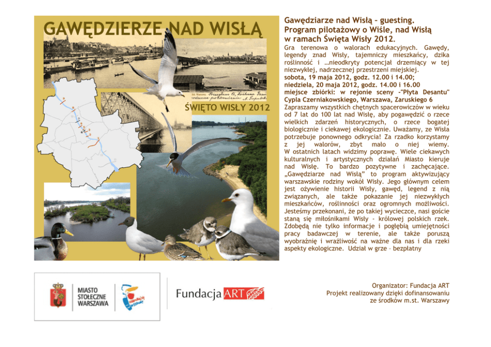 Gawędziarze nad Wisłą – guesting. Program pilotażowy o Wiśle, nad Wisłą w ramach Święta Wisły 2012. Gra terenowa o walorach edukacyjnych. Gawędy, legendy znad Wisły, tajemniczy mieszkańcy, dzika roślinność i …nieodkryty potencjał drzemiący w tej niezwykłej, nadrzecznej przestrzeni miejskiej. sobota, 19 maja 2012, godz. 12.00 i 14.00; niedziela, 20 maja 2012, godz. 14.00 i 16.00 miejsce zbiórki: w rejonie sceny -"Płyta Desantu" Cypla Czerniakowskiego, Warszawa, Zaruskiego 6 Zapraszamy wszystkich chętnych spacerowiczów w wieku od 7 lat do 100 lat nad Wisłę, aby pogawędzić o rzece wielkich zdarzeń historycznych, o rzece bogatej biologicznie i ciekawej ekologicznie. Uważamy, ze Wisła potrzebuje ponownego odkrycia! Za rzadko korzystamy z jej walorów, zbyt mało o niej wiemy. W ostatnich latach widzimy poprawę. Wiele ciekawych kulturalnych i artystycznych działań Miasto kieruje nad Wisłę. To bardzo pozytywne i zachęcające. „Gawędziarze nad Wisłą” to program aktywizujący warszawskie rodziny wokół Wisły. Jego głównym celem jest ożywienie historii Wisły, gawęd, legend z nią związanych, ale także pokazanie jej niezwykłych mieszkańców, roślinności oraz ogromnych możliwości. Jesteśmy przekonani, że po takiej wycieczce, nasi goście staną się miłośnikami Wisły - królowej polskich rzek. Zdobędą nie tylko informacje i pogłębią umiejętności pracy badawczej w terenie, ale także poruszą wyobraźnię i wrażliwość na ważne dla nas i dla rzeki aspekty ekologiczne. Udział w grze – bezpłatny Organizator: Fundacja ART Projekt realizowany dzięki dofinansowaniu ze środków m.st. Warszawy