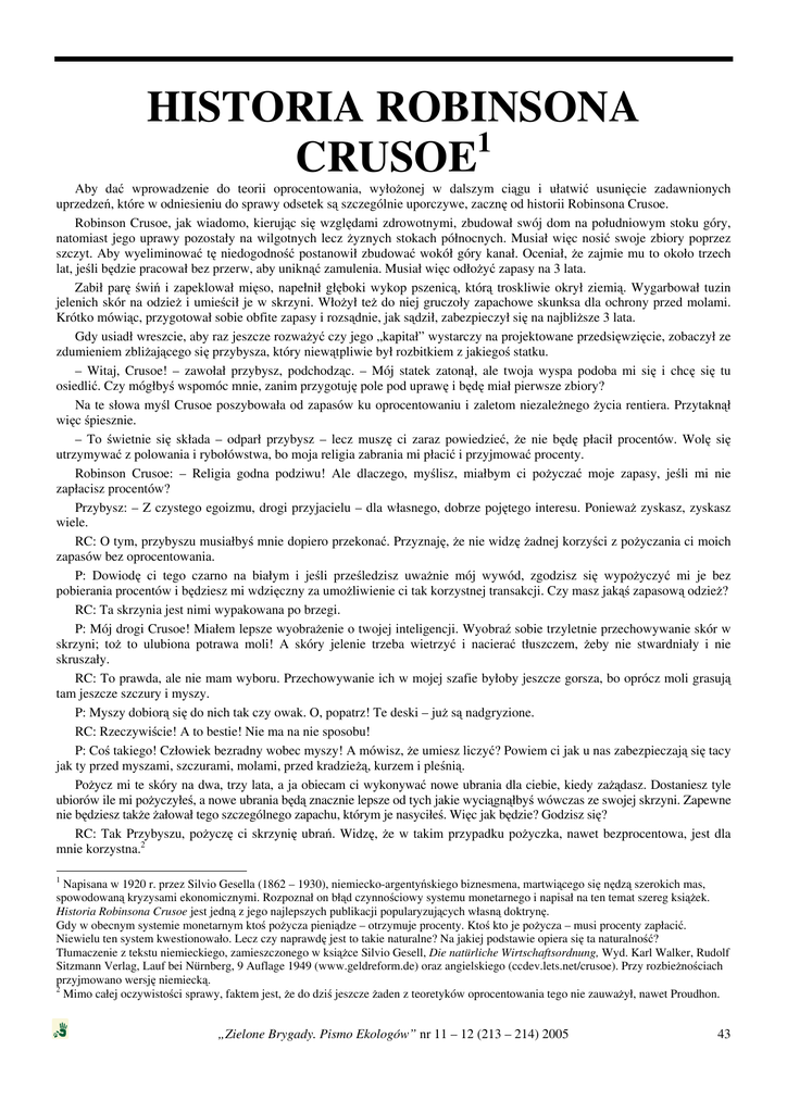 HISTORIA ROBINSONA 1 CRUSOE Aby dać wprowadzenie do teorii oprocentowania, wyłożonej w dalszym ciągu i ułatwić usunięcie zadawnionych uprzedzeń, które w odniesieniu do sprawy odsetek są szczególnie uporczywe, zacznę od historii Robinsona Crusoe. Robinson Crusoe, jak wiadomo, kierując się względami zdrowotnymi, zbudował swój dom na południowym stoku góry, natomiast jego uprawy pozostały na wilgotnych lecz żyznych stokach północnych. Musiał więc nosić swoje zbiory poprzez szczyt. Aby wyeliminować tę niedogodność postanowił zbudować wokół góry kanał. Oceniał, że zajmie mu to około trzech lat, jeśli będzie pracował bez przerw, aby uniknąć zamulenia. Musiał więc odłożyć zapasy na 3 lata. Zabił parę świń i zapeklował mięso, napełnił głęboki wykop pszenicą, którą troskliwie okrył ziemią. Wygarbował tuzin jelenich skór na odzież i umieścił je w skrzyni. Włożył też do niej gruczoły zapachowe skunksa dla ochrony przed molami. Krótko mówiąc, przygotował sobie obfite zapasy i rozsądnie, jak sądził, zabezpieczył się na najbliższe 3 lata. Gdy usiadł wreszcie, aby raz jeszcze rozważyć czy jego „kapitał” wystarczy na projektowane przedsięwzięcie, zobaczył ze zdumieniem zbliżającego się przybysza, który niewątpliwie był rozbitkiem z jakiegoś statku. – Witaj, Crusoe! – zawołał przybysz, podchodząc. – Mój statek zatonął, ale twoja wyspa podoba mi się i chcę się tu osiedlić. Czy mógłbyś wspomóc mnie, zanim przygotuję pole pod uprawę i będę miał pierwsze zbiory? Na te słowa myśl Crusoe poszybowała od zapasów ku oprocentowaniu i zaletom niezależnego życia rentiera. Przytaknął więc śpiesznie. – To świetnie się składa – odparł przybysz – lecz muszę ci zaraz powiedzieć, że nie będę płacił procentów. Wolę się utrzymywać z polowania i rybołówstwa, bo moja religia zabrania mi płacić i przyjmować procenty. Robinson Crusoe: – Religia godna podziwu! Ale dlaczego, myślisz, miałbym ci pożyczać moje zapasy, jeśli mi nie zapłacisz procentów? Przybysz: – Z czystego egoizmu, drogi przyjacielu – dla własnego, dobrze pojętego interesu. Ponieważ zyskasz, zyskasz wiele. RC: O tym, przybyszu musiałbyś mnie dopiero przekonać. Przyznaję, że nie widzę żadnej korzyści z pożyczania ci moich zapasów bez oprocentowania. P: Dowiodę ci tego czarno na białym i jeśli prześledzisz uważnie mój wywód, zgodzisz się wypożyczyć mi je bez pobierania procentów i będziesz mi wdzięczny za umożliwienie ci tak korzystnej transakcji. Czy masz jakąś zapasową odzież? RC: Ta skrzynia jest nimi wypakowana po brzegi. P: Mój drogi Crusoe! Miałem lepsze wyobrażenie o twojej inteligencji. Wyobraź sobie trzyletnie przechowywanie skór w skrzyni; toż to ulubiona potrawa moli! A skóry jelenie trzeba wietrzyć i nacierać tłuszczem, żeby nie stwardniały i nie skruszały. RC: To prawda, ale nie mam wyboru. Przechowywanie ich w mojej szafie byłoby jeszcze gorsza, bo oprócz moli grasują tam jeszcze szczury i myszy. P: Myszy dobiorą się do nich tak czy owak. O, popatrz! Te deski – już są nadgryzione. RC: Rzeczywiście! A to bestie! Nie ma na nie sposobu! P: Coś takiego! Człowiek bezradny wobec myszy! A mówisz, że umiesz liczyć? Powiem ci jak u nas zabezpieczają się tacy jak ty przed myszami, szczurami, molami, przed kradzieżą, kurzem i pleśnią. Pożycz mi te skóry na dwa, trzy lata, a ja obiecam ci wykonywać nowe ubrania dla ciebie, kiedy zażądasz. Dostaniesz tyle ubiorów ile mi pożyczyłeś, a nowe ubrania będą znacznie lepsze od tych jakie wyciągnąłbyś wówczas ze swojej skrzyni. Zapewne nie będziesz także żałował tego szczególnego zapachu, którym je nasyciłeś. Więc jak będzie? Godzisz się? RC: Tak Przybyszu, pożyczę ci skrzynię ubrań. Widzę, że w takim przypadku pożyczka, nawet bezprocentowa, jest dla mnie korzystna.2 1 Napisana w 1920 r. przez Silvio Gesella (1862 – 1930), niemiecko-argentyńskiego biznesmena, martwiącego się nędzą szerokich mas, spowodowaną kryzysami ekonomicznymi. Rozpoznał on błąd czynnościowy systemu monetarnego i napisał na ten temat szereg książek. Historia Robinsona Crusoe jest jedną z jego najlepszych publikacji popularyzujących własną doktrynę. Gdy w obecnym systemie monetarnym ktoś pożycza pieniądze – otrzymuje procenty. Ktoś kto je pożycza – musi procenty zapłacić. Niewielu ten system kwestionowało. Lecz czy naprawdę jest to takie naturalne? Na jakiej podstawie opiera się ta naturalność? Tłumaczenie z tekstu niemieckiego, zamieszczonego w książce Silvio Gesell, Die natürliche Wirtschaftsordnung, Wyd. Karl Walker, Rudolf Sitzmann Verlag, Lauf bei Nürnberg, 9 Auflage 1949 (www.geldreform.de) oraz angielskiego (ccdev.lets.net/crusoe). Przy rozbieżnościach przyjmowano wersję niemiecką. 2 Mimo całej oczywistości sprawy, faktem jest, że do dziś jeszcze żaden z teoretyków oprocentowania tego nie zauważył, nawet Proudhon. „Zielone Brygady. Pismo Ekologów” nr 11 – 12 (213 – 214) 2005 43 P: To pokaż mi teraz twoją pszenicę. Potrzebuję chleba i nasion. RC: Jest zadołowana w tym kopcu. P: Co, pszenicę zakopałeś na trzy lata! A pleśń i robactwo? RC: Wszystko przemyślałem. Nie przyszedł mi do głowy żaden lepszy pomysł. P: Schyl się tylko. Przyjrzyj się temu żuczkowi gramolącemu się na twój kopiec. Widzisz te odchody? O! A tutaj pleśń! Najwyższy czas wyciągnąć pszenicę i przewietrzyć. RC: Ten mój kapitał mnie zrujnuje! Żebym też mógł znaleźć jakieś zabezpieczenie przed tysięcznymi niszczycielskimi siłami przyrody! P: Pozwól mi opowiedzieć, jak sobie z tym radzimy w mojej ojczyźnie. Budujemy suchą i przewiewną szopę i przesypujemy pszenicę na ogrodzonym klepisku. Co trzy tygodnie cały zapas zostaje przegarnięty drewnianymi szuflami. Mamy też koty, stosujemy pułapki na myszy i ube