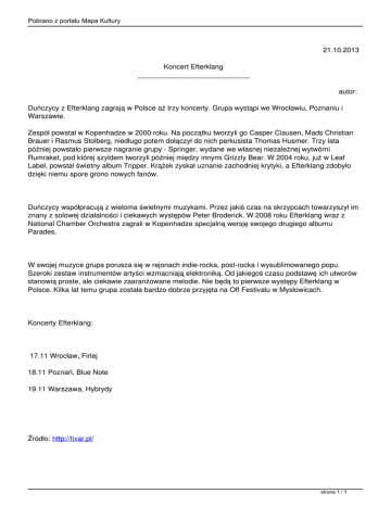 Pobrano z portalu Mapa Kultury 21.10.2013 Koncert Efterklang ____________________________ autor: Duńczycy z Efterklang zagrają w Polsce aż trzy koncerty. Grupa wystąpi we Wrocławiu, Poznaniu i Warszawie. Zespół powstał w Kopenhadze w 2000 roku. Na początku tworzyli go Casper Clausen, Mads Christian Brauer i Rasmus Stolberg, niedługo potem dołączył do nich perkusista Thomas Husmer. Trzy lata później powstało pierwsze nagranie grupy - Springer, wydane we własnej niezależnej wytwórni Rumraket, pod której szyldem tworzyli później między innymi Grizzly Bear. W 2004 roku, już w Leaf Label, powstał świetny album Tripper. Krążek zyskał uznanie zachodniej krytyki, a Efterklang zdobyło dzięki niemu spore grono nowych fanów. Duńczycy współpracują z wieloma świetnymi muzykami. Przez jakiś czas na skrzypcach towarzyszył im znany z solowej działalności i ciekawych występów Peter Broderick. W 2008 roku Efterklang wraz z National Chamber Orchestra zagrali w Kopenhadze specjalną wersję swojego drugiego albumu Parades. W swojej muzyce grupa porusza się w rejonach indie-rocka, post-rocka i wysublimowanego popu. Szeroki zestaw instrumentów artyści wzmacniają elektroniką. Od jakiegoś czasu podstawę ich utworów stanowią proste, ale ciekawie zaaranżowane melodie. Nie będą to pierwsze występy Efterklang w Polsce. Kilka lat temu grupa została bardzo dobrze przyjęta na Off Festivalu w Mysłowicach. Koncerty Efterklang: 17.11 Wrocław, Firlej 18.11 Poznań, Blue Note 19.11 Warszawa, Hybrydy Źródło: http://tixar.pl/ strona 1 / 1