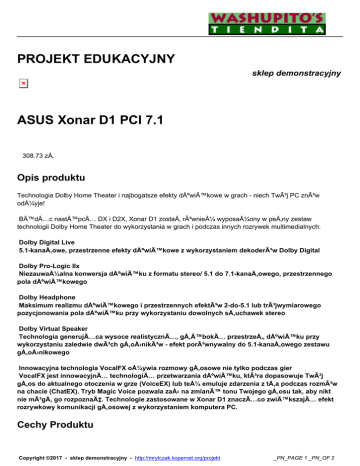 PROJEKT EDUKACYJNY sklep demonstracyjny ASUS Xonar D1 PCI 7.1 308.73 zÅ‚ Opis produktu Technologia Dolby Home Theater i najbogatsze efekty dźwiÄ™kowe w grach - niech Twój PC znów odżyje! BÄ™dÄ…c nastÄ™pcÄ… DX i D2X, Xonar D1 zostaÅ‚ również wyposażony w peÅ‚ny zestaw technologii Dolby Home Theater do wykorzystania w grach i podczas innych rozrywek multimedialnych: Dolby Digital Live 5.1-kanaÅ‚owe, przestrzenne efekty dźwiÄ™kowe z wykorzystaniem dekoderów Dolby Digital Dolby Pro-Logic IIx Niezauważalna konwersja dźwiÄ™ku z formatu stereo/ 5.1 do 7.1-kanaÅ‚owego, przestrzennego pola dźwiÄ™kowego Dolby Headphone Maksimum realizmu dźwiÄ™kowego i przestrzennych efektów 2-do-5.1 lub trójwymiarowego pozycjonowania pola dźwiÄ™ku przy wykorzystaniu dowolnych sÅ‚uchawek stereo Dolby Virtual Speaker Technologia generujÄ…ca wysoce realistycznÄ…, głębokÄ… przestrzeÅ„ dźwiÄ™ku przy wykorzystaniu zaledwie dwóch gÅ‚oÅ›ników - efekt porównywalny do 5.1-kanaÅ‚owego zestawu gÅ‚oÅ›nikowego Innowacyjna technologia VocalFX ożywia rozmowy gÅ‚osowe nie tylko podczas gier VocalFX jest innowacyjnÄ… technologiÄ… przetwarzania dźwiÄ™ku, która dopasowuje Twój gÅ‚os do aktualnego otoczenia w grze (VoiceEX) lub też emuluje zdarzenia z tÅ‚a podczas rozmów na chacie (ChatEX). Tryb Magic Voice pozwala zaÅ› na zmianÄ™ tonu Twojego gÅ‚osu tak, aby nikt nie mógÅ‚ go rozpoznać. Technologie zastosowane w Xonar D1 znaczÄ…co zwiÄ™kszajÄ… efekt rozrywkowy komunikacji gÅ‚osowej z wykorzystaniem komputera PC. Cechy Produktu Copyright ©2017 - sklep demonstracyjny - http://mrytczak.kopernet.org/projekt _PN_PAGE 1 _PN_OF 2 Typ złącza Próbkowanie CzÄ™stotliwość próbkowania System dzwiÄ™ku OdstÄ™p sygnaÅ‚u od szumu Typ chipsetu Dekoder Dolby Digital 5.1 PCI 24 bit 192 kHz 7,1 114 dB Asus AV100 Tak Informacja o sprzedawcy Recenzje klientów: Nikt jeszcze nie recenzowaÅ‚ tego produktu. Aby dodać recenzjÄ™, zaloguj siÄ™. Copyright ©2017 - sklep demonstracyjny - http://mrytczak.kopernet.org/projekt _PN_PAGE 2 _PN_OF 2