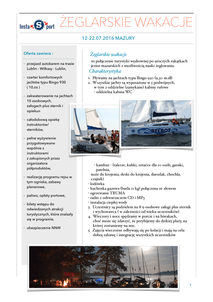 ŻEGLARSKIE WAKACJE 12-22.07.2016 MAZURY Oferta zawiera : - przejazd autokarem na trasie Lublin - Wilkasy - Lublin, - czarter komfortowych jachtów typu Bingo 930 ( 10.os ) - zakwaterowanie na jachtach 10 osobowych, załogach plus sternik i opiekun Żeglarskie wakacje to połączenie turystyki wędrownej po uroczych zakątkach jezior mazurskich z możliwością nauki żeglowania. Charakterystyka: 1. Pływamy na jachtach typu Bingo 930 (9,30 m.dł) 2. Wszystkie jachty są wyposażone w 5 podwójnych, w tym 2 oddzielne (zamykane) kabiny rufowe - oddzielna kabina WC - całodobową opiekę instruktorów/ sterników, - pełne wyżywienie przygotowywane wspólnie z instruktorami z zakupionych przez organizatora półproduktów, - realizację programu rejsu w tym ogniska, zabawy plenerowe, - paliwo, opłaty portowe, - bilety wstępu do odwiedzanych atrakcji turystycznych, które znalazły się w programie, - ubezpieczenie NNW - kambuz - (talerze, kubki, sztućce dla 10 osób, garnki, patelnia, noże do krojenia, deski do krojenia, durszlak, chochla, czajnik) - lodówka - kuchenka gazowa (butla 11 kg) połączona ze zlewem - ogrzewanie TRUMA - radio z odtwarzaczem CD i MP3 - instalacja ciepłej wody 3. Uczestnicy są podzieleni na 8-9 osobowe załogi plus sternik i wychowawca ( w zależności od wieku uczestników) 4. Wieczory i noce spędzamy w porcie i na biwakach, choć może się zdarzyć, że przybijemy do dzikiej plaży, na której zostaniemy na noc. 5. Zajęcia wieczorne odbywają się po kolacji i mają na celu dobrą zabawę i integrację wszystkich uczestników 1 W programie : - Instytut PAN Popielno ( rezerwat konika polskiego, muzeum przyrodnicze) - park wodny Tropikana w Hotelu Gołębiewskim w Mikołajkach - zwiedzanie twierdzy Boyen w Giżycku - zwiedzanie poniemieckich bunkrów z czasów II wojny światowej ,,Mamerki’’ - wyjście na basen w Giżycku Przykładowy plan dnia: 8.00- apel 8.15 - 9.30 – toaleta poranna, śniadanie 10:00 - 18.00 - wypływamy wszyscy razem i pokonujemy założoną trasę (w czasie rejsu zatrzymujemy się zwiedzać ciekawe miejsca na trasie i przygotować posiłek) 18.15 - spływamy do portu na noc 18.30 - 19.30 - obiadokolacja 19.45 - czas dla siebie: gry, zabawy terenowe 21.00 - zbiórka załóg na jachtach 22.00 - cisza nocna - gry terenowe i ogniska DATA PROGRAM* 12.07 przejazd autokarem Lublin-Wilkasy, podział na wachty, zakwaterowanie na jachtach, zapoznanie uczestników i kadry z obowiązującymi regulaminami i sprzętem, pogadanka na temat bezpieczeństwa na jachtach i obozie 13.07 trasa Wilkasy - Zielony Gaj, ognisko 14.07 trasa Zielony Gaj - Mikołajki Hotel Gołębiewski , wyjście do parku wodnego Tropikana 15.07 Mikołajki zwiedzanie/czas wolny , trasa Mikołajki - Popielno 16.07 zwiedzanie muzeum instytutu PAN trasa Popielno - j.Bełdany, postój na plaży nad jeziorem, ognisko 17.07 trasa j.Bełdany - port Nawigator XXI, gry terenowe 18.07 trasa port Nawigator XXI - Giżycko, wyjście na basen, 19.07 zwiedzanie Twierdzy Boyen, niespodzianka ,trasa Giżycko - Świdry 20.07 trasa Świdry - Kietlice, gra terenowa, ognisko 21.07 trasa Kietlice- Mamerki / zwiedzanie bunkrów/ - Zimny Kąt,ognisko 22.07 przygotowanie do wyjazdu, pakowanie bagażu, przepłynięcie do Wilkas, zdanie sprzętu, zakończenie obozu, przejazd autokarem Wilkasy-Lublin * Program rejsu ze względu na warunki pogodowe, może ulec zmianie . Cena : w zależności od wielkości grupy liczba osób/cena 40/1800 pln ; 50/1750 pln ; 55/1700 pln 2