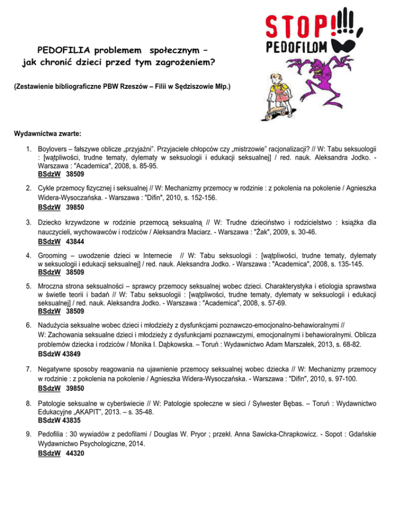 PEDOFILIA problemem społecznym – jak chronić dzieci przed tym zagrożeniem? (Zestawienie bibliograficzne PBW Rzeszów – Filii w Sędziszowie Młp.) Wydawnictwa zwarte: 1. Boylovers – fałszywe oblicze „przyjaźni”. Przyjaciele chłopców czy „mistrzowie” racjonalizacji? // W: Tabu seksuologii : [wątpliwości, trudne tematy, dylematy w seksuologii i edukacji seksualnej] / red. nauk. Aleksandra Jodko. Warszawa : "Academica", 2008, s. 85-95. BSdzW 38509 2. Cykle przemocy fizycznej i seksualnej // W: Mechanizmy przemocy w rodzinie : z pokolenia na pokolenie / Agnieszka Widera-Wysoczańska. - Warszawa : "Difin", 2010, s. 152-156. BSdzW 39850 3. Dziecko krzywdzone w rodzinie przemocą seksualną // W: Trudne dzieciństwo i rodzicielstwo : książka dla nauczycieli, wychowawców i rodziców / Aleksandra Maciarz. - Warszawa : "Żak", 2009, s. 30-46. BSdzW 43844 4. Grooming – uwodzenie dzieci w Internecie // W: Tabu seksuologii : [wątpliwości, trudne tematy, dylematy w seksuologii i edukacji seksualnej] / red. nauk. Aleksandra Jodko. - Warszawa : "Academica", 2008, s. 135-145. BSdzW 38509 5. Mroczna strona seksualności – sprawcy przemocy seksualnej wobec dzieci. Charakterystyka i etiologia sprawstwa w świetle teorii i badań // W: Tabu seksuologii : [wątpliwości, trudne tematy, dylematy w seksuologii i edukacji seksualnej] / red. nauk. Aleksandra Jodko. - Warszawa : "Academica", 2008, s. 57-69. BSdzW 38509 6. Nadużycia seksualne wobec dzieci i młodzieży z dysfunkcjami poznawczo-emocjonalno-behawioralnymi // W: Zachowania seksualne dzieci i młodzieży z dysfunkcjami poznawczymi, emocjonalnymi i behawioralnymi. Oblicza problemów dziecka i rodziców / Monika I. Dąbkowska. – Toruń : Wydawnictwo Adam Marszałek, 2013, s. 68-82. BSdzW 43849 7. Negatywne sposoby reagowania na ujawnienie przemocy seksualnej wobec dziecka // W: Mechanizmy przemocy w rodzinie : z pokolenia na pokolenie / Agnieszka Widera-Wysoczańska. - Warszawa : "Difin", 2010, s. 97-100. BSdzW 39850 8. Patologie seksualne w cyberświecie // W: Patologie społeczne w sieci / Sylwester Bębas. – Toruń : Wydawnictwo Edukacyjne „AKAPIT”, 2013. – s. 35-48. BSdzW 43835 9. Pedofilia : 30 wywiadów z pedofilami / Douglas W. Pryor ; przekł. Anna Sawicka-Chrapkowicz. - Sopot : Gdańskie Wydawnictwo Psychologiczne, 2014. BSdzW 44320 10. Pedofilia : geneza i mechanizm zaburzenia / Maria Beisert. - Sopot : Gdańskie Wydawnictwo Psychologiczne, 2012. BSdzW 41235 11. Pedofilia : przemoc wobec dzieci / Justyna Pieczko. - Kraków : Wydawnictwo Św. Stanisława BM, 2012. BSdzW 43820 12. Pedofilia jako zagrożenie XXI wieku / pod red. Jerzego Bukały, Krzysztofa Wątorka. - Kielce : Wyższa Szkoła Ekonomii i Prawa, 2011. BSdzW 44201 13. Pedofilia w sieci // W: Dzieci i młodzież w sieci zagrożeń realnych i wirtualnych : aspekty teoretyczne i empiryczne / Anna Andrzejewska. - Warszawa : "Difin", 2014, s. 144-155. BSdzW 43829 14. Pedofilia w ujęciu neuroscience // W: Tabu seksuologii : [wątpliwości, trudne tematy, dylematy w seksuologii i edukacji seksualnej] / red. nauk. Aleksandra Jodko. - Warszawa : "Academica", 2008, s. 97-114. BSdzW 38509 15. Powstrzymać sprawców wykorzystywania seksualnego dzieci. Nowe wyzwania // W: Tabu seksuologii : [wątpliwości, trudne tematy, dylematy w seksuologii i edukacji seksualnej] / red. nauk. Aleksandra Jodko. - Warszawa : "Academica", 2008, s. 71-83. BSdzW 38509 16. Przemoc i zaniedbanie seksualne oraz kazirodztwo // W: Mechanizmy przemocy w rodzinie : z pokolenia na pokolenie / Agnieszka Widera-Wysoczańska. - Warszawa : "Difin", 2010, s. 46-50. BSdzW 39850 17. Skrzywdzone dziecko – dorosłe ofiary wykorzystania seksualnego w dzieciństwie // W: Tabu seksuologii : [wątpliwości, trudne tematy, dylematy w seksuologii i edukacji seksualnej] / red. nauk. Aleksandra Jodko. Warszawa : "Academica", 2008, s. 145- 155. BSdzW 38509 18. Wykorzystanie seksualne dziecka // W: Jestem dziewczynką, jestem chłopcem : jak wspomagać rozwój seksualny dziecka / Monika Zielona-Jenek, Aleksandra Chodecka. - Gdańsk : Gdańskie Wydawnictwo Psychologiczne, 2010. s. 233-252. BSdzW 39363 19. Wykorzystywanie seksualne dzieci // W: Dzieci krzywdzone i wykorzystywane seksualnie : poradnik dla nauczycieli, pedagogów i pracowników socjalnych / Izabela Kałka. - Sosnowiec : "Projekt-Kom", 2007, s. 67-106. BSdzW 37662 20. Wykorzystywanie seksualne dzieci : teoria, badania, praktyka / pod red. Moniki Sajkowskiej. - Warszawa : Fundacja Dzieci Niczyje, 2004. BSdzW 37890 21. Wyuczone w dzieciństwie zaprzeczenia u sprawcy przemocy seksualne // W: Mechanizmy przemocy w rodzinie : z pokolenia na pokolenie / Agnieszka Widera-Wysoczańska. - Warszawa : "Difin", 2010, s. 107-116. BSdzW 39850 Artykuły z czasopism: 22. Bezpieczeństwo dziecka - molestowanie seksualne / Krzysztof Kruszko.// Życie Szkoły. - 2005, nr 6, s. 358-364. 23. Diagnozowanie dzieci wykorzystywanych seksualnie / Olga Galimska.// Edukacja i Dialog. - 2005, nr 10. s. 64-68. 24. Dotyk, który boli : "Niepotrzebne" statystyki... / Monika Urbańska-Bulas.// Bliżej Przedszkola. - 2010, nr 7-8, s. 60-65. 25. Pedofilia / Karolina Sobczyńska.// Problemy Opiekuńczo-Wychowawcze. - 2009, nr 2, s.21-27. 26. Przemoc wobec dzieci jako współczesny problem zdrowia publicznego / Izabella Jezierska.// Lider. - 2008, nr 12, s. 11-13. 27. Rozpoznawanie symptomów przemocy wobec dziecka / Wanda Papugowa.// Bliżej Przedszkola. - 2012, nr 1, s. 5859. 28. W czterech ścianach... / Katarzyna Migdał.// Bliżej Przedszkola. - 2009, nr 2, s. 48-49. 29. Wykorzystywanie seksualne dzieci : wyniki Ogólnopolskiej diagnozy problemu przemocy wobec dzieci / Joanna Włodarczyk, Monika Sajkowska.// Dziecko Krzywdzone. - 2013, nr 3, s. 82-100. 30. Wymowa sygnałów molestowania / Katarzyna Ziółkowska.// Edukacja i Dialog. - 2005, nr 10, s. 60-63.