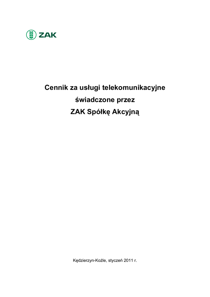 Cennik za usługi telekomunikacyjne świadczone przez ZAK Spółkę Akcyjną Kędzierzyn-Koźle, styczeń 2011 r. Spis treści Rozdział 1. Usługi abonamentu telefonicznego ................................................................. 3 A. Opłaty jednorazowe i miesięczne .................................................................................... 3 B. Objaśnienia i informacje ................................................................................................... 6 Rozdział 2. Połączenia telefoniczne ..................................................................................... 7 A. Opłaty podstawowe ......................................................................................................... 7 B. Opłaty w Taryfie normalnej ............................................................................................. 7 C. Opłaty w Taryfie taniej .................................................................................................... 11 D. Połączenia międzynarodowe ............................................................................................ 16 E. Usługi dodatkowe ........................................................................................................... 22 F. Objaśnienia i informacje .................................................................................................. 22 Rozdział 3. Usługi ISDN ........................................................................................................ 25 A. Opłaty jednorazowe i miesięczne ..................................................................................... 25 B Objaśnienia i informacje ................................................................................................... 26 Rozdział 4. Łącza dzierżawione ............................................................................................ 29 A. Opłaty jednorazowe i miesięczne ..................................................................................... 29 B. Objaśnienia i informacje ................................................................................................... 29 Rozdział 5. Usługa Centrex ................................................................................................... 31 A. Opłaty jednorazowe i miesięczne ..................................................................................... 31 B. Objaśnienia i informacje ................................................................................................... 31 Rozdział 6. Postanowienia końcowe ..................................................................................... 33 2 Rozdział 1 USŁUGI ABONAMENTU TELEFONICZNEGO A. Opłaty jednorazowe i miesięczne Tabela 1. Opłaty podstawowe Poz. PKWiU 1 1 2 64.2 2 64.2 3 64.2 4 64.2 5 64.2 Rodzaj usługi 3 Uzyskanie dostępu do sieci telekomunikacyjnej ZAK S.A. niezależnie od rodzaju urządzeń stanowiących zakończenie łącza telefonicznego: 1) stałego – za każde łącze do urządzenia końcowego, 2) okresowego – za każde łącze do urządzenia końcowego: a) na okres 7 dni, b) na okres 1 miesiąca, c) na okres 6 miesięcy, d) na okres 12 miesięcy, e) powyżej 12 miesięcy Przyłączenie drugiego i następnego łącza telefonicznego stałego i okresowego powyżej 12 miesięcy Zmiana dostępu, do sieci telekomunikacyjnej ZAK S.A., z okresowego na stały Zmiana Abonenta w związku z rozwiązaniem lub wygaśnięciem umowy Przyłączenie do sieci telekomunikacyjnej w przypadku zmiany operatora sieci 3 Opłata podst. [zł] Kwota VAT [zł] Opłata końcowa [zł] 4 5 6 250,00 57,50 307,50 70,00 100,00 130,00 160,00 250,00 16,10 23,00 29,90 36,80 57,50 86,10 123,00 159,90 196,80 307,50 100,00 23,00 123,00 wg poz. 1 pkt 1 pomniejszona o odpowiednią kwotę wg poz. 1 pkt 2 (a, b, c) 20,00 4,60 24,60 1,00 0,23 1,23 Tabela 2. Miesięczny abonament telefoniczny - opłaty podstawowe i dodatkowe Poz. PKWiU 1 1 2 64.2 2 64.2 3 64.2 4 64.2 5 64.2 Rodzaj usługi 3 Za każde łącze telefoniczne z centrali telefonicznej do urządzenia końcowego: 1) Taryfa normalna, 2) Taryfa tania Za każde łącze analogowe z centrali dyspozytorskiej DGT 3450 do aparatu dyspozytorskiego Za każde łącze analogowe z centrali dyspozytorskiej DGT 3450 do cyfrowego aparatu systemowego Zastrzeżenie numeru Dostarczenie na życzenie Abonenta wykazu zrealizowanych połączeń za dany miesiąc dla jednego urządzenia końcowego: 1) wydruk do 3 stron, 2) za każdą następną stronę wydruku, 3) dyskietki (własność ZAK S.A.), 6 64.2 7 64.2 8 9 64.2 64.2 4) poprzez przesłanie pocztą elektroniczną Za nadanie informacji słownej o zmianie numeru urządzenia końcowego – na życzenie Abonenta Zawieszenie, na życzenie Abonenta, świadczenia usług telefonicznych na okres nie dłuższy niż 12 miesięcy – za każdy rozpoczęty miesiąc – opłata pobierana z góry za cały okres zawieszenia Za łącze do aparatu dodatkowego niezależnie od rodzaju i układu sieci telefonicznej: 1) jeżeli jest zainstalowany na terenie tej samej posesji i łącze nie przekracza 20 m, 2) jeżeli jest zainstalowany na terenie innej posesji niż aparat główny – za każdy rozpoczęty kilometr Za korzystanie z usługi rejestracji wykorzystanych jednostek taryfikacyjnych przez urządzenie końcowe – teletaksa 4 Opłata podst. [zł] Kwota VAT [zł] Opłata końcowa [zł] 4 5 6 30,00 20,00 6,90 4,60 36,90 24,60 27,00 6,21 33,21 35,00 8,05 bez opłat 43,05 5,00 0,50 5,00 + koszty dyskietki 5,00 1,15 0,12 6,15 0,62 1,15 1,15 6,15 6,15 20,00 4,60 24,60 15,00 3,45 18,45 2,50 0,58 3,08 12,00 2,76 14,76 2,50 0,58 3,08 Tabela 3. Usługi związane z instalacją i eksploatacją urządzeń stanowiących zakończenie łącza telefonicznego Poz. PKWiU Rodzaj usługi 1 2 3 1 64.2 Ponowne włączenie do sieci telefonicznej uprzednio wyłączonej z powodu nieuregulowania należnych opłat za usługi lub nieprzestrzegania po