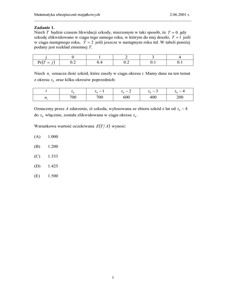 2.06.2001 r. ___________________________________________________________________________ Zadanie 1. Niech T T 0 gdy T 1 T 2 T. j Pr T j 0 0.2 1 0.4 2 0.2 3 0.1 4 0.1 Niech nt t. Mamy dane na ten temat z okresu t 0 oraz kilku okresów poprzednich: t t0 700 nt t0 1 700 t0 2 600 t0 3 400 t0 4 200 Oznaczmy przez A zdarzenie, t 0 4 do t 0 t 0 . E T A wynosi: (A) 1.000 (B) 1.200 (C) 1.333 (D) 1.425 (E) 1.500 1 2.06.2001 r. ___________________________________________________________________________ Zadanie 2. n-ty rok W ! n wzorem: n Pr Wn k k 1 p q , k 0, 1, 2, , 1 gdzie p q , 2 a zmienne W1 , W2 , 2 k " #adjustment copefficient) R wynosi: (A) 2 3 ln 4 (B) 1 3 ln 2 (C) 1 ln 3 2 (D) 1 5 ln 2 (E) 2 5 ln 4 2 2.06.2001 r. ___________________________________________________________________________ Zadanie 3. Y 0, 10 . !X zdefiniowanej jako: X Y 5 wynosi: (A) 25/6 (B) 25/16 (C) 125/48 (D) 125/36 (E) 125/24 3 2.06.2001 r. ___________________________________________________________________________ Zadanie 4. Uproszczony model " T. Kredyt w kwocie K # 0, T , t 0, T wynosi: 1 exp T t , gdzie balancet K 1 exp T Warto t balancet . "$ q %& jednostajnym na 0, T . Oznaczmy przez P % &R T '( . 2 )* 20% oraz T 5 ( pomiaru czasu w obu przypadkach jest rok) to stosunek (A) 50% (B) 46% (C) 41% (D) 34% (E) 29% R * P 4 2.06.2001 r. ___________________________________________________________________________ Zadanie 5. + " ,- . %& /--0ciel pokrywa %M&1 M 0 23x Pr M x 1 exp(0.05) 2 x wynosi: (A) 700 (B) 600 (C) 500 (D) 400 (E) 300 5 2.06.2001 r. ___________________________________________________________________________ Zadanie 6. + " /4!. %& /--0zpieczyciel %M&1 M 0 2 E M wynosi: (A) 19.05 (B) 18.00 (C) 16.95 (D) 15.90 (E) 14.85 – 6 2.06.2001 r. ___________________________________________________________________________ Zadanie 7. Porównujemy wariancje dwóch zmiennych: S1 i S 2 . Zmienna S1 N 1 N 2 ... N 10 #/- .. N i parametrach 1, qi $ qi * q 10 i 1 q 1, 2 i gdzie: 1 10 i 1 q i . 10 Zmienna S 2 Q q parametrach 10, q Q 1 q . 10 5 VARS 2 VAR S1 wynosi: q (A) 0 (B) 1 (C) 8 (D) 9 (E) 10 7 2.06.2001 r. ___________________________________________________________________________ Zadanie 8. 2 N t w roku t%q parametru ryzyka Q& 6 1, q Q w populacji ubezpieczo. * Pr Q 1 0.01 5 3 dla x 0, 1 1 x f Q x 0.99 1 4 7 $ %--/& # przedziale 0, 1 Q jest dla danego ubezpieczonego niezmienna w kolejnych latach, a zmienne N t "$ '# ( ... %&* (A) 0.261 (B) 0.231 (C) 0.200 (D) 0.165 (E) 0.132 8 2.06.2001 r. ___________________________________________________________________________ Zadanie 9. 8 ej szkody X ponad d jest dla wszystkich d. 1, 2 dana wzorem: 2 1 1 E X d d d 2 d 3 . 3 2 12 2 .. E X * (A) 1 4 , 2 3 (B) 1 4 , 13 12 (C) 1 3 , 13 12 (D) 1 3 , 2 3 (E) 2 3 , 13 12 9 2.06.2001 r. ___________________________________________________________________________ Zadanie 10. " * U t ct S N t , , gdzie ct . momentu t, N t " , n S n Yi * i 1 Yi cesu N t , o 0, 10 . Niech T inf t 0 : U t 0 " * c 60 , 10 . "$ # 9* Pr T , U T 4 wynosi: (A) 0.50 (B) 0.45 (C) 0.36 (D) 0.30 (E) 0.25 10 2.06.2001 r. ___________________________________________________________________________ Egzamin dla Aktuariuszy z 2 czerwca 2001 r. Arkusz odpowiedzi* + ................ K L U C Z O D P O W I E D Z I ...................................... Pesel ........................................... Zadanie nr 1 2 3 4 5 6 7 8 9 10 * 13 B D C E B A E A C D Punktacja $ Arkuszu odpowiedzi. % &!" 11