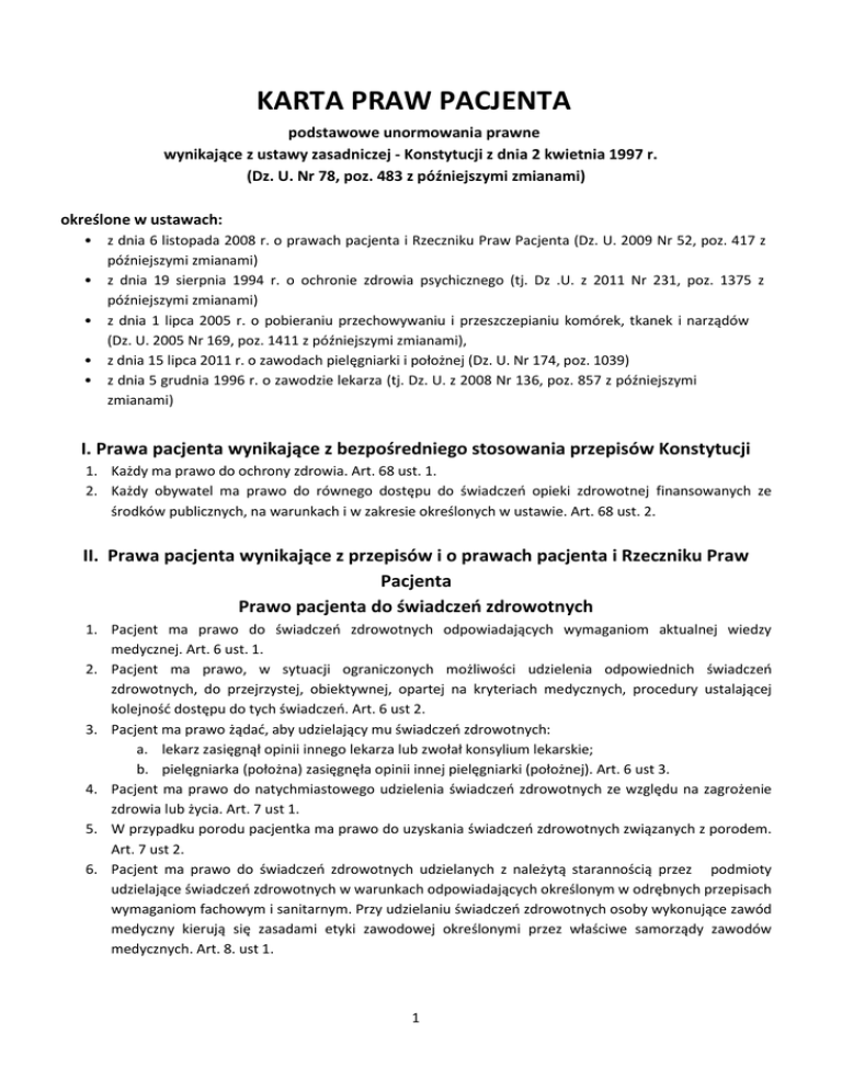 KARTA PRAW PACJENTA podstawowe unormowania prawne wynikające z ustawy zasadniczej - Konstytucji z dnia 2 kwietnia 1997 r. (Dz. U. Nr 78, poz. 483 z późniejszymi zmianami) określone w ustawach: • z dnia 6 listopada 2008 r. o prawach pacjenta i Rzeczniku Praw Pacjenta (Dz. U. 2009 Nr 52, poz. 417 z późniejszymi zmianami) • z dnia 19 sierpnia 1994 r. o ochronie zdrowia psychicznego (tj. Dz .U. z 2011 Nr 231, poz. 1375 z późniejszymi zmianami) • z dnia 1 lipca 2005 r. o pobieraniu przechowywaniu i przeszczepianiu komórek, tkanek i narządów (Dz. U. 2005 Nr 169, poz. 1411 z późniejszymi zmianami), • z dnia 15 lipca 2011 r. o zawodach pielęgniarki i położnej (Dz. U. Nr 174, poz. 1039) • z dnia 5 grudnia 1996 r. o zawodzie lekarza (tj. Dz. U. z 2008 Nr 136, poz. 857 z późniejszymi zmianami) I. Prawa pacjenta wynikające z bezpośredniego stosowania przepisów Konstytucji 1. Każdy ma prawo do ochrony zdrowia. Art. 68 ust. 1. 2. Każdy obywatel ma prawo do równego dostępu do świadczeo opieki zdrowotnej finansowanych ze środków publicznych, na warunkach i w zakresie określonych w ustawie. Art. 68 ust. 2. II. Prawa pacjenta wynikające z przepisów i o prawach pacjenta i Rzeczniku Praw Pacjenta Prawo pacjenta do świadczeo zdrowotnych 1. Pacjent ma prawo do świadczeo zdrowotnych odpowiadających wymaganiom aktualnej wiedzy medycznej. Art. 6 ust. 1. 2. Pacjent ma prawo, w sytuacji ograniczonych możliwości udzielenia odpowiednich świadczeo zdrowotnych, do przejrzystej, obiektywnej, opartej na kryteriach medycznych, procedury ustalającej kolejnośd dostępu do tych świadczeo. Art. 6 ust 2. 3. Pacjent ma prawo żądad, aby udzielający mu świadczeo zdrowotnych: a. lekarz zasięgnął opinii innego lekarza lub zwołał konsylium lekarskie; b. pielęgniarka (położna) zasięgnęła opinii innej pielęgniarki (położnej). Art. 6 ust 3. 4. Pacjent ma prawo do natychmiastowego udzielenia świadczeo zdrowotnych ze względu na zagrożenie zdrowia lub życia. Art. 7 ust 1. 5. W przypadku porodu pacjentka ma prawo do uzyskania świadczeo zdrowotnych związanych z porodem. Art. 7 ust 2. 6. Pacjent ma prawo do świadczeo zdrowotnych udzielanych z należytą starannością przez podmioty udzielające świadczeo zdrowotnych w warunkach odpowiadających określonym w odrębnych przepisach wymaganiom fachowym i sanitarnym. Przy udzielaniu świadczeo zdrowotnych osoby wykonujące zawód medyczny kierują się zasadami etyki zawodowej określonymi przez właściwe samorządy zawodów medycznych. Art. 8. ust 1. 1 Prawo pacjenta do informacji 1. Pacjent ma prawo do informacji o swoim stanie zdrowia. Art. 9. ust 1. 2. Pacjent, w tym małoletni, który ukooczył 16 lat, lub jego ustawowy przedstawiciel mają prawo do uzyskania od lekarza przystępnej informacji o stanie zdrowia pacjenta, rozpoznaniu, proponowanych oraz możliwych metodach diagnostycznych i leczniczych, dających się przewidzied następstwach ich zastosowania albo zaniechania, wynikach leczenia oraz rokowaniu. Art. 9. ust 2. 3. Pacjent lub jego ustawowy przedstawiciel mają prawo do wyrażenia zgody na udzielenie informacji wymienionych w punkcie 2 innym osobom. Art. 9. ust 3. 4. Pacjent ma prawo żądad, aby lekarz nie udzielił mu informacji, o której mowa w punkcie 2 Art. 9. ust 4. 5. Po uzyskaniu informacji, o których mowa w punkcie 2, pacjent ma prawo przedstawid lekarzowi swoje zdanie w tym zakresie. Art. 9. ust 5. 6. W przypadku określonym w art. 31 ust. 4 ustawy z dnia 5 grudnia 1996 r. o zawodach lekarza i lekarza dentysty (Dz. U. z 2008 r. Nr 136, poz. 857), pacjent ma prawo żądad, aby lekarz udzielił mu informacji, o której mowa w ust. 2, w pełnym zakresie. Art. 9. ust 6. 7. Pacjent małoletni, który nie ukooczył 16 lat, ma prawo do uzyskania od lekarza informacji, o których mowa w punkcie 2, w zakresie i formie potrzebnej do prawidłowego przebiegu procesu diagnostycznego lub terapeutycznego. Art. 9. ust 7. 8. Pacjent, w tym małoletni, który ukooczył 16 lat, lub jego ustawowy przedstawiciel mają prawo do uzyskania od pielęgniarki, położnej przystępnej informacji o jego pielęgnacji i zabiegach pielęgniarskich Art. 9. ust 8. 9. W przypadku, o którym mowa w art. 38 ust. 1 ustawy z dnia 5 grudnia 1996 r. o zawodach lekarza i lekarza dentysty, pacjent, jego przedstawiciel ustawowy lub opiekun faktyczny mają prawo do dostatecznie wczesnej informacji o zamiarze odstąpienia przez lekarza od leczenia pacjenta i wskazania przez tego lekarza możliwości uzyskania świadczenia zdrowotnego u innego lekarza lub podmiotu udzielającego świadczeo zdrowotnych. Art. 10. 10. Pacjent ma prawo do informacji o rodzaju i zakresie świadczeo zdrowotnych udzielanych przez podmiot udzielający świadczeo zdrowotnych, w tym o profilaktycznych programach zdrowotnych finansowanych ze środków publicznych, realizowanych przez ten podmiot Art. 12. Prawo pacjenta do tajemnicy informacji z nim związanych 1. Pacjent ma prawo do zachowania w tajemnicy przez osoby wykonujące zawód medyczny, w tym udzielające mu świadczeo zdrowotnych, informacji z nim związanych, a uzyskanych w związku z wykonywaniem zawodu medycznego, za wyjątkiem w przypadku gdy. Art. 13.: a. tak stanowią przepisy odrębnych ustaw. Art. 14. ust 2.1 b. zachowanie tajemnicy może stanowid niebezpieczeostwo dla życia lub zdrowia pacjenta lub innych osób. Art. 14. ust 2.2 c. pacjent lub jego przedstawiciel ustawowy wyraża zgodę na ujawnienie tajemnicy. Art. 14. ust 2.3 d. zachodzi potrzeba przekazania niezbędnych informacji o pacjencie związanych z udzielaniem świadczeo zdrowotnych innym osobom wykonującym zawód medyczny, uczestniczącym w udzielaniu tych świadczeo. Art. 14. ust 2.4.2 Prawo pacjenta do wyrażenia zgody na udzielenie świadczeo zdrowotnych 1. Pacjent ma prawo do wyrażenia zgody na udzielenie określonych świadczeo zdrowotnych lub odmowy takiej zgody, po uzyskaniu informacji w zakresie określonym w punktach 1-8