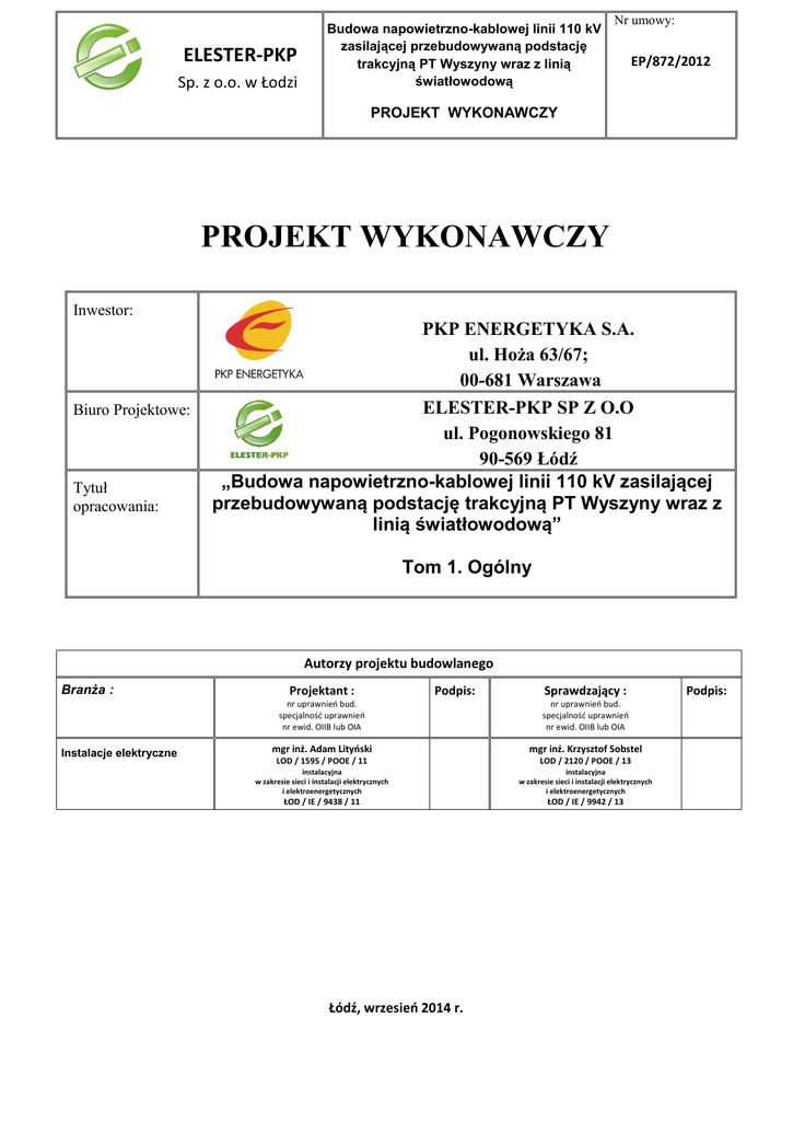 ELESTER-PKP Sp. z o.o. w Łodzi Budowa napowietrzno-kablowej linii 110 kV zasilającej przebudowywaną podstację trakcyjną PT Wyszyny wraz z linią światłowodową Nr umowy: EP/872/2012 PROJEKT WYKONAWCZY PROJEKT WYKONAWCZY Inwestor: Biuro Projektowe: Tytuł opracowania: PKP ENERGETYKA S.A. ul. Hoża 63/67; 00-681 Warszawa ELESTER-PKP SP Z O.O ul. Pogonowskiego 81 90-569 Łódź „Budowa napowietrzno-kablowej linii 110 kV zasilającej przebudowywaną podstację trakcyjną PT Wyszyny wraz z linią światłowodową” Tom 1. Ogólny Autorzy projektu budowlanego Branża : Instalacje elektryczne Projektant : Podpis: Sprawdzający : nr uprawnień bud. specjalność uprawnień nr ewid. OIIB lub OIA nr uprawnień bud. specjalność uprawnień nr ewid. OIIB lub OIA mgr inż. Adam Lityński mgr inż. Krzysztof Sobstel LOD / 1595 / POOE / 11 LOD / 2120 / POOE / 13 instalacyjna w zakresie sieci i instalacji elektrycznych i elektroenergetycznych instalacyjna w zakresie sieci i instalacji elektrycznych i elektroenergetycznych ŁOD / IE / 9438 / 11 ŁOD / IE / 9942 / 13 Łódź, wrzesień 2014 r. Podpis: ELESTER-PKP Sp. z o.o. w Łodzi Budowa napowietrznej linii 110kV zasilającej przebudowywaną podstację Nr umowy: trakcyjna Wyszyny EP/872/2012 PROJEKT WYKONAWCZY SPIS TREŚCI 1. Podstawa opracowania ........................................................................................ 2 2. Zakres opracowania ............................................................................................. 2 Opis techniczny 3. Wstęp ................................................................................................................... 3 4. Parametry techniczne projektowanej linii ........................................................... 4 5. Rozwiązania techniczne ...................................................................................... 4 5.1. Konstrukcje wsporcze ...................................................................................... 4 5.2. Zabezpieczenie konstrukcji wsporczej przed korozją ...................................... 5 5.3. Fundamenty ..................................................................................................... 5 5.4. Uziemienia słupów .......................................................................................... 5 5.5. Izolacja ............................................................................................................ 6 5.6. Przewody fazowe ............................................................................................ 6 5.7. Przewód odgromowy ....................................................................................... 6 5.8. Połączenie linii napowietrznej i kablowej ........................................................ 6 5.9. Oznakowanie linii ........................................................................................... 6 5.10. Uwagi końcowe ............................................................................................. 7 6. Obliczenia techniczne ......................................................................................... 7 6.1. Dobór przewodów fazowych do obciążeń długotrwałych .............................. 7 6.2. Dobór izolatorów do strefy zabrudzeniowej .................................................... 7 6.3. Sprawdzenie koordynacji przewodów fazowych i odgromowego ................... 7 7. Zbiorcze zestawienie materiałów ........................................................................ 8 8. Spis rysunków ..................................................................................................... 9 1 Budowa napowietrznej linii 110kV zasilającej przebudowywaną podstację Nr umowy: trakcyjna Wyszyny EP/872/2012 ELESTER-PKP Sp. z o.o. w Łodzi PROJEKT WYKONAWCZY 1. Podstawa opracowania - Umowa nr EP/872/2012 z dnia 01.08.2012r pomiędzy PKP Energetyka S.A Zakład Północny w Sopocie, Jana z Kolna 29 81-856 Sopot i Elester-PKP Sp. z o.o. z siedzibą w Łodzi, ul. Pogonowskiego 81 90-569 Łódź - Norma PN-EN-50341-3-22 – „Elektroenergetyczne linie napowietrzne prądu przemiennego powyżej 1kV”; - Aktualnie obowiązujące przepisy prawne. - Specyfikacja istotnych warunków zamówienia - Uzgodnień z inwestorem 2. Zakres opracowania Projekt swoim zakresem obejmuje budowę jednotorowej linii napowietrzno-kablowej 110 kV relacji istniejący GPZ Mława Olechinek - budowana bramka liniowa na terenie podstacji trakcyjnej. Zakres prac: - wykonanie fundamentów dla słupów 1-19; ustawienie rurowych konstrukcji wsporczych na stanowiskach jw.; zawieszenie przewodów fazowych wraz z łańcuchami izolatorowymi; zawieszenie przewodu odgromowego typu OPGW 70mm2 światłowodowych. 48włókiem Trasę projektowanego odcinka linii 110 kV pokazano na planie sytuacyjnym rys. kol. Nr 1 a profil podłużny znajduje się na rys. kol nr 2. 2 ELESTER-PKP Sp. z o.o. w Łodzi Budowa napowietrznej linii 110kV zasilającej przebudowywaną podstację Nr umowy: trakcyjna Wyszyny EP/872/2012 PROJEKT WYKONAWCZY OPIS TECHNICZNY 3. Wstęp Tematem niniejszego opracowania jest projekt wykonawczy budowy jednotorowej linii napowietrzno-kablowej 110 kV relacji istniejący GPZ Mława Olechinek – budowana bramka liniowa PT Wyszyny wraz z światłowodową linią teletechniczną. Projektowana linia jest projektowana na rurowych konstrukcjach słupowych posadowionych na stanowiskach słupowych wykonanych jako fundamenty studniowe. Linia prowadzona będzie 3 przewodami AFL6-240mm2 oraz przewodem OPGW 70mm2 w pionowym układzie przewodów oprócz przęsła między słupami 9-10 gdzie ze względu na przyszłe skrzyżowanie z drogą S7 projektuje się układ trójkątny przewodów. Pomiędzy słupami 12 – 13 znajduje się składowisko tłucznia po modernizacji linii kolejowej. Projekt zakłada jego rozgarnięcie bądź wywiezienie. Koszty tej operacji zostały ujęte w kosztorysie i przedmiarze prac. 4. Parametry technic