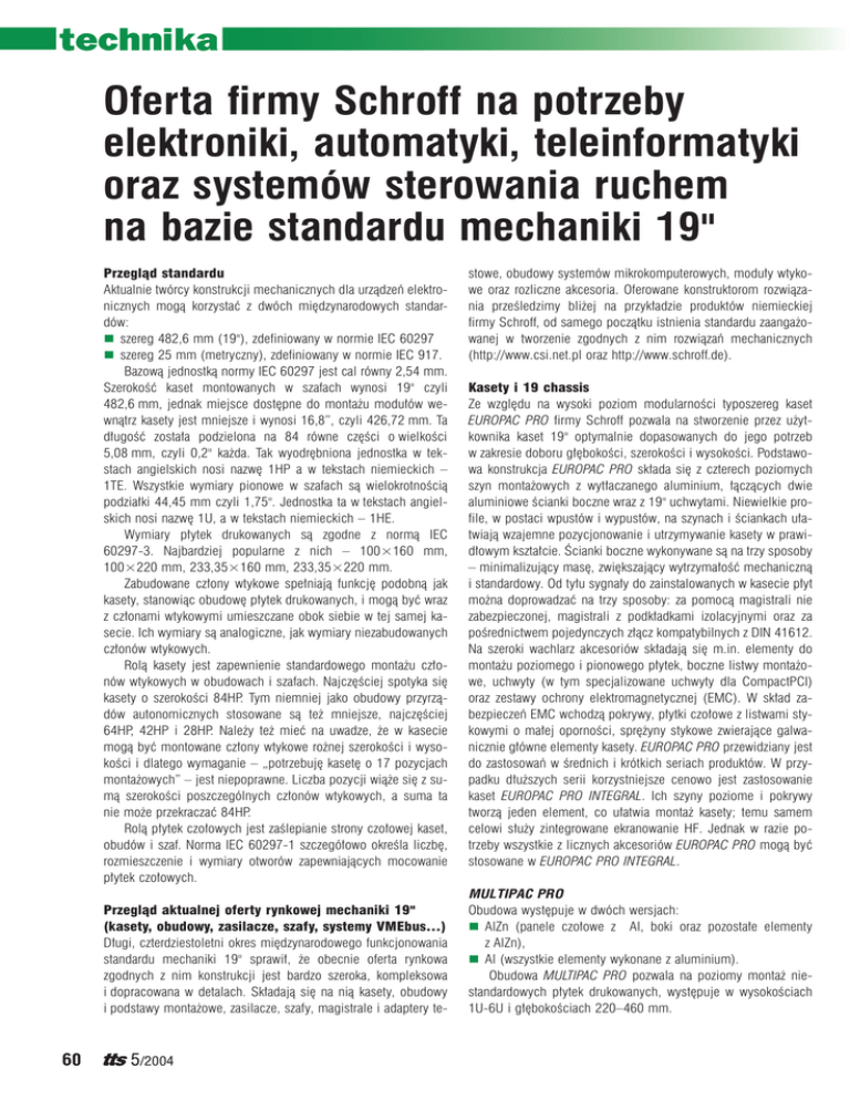 technika Oferta firmy Schroff na potrzeby elektroniki, automatyki, teleinformatyki oraz systemów sterowania ruchem na bazie standardu mechaniki 19" Przegląd standardu Aktualnie twórcy konstrukcji mechanicznych dla urządzeń elektronicznych mogą korzystać z dwóch międzynarodowych standardów: szereg 482,6 mm (19"), zdefiniowany w normie IEC 60297 szereg 25 mm (metryczny), zdefiniowany w normie IEC 917. Bazową jednostką normy IEC 60297 jest cal równy 2,54 mm. Szerokość kaset montowanych w szafach wynosi 19" czyli 482,6 mm, jednak miejsce dostępne do montażu modułów wewnątrz kasety jest mniejsze i wynosi 16,8”, czyli 426,72 mm. Ta długość została podzielona na 84 równe części o wielkości 5,08 mm, czyli 0,2" każda. Tak wyodrębniona jednostka w tekstach angielskich nosi nazwę 1HP a w tekstach niemieckich – 1TE. Wszystkie wymiary pionowe w szafach są wielokrotnością podziałki 44,45 mm czyli 1,75". Jednostka ta w tekstach angielskich nosi nazwę 1U, a w tekstach niemieckich – 1HE. Wymiary płytek drukowanych są zgodne z normą IEC 60297-3. Najbardziej popularne z nich – 100×160 mm, 100×220 mm, 233,35×160 mm, 233,35×220 mm. Zabudowane człony wtykowe spełniają funkcję podobną jak kasety, stanowiąc obudowę płytek drukowanych, i mogą być wraz z członami wtykowymi umieszczane obok siebie w tej samej kasecie. Ich wymiary są analogiczne, jak wymiary niezabudowanych członów wtykowych. Rolą kasety jest zapewnienie standardowego montażu członów wtykowych w obudowach i szafach. Najczęściej spotyka się kasety o szerokości 84HP. Tym niemniej jako obudowy przyrządów autonomicznych stosowane są też mniejsze, najczęściej 64HP, 42HP i 28HP. Należy też mieć na uwadze, że w kasecie mogą być montowane człony wtykowe rożnej szerokości i wysokości i dlatego wymaganie – „potrzebuję kasetę o 17 pozycjach montażowych” – jest niepoprawne. Liczba pozycji wiąże się z sumą szerokości poszczególnych członów wtykowych, a suma ta nie może przekraczać 84HP. Rolą płytek czołowych jest zaślepianie strony czołowej kaset, obudów i szaf. Norma IEC 60297-1 szczegółowo określa liczbę, rozmieszczenie i wymiary otworów zapewniających mocowanie płytek czołowych. Przegląd aktualnej oferty rynkowej mechaniki 19" (kasety, obudowy, zasilacze, szafy, systemy VMEbus…) Długi, czterdziestoletni okres międzynarodowego funkcjonowania standardu mechaniki 19" sprawił, że obecnie oferta rynkowa zgodnych z nim konstrukcji jest bardzo szeroka, kompleksowa i dopracowana w detalach. Składają się na nią kasety, obudowy i podstawy montażowe, zasilacze, szafy, magistrale i adaptery te- 60 5/2004 stowe, obudowy systemów mikrokomputerowych, moduły wtykowe oraz rozliczne akcesoria. Oferowane konstruktorom rozwiązania prześledzimy bliżej na przykładzie produktów niemieckiej firmy Schroff, od samego początku istnienia standardu zaangażowanej w tworzenie zgodnych z nim rozwiązań mechanicznych (http://www.csi.net.pl oraz http://www.schroff.de). Kasety i 19 chassis Ze względu na wysoki poziom modularności typoszereg kaset EUROPAC PRO firmy Schroff pozwala na stworzenie przez użytkownika kaset 19" optymalnie dopasowanych do jego potrzeb w zakresie doboru głębokości, szerokości i wysokości. Podstawowa konstrukcja EUROPAC PRO składa się z czterech poziomych szyn montażowych z wytłaczanego aluminium, łączących dwie aluminiowe ścianki boczne wraz z 19" uchwytami. Niewielkie profile, w postaci wpustów i wypustów, na szynach i ściankach ułatwiają wzajemne pozycjonowanie i utrzymywanie kasety w prawidłowym kształcie. Ścianki boczne wykonywane są na trzy sposoby – minimalizujący masę, zwiększający wytrzymałość mechaniczną i standardowy. Od tyłu sygnały do zainstalowanych w kasecie płyt można doprowadzać na trzy sposoby: za pomocą magistrali nie zabezpieczonej, magistrali z podkładkami izolacyjnymi oraz za pośrednictwem pojedynczych złącz kompatybilnych z DIN 41612. Na szeroki wachlarz akcesoriów składają się m.in. elementy do montażu poziomego i pionowego płytek, boczne listwy montażowe, uchwyty (w tym specjalizowane uchwyty dla CompactPCI) oraz zestawy ochrony elektromagnetycznej (EMC). W skład zabezpieczeń EMC wchodzą pokrywy, płytki czołowe z listwami stykowymi o małej oporności, sprężyny stykowe zwierające galwanicznie główne elementy kasety. EUROPAC PRO przewidziany jest do zastosowań w średnich i krótkich seriach produktów. W przypadku dłuższych serii korzystniejsze cenowo jest zastosowanie kaset EUROPAC PRO INTEGRAL. Ich szyny poziome i pokrywy tworzą jeden element, co ułatwia montaż kasety; temu samem celowi służy zintegrowane ekranowanie HF. Jednak w razie potrzeby wszystkie z licznych akcesoriów EUROPAC PRO mogą być stosowane w EUROPAC PRO INTEGRAL. MULTIPAC PRO Obudowa występuje w dwóch wersjach: AlZn (panele czołowe z Al, boki oraz pozostałe elementy z AlZn), Al (wszystkie elementy wykonane z aluminium). Obudowa MULTIPAC PRO pozwala na poziomy montaż niestandardowych płytek drukowanych, występuje w wysokościach 1U-6U i głębokościach 220–460 mm. technika Możliwość ekranowania EMC oraz stosowania szeregu komponentów z kasety EUROPAC PRO czynią ją niezwykle przydatną w specyficznych aplikacjach stosowanych w kolejnictwie. Warto również zwrócić uwagę na 19" kasetę typu INPAC, bardzo stabilną, do montażu płytek drukowanych i modułów standardu Euro. Obudowy Można je podzielić na dwie grupy: 1) przystosowane do bezpośredniego montażu 19" podzespołów i kaset: a) typ COMPTEC – wysokość 1U–12U, głębokość 300– –500 mm, IP20, budowa symetryczna, wersja desktop lub przenośna; b) typ CONCEPTLINE – obudowa przemysłowa, IP66, stabilna, regulowana głębokość montażu, wysokość 300– –800 mm, szerokość 250–600 mm, głębokość 150– –420 mm (obudowa przemysłową to również INLINE, która pr