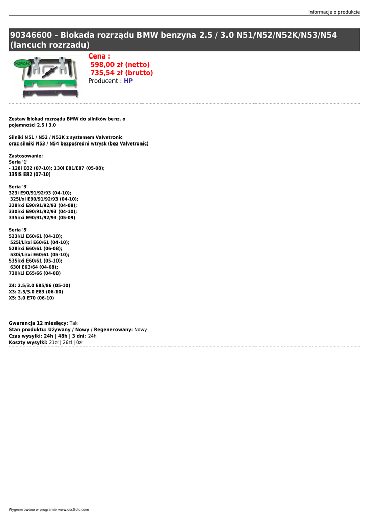 Informacje o produkcie 90346600 - Blokada rozrządu BMW benzyna 2.5 / 3.0 N51/N52/N52K/N53/N54 (łancuch rozrzadu) Cena : 598,00 zł (netto) 735,54 zł (brutto) Producent : HP Zestaw blokad rozrządu BMW do silników benz. o pojemności 2.5 i 3.0 Silniki N51 / N52 / N52K z systemem Valvetronic oraz silniki N53 / N54 bezpośredni wtrysk (bez Valvetronic) Zastosowanie: Seria '1' - 128i E82 (07-10); 130i E81/E87 (05-08); 135iS E82 (07-10) Seria '3' 323i E90/91/92/93 (04-10); 325i/xi E90/91/92/93 (04-10); 328i/xi E90/91/92/93 (04-08); 330i/xi E90/91/92/93 (04-10); 335i/xi E90/91/92/93 (05-09) Seria '5' 523i/Li E60/61 (04-10); 525i/Li/xi E60/61 (04-10); 528i/xi E60/61 (06-08); 530i/Li/xi E60/61 (05-10); 535i/xi E60/61 (05-10); 630i E63/64 (04-08); 730i/Li E65/66 (04-08) Z4: 2.5/3.0 E85/86 (05-10) X3: 2.5/3.0 E83 (06-10) X5: 3.0 E70 (06-10) Gwarancja 12 miesięcy: Tak Stan produktu: Używany / Nowy / Regenerowany: Nowy Czas wysyłki: 24h | 48h | 3 dni: 24h Koszty wysyłki: 21zł | 26zł | 0zł Wygenerowano w programie www.oscGold.com
