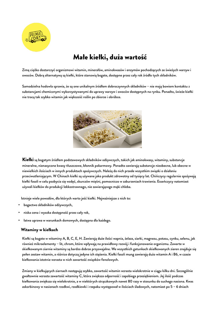 Małe kiełki, duża wartość Zimą ciężko dostarczyć organizmowi witamin, minerałów, aminokwasów i enzymów pochodzących ze świeżych warzyw i owoców. Dobrą alternatywą są kiełki, które stanowią bogate, dostępne przez cały rok źródło tych składników. Samodzielna hodowla sprawia, że są one unikalnym źródłem dobroczynnych składników – nie mają bowiem kontaktu z substancjami chemicznymi wykorzystywanymi do uprawy warzyw i owoców dostępnych na rynku. Ponadto, świeże kiełki nie tracą tak szybko witamin jak większość roślin po zbiorze i obróbce. Kiełki są bogatym źródłem podstawowych składników odżywczych, takich jak aminokwasy, witaminy, substancje mineralne, nienasycone kwasy tłuszczowe, błonnik pokarmowy. Ponadto zawierają substancje nieobecne, lub obecne w niewielkich ilościach w innych produktach spożywczych. Należą do nich przede wszystkim związki o działaniu przeciwutleniającym. W Chinach kiełki są używane jako produkt zdrowotny od tysięcy lat. Chińczycy regularnie spożywają kiełki fasoli w celu pozbycia się wzdęć, skurczów mięśni, pomocniczo w zaburzeniach trawienia. Esseńczycy natomiast używali kiełków do produkcji lekkostrawnego, nie zawierającego mąki chleba. Istnieje wiele powodów, dla których warto jeść kiełki. Najważniejsze z nich to: • bogactwo składników odżywczych, • niska cena i wysoka dostępność przez cały rok, • łatwa uprawa w warunkach domowych, dostępna dla każdego. Witaminy w kiełkach Kiełki są bogate w witaminy A, B, C, E, H. Zawierają duże ilości wapnia, żelaza, siarki, magnezu, potasu, cynku, selenu, jak również mikroelementy – lit, chrom, które wpływają na prawidłowy rozwój i funkcjonowanie organizmu. Zawarte w skiełkowanym ziarnie witaminy są bardzo dobrze przyswajalne. We wszystkich gatunkach skiełkowanych ziaren znajduje się pełen zestaw witamin, a różnice dotyczą jedyne ich stężenia. Kiełki fasoli mung zawierają dużo witamin A i B6, w czasie kiełkowania istotnie wzrasta w nich zawartość związków fenolowych. Zmiany w kiełkujących ziarnach następują szybko, zawartość witamin wzrasta wielokrotnie w ciągu kilku dni. Szczególnie gwałtownie wzrasta zawartość witaminy C, która zwiększa odporność i zapobiega przeziębieniom. Jej ilość podczas kiełkowania zwiększa się wielokrotnie, a w niektórych strączkowych nawet 80 razy w stosunku do suchego nasiona. Kwas askorbinowy w nasionach rzodkwi, rzodkiewki i rzepaku występował w ilościach śladowych, natomiast po 5 – 6 dniach kiełkowania jego zawartość wynosiła od 23,2 do 31,8 μmoli/g s.m. Oprócz witamin i pierwiastków śladowych skiełkowane ziarno zawiera dużo aminokwasów, np. w skiełkowanych nasionach lucerny znajdują się wszystkie aminokwasy egzogenne. Węglowodany i tłuszcze z kiełków są łatwiejsze do przyswojenia przez ludzki organizm. W żywych zarodkach jest także błonnik, enzymy, chlorofil i wiele innych składników. Skiełkowane ziarna są doskonałym źródłem makro- i mikroelementów, które chronią przed anemią, usuwają dolegliwości przewodu pokarmowego, wpływają korzystnie na cebulki włosów – a także, co znacznie bardziej istotne, na serce, skórę, nerwy i mózg. Pomagają także obniżyć poziom cholesterolu we krwi. Obok bogactwa mikroelementów kiełki zawierają enzymy, które ułatwiają przyswajanie pierwiastków śladowych przez organizm. W skiełkowanym ziarnie znajdują się również substancje smakowe, aromatyczne i zapachowe, aktywizujące enzymy trawienne, a także saponiny, flawonoidy i fitohormony, które mają korzystny wpływ na organizm. Białko roślinne pomaga odbudowywać komórki i tkanki. Zjadając dwie łyżki kiełków dziennie dostarczamy porcję niezbędnych: • witamin: A, B, C, E, PP, • soli mineralnych, • mikroelementów: mangan, cynk, wapń, fosfor, potas, magnez, • tłuszczów, • wartościowego białka, • błonnika, • hormonów roślinnych, • enzymów. Kiełki są również energetyczne i jednocześnie niskokaloryczne, dlatego wykorzystuje się je w dietach odchudzających. Lucerna Najważniejszym przedstawicielem kiełków jest lucerna, zwana również „królową ziaren”. Ludzie używali jej jako nawozu pod inne rośliny i jako paszy dla krów, aby zwiększyć ich mleczność. Żadna z odżywek chemicznych nie jest w stanie zapewnić tak idealnego zestawu witamin, pierwiastków śladowych i enzymów ułatwiających przyswajanie jak właśnie lucerna. Ułatwia ona nie tylko regenerację komórek narządów miąższowych, takich jak wątroba, śledziona czy trzustka, ale odbudowuje również florę jelita cienkiego, a szczególnie grubego. Olbrzymia ilość enzymów, witamin i mikroelementów sprawia, że te wszystkie wartości odżywcze są wchłaniane w całości. Hormony zawarte w lucernie stawiają ją w rzędzie leków stosowanych w chorobach układowych. Siedmiodniowe kiełki zawierają dużo chlorofilu, dzięki czemu zwiększa się ilość hemoglobiny, a zatem utlenienia naszego organizmu. Podsumowując, kiełki wielu roślin są bogatym źródłem podstawowych składników diety człowieka. Prócz tego zawierają wiele związków, które w innych produktach nie występują lub występują w mniejszych ilościach. Przemiany zachodzące w kiełkujących ziarnach są bardzo korzystne. Kiełki powinny być częścią diety osób odchudzających się, ponieważ zapewniają maksymalną ilość składników odżywczych przy minimalnej ilości kalorii. W skiełkowanym ziarnie znajdujemy więc witaminy, składniki mineralne, aminokwasy egzogenne i endogenne, dużą ilość kwasów nukleinowych, enzymy, błonnik (ten najlepszy, rozpuszczalny) i chlorofil.