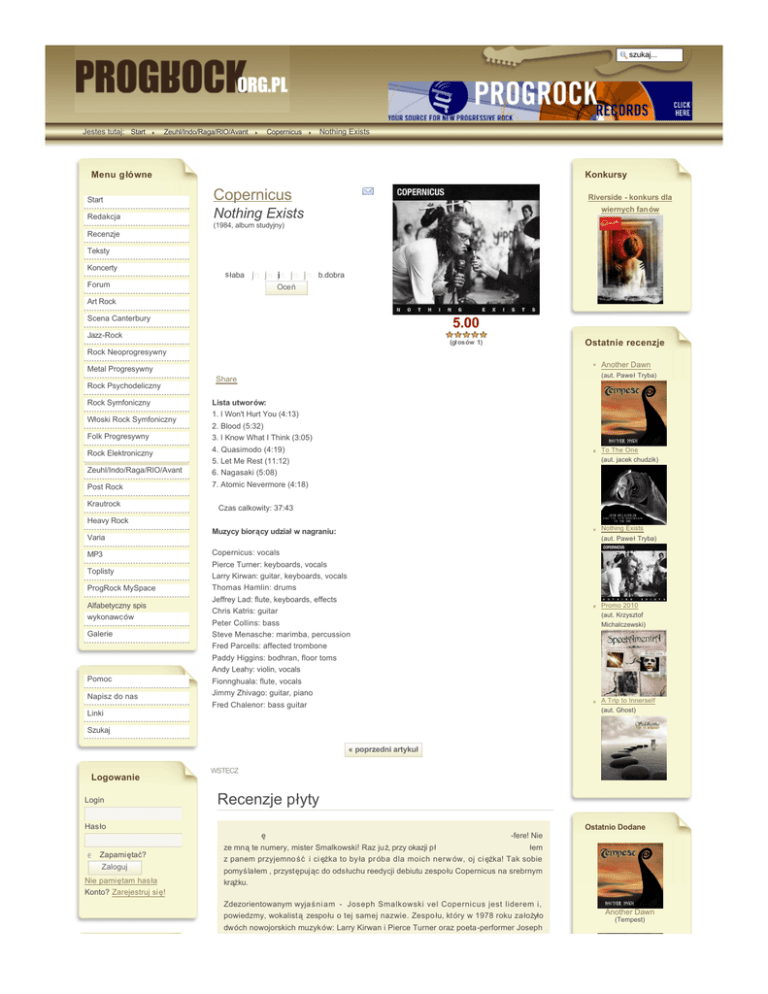 szukaj... Jestes tutaj: Start Zeuhl/Indo/Raga/RIO/Avant Copernicus Nothing Exists Menu g łówne Konkursy Start Copernicus Redakcja Nothing Exists Riverside - konkurs dla wiernych fanów (1984, album studyjny) Recenzje Teksty Koncerty słaba n j n k l m j m k l m n n i j k l j n k l m j b.dobra k l m Oceń Forum Art Rock Scena Canterbury 5.00 Jazz-Rock (gł osów 1) Ostatnie recenzje Rock Neoprogresywny Another Dawn Metal Progresywny Rock Psychodeliczny Rock Symfoniczny Zeuhl/Indo/Raga/RIO/Avant Lista utworów: 1. I Won't Hurt You (4:13) 2. Blood (5:32) 3. I Know What I Think (3:05) 4. Quasimodo (4:19) 5. Let Me Rest (11:12) 6. Nagasaki (5:08) Post Rock 7. Atomic Nevermore (4:18) Krautrock Czas calkowity: 37:43 Włoski Rock Symfoniczny Folk Progresywny Rock Elektroniczny (aut. Pawe ł Tryba) Share To The One (aut. jacek chudzik) Heavy Rock Varia MP3 Toplisty ProgRock MySpace Alfabetyczny spis wykonawców Galerie Pomoc Napisz do nas Linki Nothing Exists (aut. Pawe ł Tryba) Muzycy biorący udział w nagraniu: Copernicus: vocals Pierce Turner: keyboards, vocals Larry Kirwan: guitar, keyboards, vocals Thomas Hamlin: drums Jeffrey Lad: flute, keyboards, effects Chris Katris: guitar Peter Collins: bass Steve Menasche: marimba, percussion Fred Parcells: affected trombone Paddy Higgins: bodhran, floor toms Andy Leahy: violin, vocals Fionnghuala: flute, vocals Jimmy Zhivago: guitar, piano Fred Chalenor: bass guitar Promo 2010 (aut. Krzysztof Michalczewski) A Trip to Innerself (aut. Ghost) Szukaj « poprzedni artykuł Logowanie Login WSTECZ Recenzje płyty Has ło c Zapamiętać? d e f g Zaloguj Nie pamiętam hasła Konto? Zarejestruj się! Ostatnio Dodane -fere! Nie ę ze mną te numery, mister Smalkowski! Raz już, przy okazji pł łem z panem przyjemno ść i ci ężka to by ła pr óba dla moich nerw ów, oj ci ężka! Tak sobie pomyślałem , przystępując do odsłuchu reedycji debiutu zespołu Copernicus na srebrnym krążku. Zdezorientowanym wyja śniam - Joseph Smalkowski vel Copernicus jest liderem i, powiedzmy, wokalist ą zespołu o tej samej nazwie. Zespo łu, który w 1978 roku za łożyło Koncerty dwóch nowojorskich muzyk ów: Larry Kirwan i Pierce Turner oraz poeta-performer Joseph Smalkowski, z wygl ądu faktycznie trochę podobny do faceta ze starych tysi ączłotówek. Kirwan i Turner w materia łach promocyjnych określani są (kto jest kim - nie wiem i nie chc ę wiedzieć, tym bardziej nie chc ę znać szczegółów poczęcia), ale i tak wszystko robione by ło pod Copernicusa - człowieka, kt óry chciał porywać tłumy i kt órego idee fixe by ła fizyka kwantowa i jej wpływ na szarego obywatela. Another Dawn (Tempest) Konto? Zarejestruj się! Zdezorientowanym wyja śniam - Joseph Smalkowski vel Copernicus jest liderem i, powiedzmy, wokalist ą zespołu o tej samej nazwie. Zespo łu, który w 1978 roku za łożyło Koncerty dwóch nowojorskich muzyk ów: Larry Kirwan i Pierce Turner oraz poeta-performer Joseph Smalkowski, z wygl ądu faktycznie trochę podobny do faceta ze starych tysi ączłotówek. Kirwan i Turner w materia łach promocyjnych określani są (kto jest kim - nie wiem i nie chc ę wiedzieć, tym bardziej nie chc ę znać szczegółów poczęcia), ale i tak wszystko robione by ło pod Copernicusa - człowieka, kt óry chciał porywać tłumy i kt órego idee fixe by ła fizyka kwantowa i jej wpływ na szarego obywatela. Jakiś rok temu zetknąłem si ę z ostatnią jak dotąd płytą Copernicus, na której Smalkowski też bredził coś o atomach i jeszcze mniejszych cząsteczkach. Od trzydziestu dwóch lat ten sam temat - samozaparcie czy już obsesja? Pamiętam, ż ł we mnie bardzo mieszane uczucia wielki by ł na nim rozziew mi ędzy topornymi lirykami i skrzekiem Smalkowskiego a naprawdę ciekawymi improwizacjami kilkudziesi ęcioosobowej grupy muzyk ów pod kierownictwem Turnera. Wali łem g łową w ścianę modl ąc si ę o wersj ę karaoke. A jednak raz na jaki ś czas zdarzało mi si łuchać. Dlatego z jak ąś masochistyczną ciekawością zgłosi łem si ę Co si ę okazuje? Że mi łe z łego pocz ątki. Wydana w 1984 roku p łyta prezentuje zespół Copernicus jeszcze nie a ż tak dufny w swoją siłę, skromniejszy. I dzięki temu właśnie jest Another Dawn (Tempest) Seventh Story (Fromuz) Option Paralysis (Dillinger Escape Plan, The) to muzyka zdecydowanie lepiej przyswajalna. śnik, który w 1984 roku jeszcze dominowa ł, wymagał kondensacji materia łu, wybierania tego, co najlepsze i wycinania d łużyzn. Nie u świadczymy tu dwudziestominutowych potwor ów, w kt órych Smalkowski X razy recytuje to samo s łowo. Jest konkret, samo g ęste. No i rzuca si ę w uszy różnica w brzmieniu zespo łu - dużo maj ą tu do powiedzenia klawisze, co w latach 80tch było na porz ądku dziennym i dodawa ło muzyce Copernicus komercyjnego szlifu. Może i listy przebojów si ę tym nowojorskim odmie ńcom marzyły? Ale już wtedy za plecami mia ł Copernicus poza dwoma sta łymi kompanami ca ł ą rzeszę instrumentalist ów. Naliczyłem 13 os ób, opr ócz standardowego rockowego instrumentarium obs ługujących także flet, marimbę, puzon, skrzypce czy bodhran. Skoro już mówimy o atomowej zagładzie, t o n i e c h n a s c e n i e t e ż będzie wielkie BUM! Kola ż stylów, kt óry serwuj ą nam akompaniatorzy szalonego poety, jest doprawdy szeroki. Co ś z jazzu, co ś z muzyki klasycznej, mnóstwo wszelkich odcieni rocka i naprawd ę nie wiadomo, co wydarzy si ę za ę ma sporo do Scabdates (Mars Volta, The) Year of the Black Rainbow (Coheed & Cambria) zaoferowania. Wsp ółpracujemy z że nadawałoby się do prezentacji w radio. Zapami ętywalna zagrywka keyboardu, słodkie chórki i lider melorecytujący bez tej swojej rozpaczliwej maniery, za to nami ę Zapatrzyli si ę w Barry'ego White'a? Nawet je śli, to fajnie im wysz ł ż bardziej typowe spoken word, ale te ż nie najgorsze. Atonalne zagrywki klawiszy i fortepianu, Otwierają ete