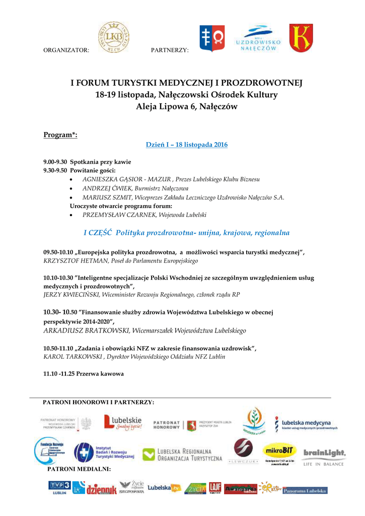 ORGANIZATOR: PARTNERZY: I FORUM TURYSTKI MEDYCZNEJ I PROZDROWOTNEJ 18-19 listopada, Nałęczowski Ośrodek Kultury Aleja Lipowa 6, Nałęczów Program*: Dzień I – 18 listopada 2016 9.00-9.30 Spotkania przy kawie 9.30-9.50 Powitanie gości: AGNIESZKA GĄSIOR - MAZUR , Prezes Lubelskiego Klubu Biznesu ANDRZEJ ĆWIEK, Burmistrz Nałęczowa MARIUSZ SZMIT, Wiceprezes Zakładu Leczniczego Uzdrowisko Nałęczów S.A. Uroczyste otwarcie programu forum: PRZEMYSŁAW CZARNEK, Wojewoda Lubelski I CZĘŚĆ Polityka prozdrowotna- unijna, krajowa, regionalna 09.50-10.10 „Europejska polityka prozdrowotna, a możliwości wsparcia turystki medycznej”, KRZYSZTOF HETMAN, Poseł do Parlamentu Europejskiego 10.10-10.30 ”Inteligentne specjalizacje Polski Wschodniej ze szczególnym uwzględnieniem usług medycznych i prozdrowotnych”, JERZY KWIECIŃSKI, Wiceminister Rozwoju Regionalnego, członek rządu RP 10.30- 10.50 ”Finansowanie służby zdrowia Województwa Lubelskiego w obecnej perspektywie 2014-2020”, ARKADIUSZ BRATKOWSKI, Wicemarszałek Województwa Lubelskiego 10.50-11.10 „Zadania i obowiązki NFZ w zakresie finansowania uzdrowisk”, KAROL TARKOWSKI , Dyrektor Wojewódzkiego Oddziału NFZ Lublin 11.10 -11.25 Przerwa kawowa PATRONI HONOROWI I PARTNERZY: PATRONI MEDIALNI: ORGANIZATOR: PARTNERZY: II CZĘŚĆ Modele i kierunki rozwoju turystyki medycznej 11.25-11.35 Turystyka medyczna jako przejaw trendów XXI wieku DR ANNA BIAŁK - WOLF , Przedstawiciel Wyższej Szkoły Hotelarstwa i Turystyki w Gdańsku 11.35-11.55 ,,Wybrane modele turystyki medycznej w krajach UE. Możliwości implementacji w Polsce”, MARIUSZ ARENT, Przedstawiciel Instytut Badań i Rozwoju Turystyki Medycznej w Gdańsku 11.55-12.10 ,,Doświadczenia Szpitala Klinicznego nr 4 w Lublinie w rozwiazywaniu problemów zdrowotnych pacjentów zagranicznych”, DR N. MED. MARIAN PRZYLEPA, Dyrektor Samodzielny Publiczny Szpital Kliniczny nr 4 w Lublinie 12.10-12.25 „Doświadczenia szpitala w obsłudze małego pacjenta zagranicznego”, DR N. MED. JERZY SZARECKI, Dyrektor Naczelny Uniwersytecki Szpital Dziecięcy w Lublinie III CZĘŚĆ Rola Samorządu w kreowaniu marki uzdrowisk i turystyki prozdrowotnej 12.25-12.40 „Perspektywy rozwoju lecznictwa uzdrowiskowego w Nałęczowie”, STANISŁAW GIL, Przewodniczący Rady Nadzorczej Izby Gospodarczej "Uzdrowiska Polskie”, Sanatorium Uzdrowiskowe Rolnik w Nałęczowie 12.40-12.55 „Współpraca w budowaniu destynacji Lublina jako kluczowy element sukcesu na rynku turystyki medycznej”, DR KRZYSZTOF ŻUK, Prezydent Miasta Lublin 12.55-13.410 „Zarządzanie uzdrowiskiem. Kreowanie marki”, MARIUSZ SZMIT, Prezes Zakładu Leczniczego Uzdrowisko Nałęczów S.A. 13.10-13.40 ,Rola Samorządów w kreowaniu marki uzdrowisk i turystyki prozdrowotnej”, ANDRZEJ ĆWIEK, Burmistrz Nałęczowa 13.40-14.30 LUNCH PATRONI HONOROWI I PARTNERZY: PATRONI MEDIALNI: ORGANIZATOR: PARTNERZY: IV CZĘŚĆ Zadbaj o zdrowie! 14.30-14.40 „Aktywność fizyczna i dieta, a sukces osobisty” JUSTYNA MARCINIAK, pięciokrotna Mistrzyni Świata w Karate Tradycyjnym 14.40-15.40 „Zadbaj o zdrowie sam . Naturalna ochrona przed chorobami cywilizacyjnymi”, RYSZARD GRZEBYK , Ekspert z zakresu dietetyki , naturalnego wspomagania sił witalnych, Kanada V CZĘŚĆ Panel dyskusyjny. Uzdrowiska i turystyka prozdrowotna - faktory rozwoju destynacji regionalnych 15.40-16.40 ,,Rola Lubelskiej Regionalnej Organizacji Turystycznej we wspieraniu rozwoju turystyki medycznej i prozdrowotnej”, DARIUSZ DONICA, Prezes Lubelska Regionalna Organizacja Turystyczna „Generowanie ruchu turystycznego poprzez inwestycje prozdrowotne”, PAWEŁ PATRZAŁEK, Dyrektor Malinowe Hotele Sp. z o.o. , Solec Zdrój ”Barometr Turystyczny”, IWONA EWA HAPONIUK, Dyrektor Wydział Turystyki i Sportu , Urząd Miasta Lublin „Specyfika uzdrowisk Polski Wschodniej. Nowe trendy w turystyce uzdrowiskowej”, DR ADAM KULCZYCKI , Instytut Socjologii Uniwersytet Rzeszowski WIESŁAW CZERNIEC, Wiceprezes Prezes Zarządu Lokalnej Organizacji Turystycznej "Kraina Lessowych Wąwozów" KAZIMIERZ MISZTAL, Burmistrz Krasnobrodu ZBIGNIEW PYCZKO, Wójt Gminy Biszcza PATRONI HONOROWI I PARTNERZY: PATRONI MEDIALNI: ORGANIZATOR: PARTNERZY: Dzień II – 19 listopada 2016 Miejsce: Termy Pałacowe Nałęczowianka 09.00-11.00 Warsztaty MARKETING UZDROWISKA : ,,Jak stworzyć i wypromować produkt uzdrowiska”, PIOTR MAZUR, PMG Consulting Sp. z o. o. „Budowanie Marki uzdrowiska”, MARIUSZ SZMIT, Wiceprezes Zakładu Leczniczego Uzdrowisko Nałęczów S.A. „Znaczenie komunikacji z mediami w budowaniu marki”, DR ADAM KULCZYCKI , Instytut Socjologii Uniwersytet Rzeszowski 11.00 – 13.00 Zwiedzanie Uzdrowiska Nałęczów PATRONI HONOROWI I PARTNERZY: PATRONI MEDIALNI: