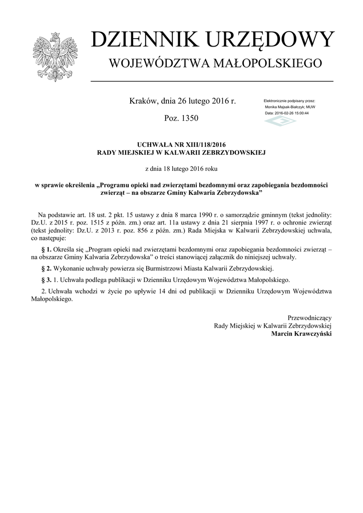 DZIENNIK URZĘDOWY WOJEWÓDZTWA MAŁOPOLSKIEGO Kraków, dnia 26 lutego 2016 r. Elektronicznie podpisany przez: Monika Majsak-Białczyk; MUW Data: 2016-02-26 15:00:44 Poz. 1350 UCHWAŁA NR XIII/118/2016 RADY MIEJSKIEJ W KALWARII ZEBRZYDOWSKIEJ z dnia 18 lutego 2016 roku w sprawie określenia „Programu opieki nad zwierzętami bezdomnymi oraz zapobiegania bezdomności zwierząt – na obszarze Gminy Kalwaria Zebrzydowska” Na podstawie art. 18 ust. 2 pkt. 15 ustawy z dnia 8 marca 1990 r. o samorządzie gminnym (tekst jednolity: Dz.U. z 2015 r. poz. 1515 z późn. zm.) oraz art. 11a ustawy z dnia 21 sierpnia 1997 r. o ochronie zwierząt (tekst jednolity: Dz.U. z 2013 r. poz. 856 z późn. zm.) Rada Miejska w Kalwarii Zebrzydowskiej uchwala, co następuje: § 1. Określa się „Program opieki nad zwierzętami bezdomnymi oraz zapobiegania bezdomności zwierząt – na obszarze Gminy Kalwaria Zebrzydowska” o treści stanowiącej załącznik do niniejszej uchwały. § 2. Wykonanie uchwały powierza się Burmistrzowi Miasta Kalwarii Zebrzydowskiej. § 3. 1. Uchwała podlega publikacji w Dzienniku Urzędowym Województwa Małopolskiego. 2. Uchwała wchodzi w życie po upływie 14 dni od publikacji w Dzienniku Urzędowym Województwa Małopolskiego. Przewodniczący Rady Miejskiej w Kalwarii Zebrzydowskiej Marcin Krawczyński Dziennik Urzędowy Województwa Małopolskiego –2– Poz. 1350 Załącznik do Uchwały Nr XIII/118/2016 Rady Miejskiej w Kalwarii Zebrzydowskiej z dnia 18 lutego 2016 r. PROGRAM OPIEKI NAD ZWIERZĘTAMI BEZDOMNYMI ORAZ ZAPOBIEGANIA BEZDOMNOŚCI ZWIERZĄT – NA OBSZARZE GMINY KALWARIA ZEBRZYDOWSKA § 1. Postanowienia ogólne 1. Zgodnie z ustawą z dnia 21 sierpnia 1997 r. o ochronie zwierząt (tekst jednolity: Dz.U. z 2013 r. poz. 856 z późn. zm.) zapewnienie opieki bezdomnym zwierzętom oraz ich wyłapywanie należy do zadań własnych gmin. Rada Miejska w Kalwarii Zebrzydowskiej wypełniając obowiązek, o którym mowa w art.11 ust.1 Ustawy o ochronie zwierząt określa, w drodze uchwały corocznie do dnia 31 marca, program opieki nad zwierzętami bezdomnymi oraz zapobiegania bezdomności zwierząt. 2. Program ma zastosowanie do wszystkich zwierząt domowych, jak i gospodarskich dotkniętych bezdomnością, a w szczególności do kotów i psów. 3. Ilekroć w treści niniejszego Programu występują następujące pojęcia: a) „zwierzęta bezdomne” - rozumie się przez to zwierzęta domowe lub gospodarskie, które uciekły, zabłąkały się lub zostały porzucone przez człowieka, a nie ma możliwości ustalenia ich właściciela lub innej osoby, pod której opieką trwale dotąd pozostawały; b) „zwierzęta domowe" - rozumie się przez to zwierzęta tradycyjnie przebywające wraz z człowiekiem w jego domu lub innym odpowiednim pomieszczeniu, utrzymywane przez człowieka w charakterze jego towarzysza; c) „zwierzęta gospodarskie” - rozumie się przez to zwierzęta gospodarskie w rozumieniu przepisów o organizacji hodowli i rozrodzie zwierząt gospodarskich; d) „program” - należy przez to rozumieć Program opieki nad zwierzętami bezdomnymi oraz zapobiegania bezdomności zwierząt na obszarze Gminy Kalwaria Zebrzydowska; e) „ustawa” - należy przez to rozumieć ustawę z dnia 21 sierpnia 1997 r. o ochronie zwierząt (tekst jednolity: Dz.U. z 2013 r. poz. 856 z późn. zm.); f) „schronisko” - należy przez to rozumieć Schronisko Bezdomnych Zwierząt w Chełmku (32-660) przy ul. Jaworznickiej 67 prowadzone przez P. Jarosława Kołodziejczyka; g) „podmiot wyłapujący” – należy przez to rozumieć Gabinet Weterynaryjny Animal-Vet Zasole prowadzony przez P. Jarosława Kołodziejczyka w Oświęcimiu (32-600), ul. Garbarska 10; h) „Gmina” – należy przez to rozumieć Gminę Kalwaria Zebrzydowska; i) „całodobowy lekarz weterynarii” – należy przez to rozumieć lekarza weterynarii P. Mariana Obsta, prowadzącego Gabinet Weterynaryjny w Sułkowicach (32-440) przy ul. Sportowej 74. § 2. Opieka nad zwierzętami bezdomnymi oraz zapobieganie bezdomności zwierząt 1. Zapewnienie bezdomnym zwierzętom miejsca w schronisku dla zwierząt zrealizowane zostanie na podstawie stosownej umowy ze schroniskiem na umieszczanie i utrzymywanie wyłapanych na obszarze Gminy zwierząt. Dziennik Urzędowy Województwa Małopolskiego –3– Poz. 1350 2. Opiekę nad wolno żyjącymi kotami, w tym ich dokarmianie Gmina realizować będzie we współdziałaniu z wolontariuszami, organizacjami i instytucjami zajmującymi się problematyką pomocy zwierzętom. Z wyżej wymienionymi podmiotami zostaną ustalone miejsca, w których odbywać się będzie dokarmianie wolno żyjących kotów, szczególnie w sezonie zimowym. Gmina będzie w szczególności finansować bądź dofinansowywać zakup karmy oraz finansować opiekę weterynaryjną (w tym zabiegi sterylizacji i kastracji) – aż do wyczerpania zabezpieczonych na realizację programu w budżecie Gminy środków finansowych. Karma będzie udostępniana przez sołtysów i będzie wydawana osobom dokarmiającym bezdomne zwierzęta za pokwitowaniem. W celu ograniczenia populacji kotów wolno żyjących – mogą być finansowane przez Gminę zabiegi sterylizacji i kastracji kotów wolno żyjących, które będą wykonywane przez lekarza weterynarii na podstawie zawartej z Gminą umowy. 3. Odławianie bezdomnych zwierząt zostanie zlecone podmiotowi wyłapującemu, który niezwłocznie po wyłapaniu zwierząt przekaże je do schroniska. Odławianie będzie przeprowadzane na obszarze Gminy stale. Urząd Miasta Kalwarii Zebrzydowskiej będzie zbierał wszelkie informacje o błąkających się zwierzętach, których właścicieli nie można ustalić i przekazywał je podmiotowi wyłapującemu. Odławiane będą w szczególności psy stwarzające poważne zagrożenie dla ludzi lub innych zwierząt, jak i zwierzęta chore. Podmiot odławiający zostanie zobowiązany do ewidencjonowania wyłapanych przez siebie z