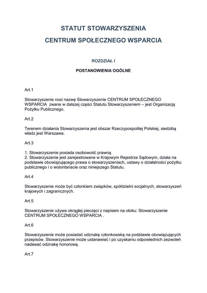 STATUT STOWARZYSZENIA CENTRUM SPOŁECZNEGO WSPARCIA ROZDZIAŁ I POSTANOWIENIA OGÓLNE Art.1 Stowarzyszenie nosi nazwę Stowarzyszenie CENTRUM SPOŁECZNEGO WSPARCIA zwane w dalszej części Statutu Stowarzyszeniem – jest Organizacją Pożytku Publicznego. Art.2 Terenem działania Stowarzyszenia jest obszar Rzeczypospolitej Polskiej, siedzibą władz jest Warszawa. Art.3 1. Stowarzyszenie posiada osobowość prawną. 2. Stowarzyszenie jest zarejestrowane w Krajowym Rejestrze Sądowym, działa na podstawie obowiązującego prawa o stowarzyszeniach, ustawy o działalności pożytku publicznego i o wolontariacie oraz niniejszego Statutu. Art.4 Stowarzyszenie może być członkiem związków, spółdzielni socjalnych, stowarzyszeń krajowych i zagranicznych. Art.5 Stowarzyszenie używa okrągłej pieczęci z napisem na otoku: Stowarzyszenie CENTRUM SPOŁECZNEGO WSPARCIA . Art.6 Stowarzyszenie może posiadać odznakę członkowską na podstawie obowiązujących przepisów. Stowarzyszenie może ustanawiać i po uzyskaniu odpowiednich zezwoleń nadawać odznakę honorową. Art.7 Stowarzyszenie działa w oparciu o pracę społeczną swoich członków. Do wykonywania swoich zadań statutowych może zatrudniać pracowników najemnych. Art.8 Stowarzyszenie może powołać oddziały terenowe według zasad określonych w niniejszym statucie. ROZDZIAŁ II CELE I ŚRODKI DZIAŁANIA Art.9 1. Stowarzyszenie prowadzi nieodpłatną działalność pożytku publicznego służącą realizacji jego celów statutowych, według zasad określonych w przepisach prawa, a w szczególności ustawy o działalności pożytku publicznego i o wolontariacie. 2. Działalność, o której mowa w ust. 1, nie może być prowadzona wyłącznie na rzecz członków Stowarzyszenia. Art.10 Celem Stowarzyszenia jest: A. tworzenie warunków sprzyjających twórczości, aktywności poznawczej, społecznej, obywatelskiej i zawodowej B. przeciwdziałanie bezrobociu, bezdomności, ubóstwu, wykluczeniu społecznemu, marginalizacji społecznej, przemocy i wszelkim innym negatywnym zjawiskom społecznym C. rozwijanie zdolności, zainteresowań i potencjału młodego pokolenia D. niesienie pomocy socjalnej, terapeutycznej, rehabilitacyjnej, materialnej osobom ubogim, bezdomnym, niepełnosprawnym, chorym , w szczególności dzieciom i młodzieży; E. wspieranie procesów rozwojowych i integracyjnych w społecznościach lokalnych, Polski, krajów UE i świata; F. promowanie idei wolontariatu krajowego i międzynarodowego, tworzenie warunków stymulujących proces rozwoju i upowszechniania postaw wolontariackich Polaków, zwłaszcza młodego pokolenia. Art.11 Stowarzyszenie realizuje swoje cele poprzez prowadzenie nieodpłatnej działalności pożytku publicznego. Art. 12 1. Na działalność nieodpłatną pożytku publicznego Stowarzyszenia składają się następujące usługi: A. pośrednictwo pracy i doradztwo zawodowe, kluby pracy, warsztaty, praktyk zawodowe, staże i inne formy aktywizacji osób bezrobotnych i poszukujących zatrudnienia, w tym cudzoziemców B. organizacja aukcji, giełd, przeglądów, konkursów, C. poradnictwo prawne, D. poradnictwo psychologiczno-pedagogiczne, doradztwo zawodowe, E. doradztwo w zakresie działalności gospodarczej i wspieranie przedsiębiorczości, F. reintegracja społeczna osób wykluczonych i zagrożonych wykluczeniem, G. prowadzenie centrów integracji społecznej, H. rehabilitacja społeczna i zawodowa osób niepełnosprawnych, I. resocjalizacja i reedukacja dzieci i młodzieży, J. szkolenia zawodowe, językowe, informatyczne i inne, K. wspieranie przedsiębiorczości, szczególnie w zakresie ekonomii społecznej, L. prowadzenie ośrodków dla osób bezdomnych, stołówek, hosteli, mieszkań chronionych i socjalnych, M. prowadzenie ośrodków rehabilitacyjnych dla osób niepełnosprawnych, ośrodków dziennego pobytu osób niepełnosprawnych, warsztatów terapii zajęciowej, zakładów aktywności zawodowej, N. wspieranie spółdzielni socjalnych i udział w ich prowadzeniu, O. prowadzenie szkół i placówek kształcenia ustawicznego, szkół specjalnych, P. prowadzenie świetlic socjoterapeutycznych i klubów młodzieżowych, Q. organizacja czasu wolnego dzieci i młodzieży, R. prowadzenie turnusów rehabilitacyjnych i obozów socjoterapeutycznych, S. organizacja wypoczynku zimowego i letniego dzieci i młodzieży, T. organizacja żywienia i dożywiania osób ubogich, U. pozyskiwanie darów rzeczowych i ich dystrybucja, V. organizacja zbiórek publicznych, W. organizacja kampanii społecznych, X. organizacja działań artystycznych, kulturalnych, festynów, wystaw, pokazów, Y. organizacja działań sportowych i turystycznych, imprez i zawodów, Z. organizacja działań z zakresu promocji zdrowia psychicznego, fizycznego i zdrowego stylu życia, AA. organizacja konferencji, seminariów i sympozjów, BB. promocja wiedzy i postaw proekologicznych, CC. prowadzenie telefonów zaufania, DD. promocja i kształcenie postaw obywatelskich, EE. wdrażanie zasad integracji europejskiej, FF. prowadzenie badań naukowych z zakresu problematyki społecznej, GG. współpraca z instytucjami państwowymi i samorządowymi, HH. tworzenie sieci organizacji pozarządowych i udział w ich pracach, II. współpraca z mediami, JJ. wydawanie książek, pism i prowadzenie kolportażu, KK. działalność charytatywna, LL. usługi w zakresie ochrony zabytków kultury i przyrody, MM. prowadzenie działalności z zakresu ekologii. ROZDZIAŁ III CZŁONKOWIE, ICH PRAWA I OBOWIĄZKI Art.13 Członkowie Stowarzyszenia dzielą się na: zwyczajnych, wspierających i honorowych. Art.14 1. Członkiem zwyczajnym Stowarzyszenia może być każdy pełnoletni obywatel Rzeczypospolitej Polskiej, który: a. zgłosił pisemną deklarację o przystąpieniu do Stowarzyszenia, b. posiada pełną zdolność do czynności prawnych, c. akceptuje cele Stowarzyszenia i pragnie przyczynić się do realizacji zadań statutowych Stowarzyszenia. 2