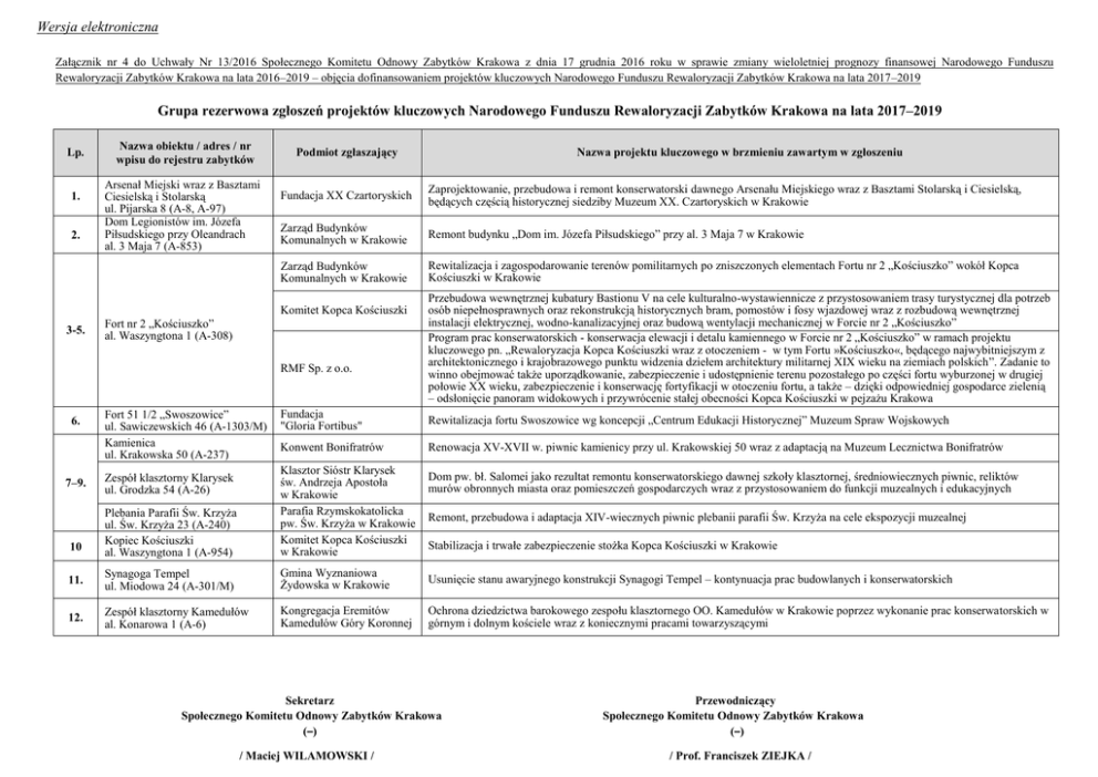 Wersja elektroniczna Załącznik nr 4 do Uchwały Nr 13/2016 Społecznego Komitetu Odnowy Zabytków Krakowa z dnia 17 grudnia 2016 roku w sprawie zmiany wieloletniej prognozy finansowej Narodowego Funduszu Rewaloryzacji Zabytków Krakowa na lata 2016–2019 – objęcia dofinansowaniem projektów kluczowych Narodowego Funduszu Rewaloryzacji Zabytków Krakowa na lata 2017–2019 Grupa rezerwowa zgłoszeń projektów kluczowych Narodowego Funduszu Rewaloryzacji Zabytków Krakowa na lata 2017–2019 Lp. 1. 2. Nazwa obiektu / adres / nr wpisu do rejestru zabytków Arsenał Miejski wraz z Basztami Ciesielską i Stolarską ul. Pijarska 8 (A-8, A-97) Dom Legionistów im. Józefa Piłsudskiego przy Oleandrach al. 3 Maja 7 (A-853) Podmiot zgłaszający Fundacja XX Czartoryskich Zaprojektowanie, przebudowa i remont konserwatorski dawnego Arsenału Miejskiego wraz z Basztami Stolarską i Ciesielską, będących częścią historycznej siedziby Muzeum XX. Czartoryskich w Krakowie Zarząd Budynków Komunalnych w Krakowie Remont budynku „Dom im. Józefa Piłsudskiego” przy al. 3 Maja 7 w Krakowie Zarząd Budynków Komunalnych w Krakowie Rewitalizacja i zagospodarowanie terenów pomilitarnych po zniszczonych elementach Fortu nr 2 „Kościuszko” wokół Kopca Kościuszki w Krakowie Komitet Kopca Kościuszki 3-5. Fort nr 2 „Kościuszko” al. Waszyngtona 1 (A-308) RMF Sp. z o.o. 6. Fort 51 1/2 „Swoszowice” ul. Sawiczewskich 46 (A-1303/M) Kamienica ul. Krakowska 50 (A-237) Nazwa projektu kluczowego w brzmieniu zawartym w zgłoszeniu Przebudowa wewnętrznej kubatury Bastionu V na cele kulturalno-wystawiennicze z przystosowaniem trasy turystycznej dla potrzeb osób niepełnosprawnych oraz rekonstrukcją historycznych bram, pomostów i fosy wjazdowej wraz z rozbudową wewnętrznej instalacji elektrycznej, wodno-kanalizacyjnej oraz budową wentylacji mechanicznej w Forcie nr 2 „Kościuszko” Program prac konserwatorskich - konserwacja elewacji i detalu kamiennego w Forcie nr 2 „Kościuszko” w ramach projektu kluczowego pn. „Rewaloryzacja Kopca Kościuszki wraz z otoczeniem - w tym Fortu »Kościuszko«, będącego najwybitniejszym z architektonicznego i krajobrazowego punktu widzenia dziełem architektury militarnej XIX wieku na ziemiach polskich”. Zadanie to winno obejmować także uporządkowanie, zabezpieczenie i udostępnienie terenu pozostałego po części fortu wyburzonej w drugiej połowie XX wieku, zabezpieczenie i konserwację fortyfikacji w otoczeniu fortu, a także – dzięki odpowiedniej gospodarce zielenią – odsłonięcie panoram widokowych i przywrócenie stałej obecności Kopca Kościuszki w pejzażu Krakowa Fundacja "Gloria Fortibus" Rewitalizacja fortu Swoszowice wg koncepcji „Centrum Edukacji Historycznej” Muzeum Spraw Wojskowych Konwent Bonifratrów Renowacja XV-XVII w. piwnic kamienicy przy ul. Krakowskiej 50 wraz z adaptacją na Muzeum Lecznictwa Bonifratrów Plebania Parafii Św. Krzyża ul. Św. Krzyża 23 (A-240) Kopiec Kościuszki al. Waszyngtona 1 (A-954) Klasztor Sióstr Klarysek św. Andrzeja Apostoła w Krakowie Parafia Rzymskokatolicka pw. Św. Krzyża w Krakowie Komitet Kopca Kościuszki w Krakowie 11. Synagoga Tempel ul. Miodowa 24 (A-301/M) Gmina Wyznaniowa Żydowska w Krakowie Usunięcie stanu awaryjnego konstrukcji Synagogi Tempel – kontynuacja prac budowlanych i konserwatorskich 12. Zespół klasztorny Kamedułów al. Konarowa 1 (A-6) Kongregacja Eremitów Kamedułów Góry Koronnej Ochrona dziedzictwa barokowego zespołu klasztornego OO. Kamedułów w Krakowie poprzez wykonanie prac konserwatorskich w górnym i dolnym kościele wraz z koniecznymi pracami towarzyszącymi 7–9. 10 Zespół klasztorny Klarysek ul. Grodzka 54 (A-26) Dom pw. bł. Salomei jako rezultat remontu konserwatorskiego dawnej szkoły klasztornej, średniowiecznych piwnic, reliktów murów obronnych miasta oraz pomieszczeń gospodarczych wraz z przystosowaniem do funkcji muzealnych i edukacyjnych Remont, przebudowa i adaptacja XIV-wiecznych piwnic plebanii parafii Św. Krzyża na cele ekspozycji muzealnej Stabilizacja i trwałe zabezpieczenie stożka Kopca Kościuszki w Krakowie Sekretarz Społecznego Komitetu Odnowy Zabytków Krakowa (–) / Maciej WILAMOWSKI / Przewodniczący Społecznego Komitetu Odnowy Zabytków Krakowa (–) / Prof. Franciszek ZIEJKA /