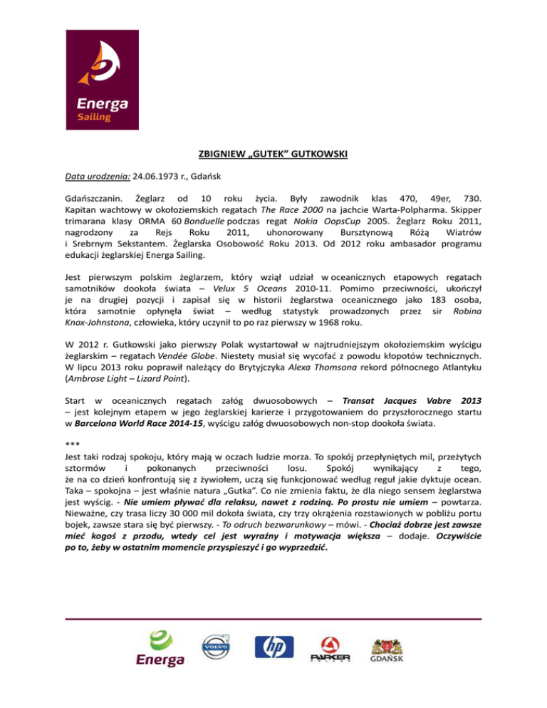 ZBIGNIEW „GUTEK” GUTKOWSKI Data urodzenia: 24.06.1973 r., Gdańsk Gdańszczanin. Żeglarz od 10 roku życia. Były zawodnik klas 470, 49er, 730. Kapitan wachtowy w okołoziemskich regatach The Race 2000 na jachcie Warta-Polpharma. Skipper trimarana klasy ORMA 60 Bonduelle podczas regat Nokia OopsCup 2005. Żeglarz Roku 2011, nagrodzony za Rejs Roku 2011, uhonorowany Bursztynową Różą Wiatrów i Srebrnym Sekstantem. Żeglarska Osobowość Roku 2013. Od 2012 roku ambasador programu edukacji żeglarskiej Energa Sailing. Jest pierwszym polskim żeglarzem, który wziął udział w oceanicznych etapowych regatach samotników dookoła świata – Velux 5 Oceans 2010-11. Pomimo przeciwności, ukończył je na drugiej pozycji i zapisał się w historii żeglarstwa oceanicznego jako 183 osoba, która samotnie opłynęła świat – według statystyk prowadzonych przez sir Robina Knox-Johnstona, człowieka, który uczynił to po raz pierwszy w 1968 roku. W 2012 r. Gutkowski jako pierwszy Polak wystartował w najtrudniejszym okołoziemskim wyścigu żeglarskim – regatach Vendée Globe. Niestety musiał się wycofać z powodu kłopotów technicznych. W lipcu 2013 roku poprawił należący do Brytyjczyka Alexa Thomsona rekord północnego Atlantyku (Ambrose Light – Lizard Point). Start w oceanicznych regatach załóg dwuosobowych – Transat Jacques Vabre 2013 – jest kolejnym etapem w jego żeglarskiej karierze i przygotowaniem do przyszłorocznego startu w Barcelona World Race 2014-15, wyścigu załóg dwuosobowych non-stop dookoła świata. *** Jest taki rodzaj spokoju, który mają w oczach ludzie morza. To spokój przepłyniętych mil, przeżytych sztormów i pokonanych przeciwności losu. Spokój wynikający z tego, że na co dzień konfrontują się z żywiołem, uczą się funkcjonować według reguł jakie dyktuje ocean. Taka – spokojna – jest właśnie natura „Gutka”. Co nie zmienia faktu, że dla niego sensem żeglarstwa jest wyścig. - Nie umiem pływać dla relaksu, nawet z rodziną. Po prostu nie umiem – powtarza. Nieważne, czy trasa liczy 30 000 mil dokoła świata, czy trzy okrążenia rozstawionych w pobliżu portu bojek, zawsze stara się być pierwszy. - To odruch bezwarunkowy – mówi. - Chociaż dobrze jest zawsze mieć kogoś z przodu, wtedy cel jest wyraźny i motywacja większa – dodaje. Oczywiście po to, żeby w ostatnim momencie przyspieszyć i go wyprzedzić. MACIEJ „ŚWISTAK” MARCZEWSKI Data urodzenia: 11.02.1975 r., Gdynia Wychowanek Yacht Klubu Polski Gdynia. Przygodę z żeglarstwem zaczynał od klasy Optimist. Dalszą wiedzę o regatowym pływaniu zdobywał na przygotowawczych klasach Cadet i 420, następnie olimpijskiej klasie 470. Razem z „Gutkiem” brał udział we wszystkich tegorocznych załogowych rejsach i regatach: Las Palmas – Gwadelupa (czas: 9 dni 11 godzin 28 minut, styczeń 2013 r.), Caribbean 600 (3 miejsce, luty 2013 r.), 33 St. Maarten Heineken Regatta (marzec 2013 r.), Miami – Nowy Jork (maj 2013 r.), Lizard – Cherbourg – Sopot (lipiec 2013 roku). Odpowiedzialny za przygotowanie jachtu ENERGA do próby pobicia rekordu Północnego Atlantyku. (Wynik uzyskany w lipcu 2013 przez Zbigniewa Gutkowskiego na trasie Nowy Jork – Lizard jest drugim wynikiem na świecie – czas: 8 dni 18 godzin 50minut). Kapitan techniczny jachtu ENERGA IMOCA 60 w regatach Vendée Globe 2012-2013. Od 2009 roku związany z fundacją Polish Ocean Racing. Dla Zbigniewa Gutkowskiego przygotowywał jacht Operon Racing (ex. Bagages Superior) - IMOCA 60 / Eco 60 do regat Velux 5 Oceans 2010-11, w których „Gutek” zajął 2 miejsce. Był stałym członkiem załogi trimarana Bonduelle ORMA 60 w regatach Nokia OOPS Cup 2005, gdzie po raz pierwszy startował wspólnie ze Zbigniewem Gutkowskim oraz zajmował się przygotowaniem technicznym jachtu. *** Prawa ręka „Gutka” na wodzie i na lądzie, gdy chodzi o sprawy związane z jachtem ENERGA. Jest przeciwieństwem spokojnego „Gutka”. Ciągle w ruchu, w biegu, w samochodzie, na jachcie, na maszcie, przy telefonie. Jacht ENERGA zna jak własną kieszeń. We wszystkich samotnych wyścigach w jakich brał udział „Gutek”, to właśnie Maciek był osobą, na którą można było liczyć w pierwszej kolejności. Towarzyszy „Gutkowi” jako załogant oraz przygotowuje jego jachty do startów od 2005 roku. Przepłynął razem z nim wiele tysięcy mil. W regatach Transat Jacques Vabre zadebiutuje na pokładzie w randze co-skipper, jako oceaniczny żeglarz regatowy. – Nie wiem jak teraz będzie, bo te wszystkie pytania które spadały na mnie telefonicznie podczas samotnych wypraw Gutka, pojawią się bezpośrednio w pierwszej wspólnej dobie – mówi. – To może nie być najłatwiejszy czas, ale jakoś przeżyję – śmieje się. TRASA REGAT 11. edycja regat Transat Jacques Vabre to jednocześnie jubileusz dwudziestolecia tego wyścigu. Nowe otwarcie oznacza również nowy port docelowy – brazylijskie Itajai. Łatwo narysować trasę na mapie, łącząc znajdujący się nad kanałem La Manche, francuski Hawr z Itajai, leżącym zaledwie kilka stopni szerokości geograficznej bliżej Europy niż południowoafrykański Kapsztad, będący portem etapowym wielu rejsów, których trasa biegnie dookoła globu. - Żaden z etapów regat dookoła świata nie jest łatwy, ale ten jest szczególnie wymagający: dostarcza wielu żeglarskich wrażeń, zmusza do nieustannego myślenia i analizowania trasy, każdy błąd kosztuje bardzo wiele i nie ma gdzie nadrobić straconych mil, a żagle trzeba ciągle zmieniać – mówi „Gutek”, który ten fragment oceanu przemierzał wielokrotnie. Kanał La Manche Oprócz intensywnego ruchu statków, których tory wodne nakładają się tu na siebie pod każdym kątem odbywa się tu również intensywny ruch niżowych układów atmosferycznych. Zawodnicy potrzebują w tym miejscu wiatru z kierunków od wschodniego do północno-wschodniego, umiarkowanyc