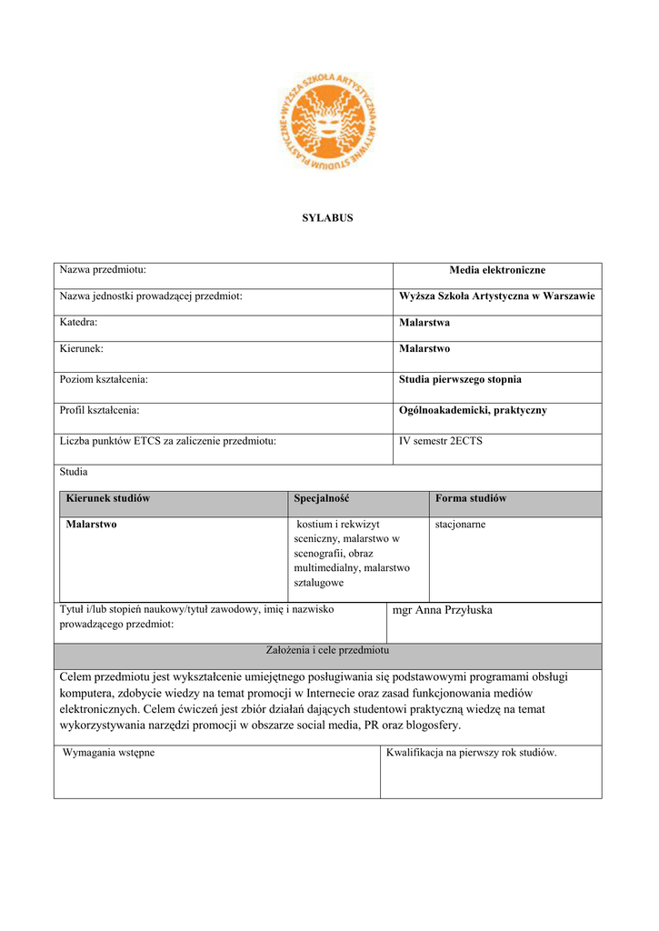 SYLABUS Nazwa przedmiotu: Media elektroniczne Nazwa jednostki prowadzącej przedmiot: Wyższa Szkoła Artystyczna w Warszawie Katedra: Malarstwa Kierunek: Malarstwo Poziom kształcenia: Studia pierwszego stopnia Profil kształcenia: Ogólnoakademicki, praktyczny Liczba punktów ETCS za zaliczenie przedmiotu: IV semestr 2ECTS Studia Kierunek studiów Specjalność Forma studiów Malarstwo kostium i rekwizyt sceniczny, malarstwo w scenografii, obraz multimedialny, malarstwo sztalugowe stacjonarne mgr Anna Przyłuska Tytuł i/lub stopień naukowy/tytuł zawodowy, imię i nazwisko prowadzącego przedmiot: Założenia i cele przedmiotu Celem przedmiotu jest wykształcenie umiejętnego posługiwania się podstawowymi programami obsługi komputera, zdobycie wiedzy na temat promocji w Internecie oraz zasad funkcjonowania mediów elektronicznych. Celem ćwiczeń jest zbiór działań dających studentowi praktyczną wiedzę na temat wykorzystywania narzędzi promocji w obszarze social media, PR oraz blogosfery. Wymagania wstępne Kwalifikacja na pierwszy rok studiów. Zamierzony efekt kształcenia Symbol efektu kształcenia na poziomie kierunku K_W04 K_U02 Opis efektów kształcenia na poziomie przedmiotu Rozumie podstawowe zagadnienia technologiczne na temat promocji w Internecie oraz zasad funkcjonowania mediów elektronicznych. Umie kreatywnie wykorzystać własną wyobraźnię i ekspresję artystyczną w celu wykorzystywania narzędzi edytora tekstu, arkusza kalkulacyjnego oraz promocji w obszarze social media, PR i blogosfery. K_U15 Umie posługiwać się podstawowymi programami obsługi komputera, prezentacji multimedialnej, edytorami tekstu oraz sprzętami służącymi do rejestracji obrazu i dźwięku. K_U20 Umie świadomie i odpowiedzialnie wykonać prezentację swojego projektu w formie prezentacji multimedialnej i strony internetowej. Jest zdolny do uczenia i pogłębiania swojej wiedzy dotyczących najnowszych technologii w mediach elektronicznych i wykorzystania jej w promocji swoich prac i projektów w obszarze social media, PR lub blogosfery. Potrafi efektywnie wykorzystać wyobraźnię, intuicję, twórczą postawę i samodzielne myślenie w celu samodzielnej promocji własnych osiągnięć zawodowych, znajomość terminologii dotyczących social media, Public Relations oraz blogosfery. K_K03 K_K04 K_K11 Weryfikacja efektu kształcenia Jest zdolny do prezentowania swoich projektów w przystępnej formie z wykorzystaniem współczesnych technologii prezentacyjnych poznanych na zajęciach. 2 zaliczenia przedmiotu na podstawie napisania 15 notatek (min min 700 znaków, każdy tekst) Liczba godzin dydaktycznych i formy zajęć i punkty ECTS: Liczba godzin dydaktycznych (w tym): Przedmioty Forma zajęć: (W - wykład, Ć - ćwiczenia, K konwersatorium) Razem W Ć W+Ć 30 10 20 Media elektroniczne Rok I Rok II Semestr I W Ć K ECTS Semestr II R W K Ć K ECTS Rok III Semestr III R W Ć K ECTS Semestr IV R W Ć 10 20 K Rok IV Semestr V ECTS R 2 Zo W Ć K ECTS Semestr VI R W Ć K ECTS Semestr VII R W Ć K ECTS R R – rygor (egzamin, - E, zaliczenie z oceną –Zo, zaliczenie - Z Treści programowe nauczania [ treść zajęć] SEMESTR IV Wykład 1-2 Wprowadzenie do zagadnień związanych z Public Relations. Co to jest PR, media relations, event, CSR. Rola Public Relations w promocji i marketingu. Struktura w działach marketingu firm. Wykład 3-4 Blogosfera i inne miejsca publikacyjne w Internecie. Czym jest blog i jaką formę promocji daje blogosfera. Serwisy blogowe. Omówienie najpopularniejszych portali i ich właściwości. Wykład 5-6 Sytuacje kryzysowe w działaniach promocyjnych. Omówienie przykładów i sposobów rozwiązywania kryzysów komunikacyjnych w obszarze social media oraz PR. Wykład 7-8 Czym jest Social media. Rodzaje serwisów internetowych. Facebook, Twitter, Nasza Klasa, Blip, Youtube. Omówienie najważniejszych funkcji serwisów. Wykład 9-10 Sztuka Budowania relacji z mediami, omówienie zasad kontaktów z mediami, stopnie budowania relacji z mediami. Zasady pisania dobrych komunikatów dla prasy; Język w komunikacji pisemnej. Ćwiczenie 1-2 Zasady tworzenia blogów, omówienie poszczególnych narzędzi używanych przy budowaniu bloga. Tworzenie kont w obszarze social media, ćwiczenia dotyczące promocji w Internecie. Ćwiczenie 3-6 Pisanie notek prasowych, przygotowanie Press packów, Dobór materiałów graficznych. Ćwiczenie 7-14 Modelowe budowanie kampanii w Internecie na przykładzie wystawy prac studentów (konkurs Gaja). Logistyka, Pubic Relations, Social Media. Ćwiczenie 15-16 Zajęcia praktyczne z obsługi programu Excel. Ćwiczenie 17-20 Sztuka autoprezentacji. Indywidualne ćwiczenia z wystąpień publicznych. Gestykulacja, mimika, mowa ciała. Analiza i ocena zachowawcza . 3 Zagadnienia programowe nauczania: Narzędzie/ metody dydaktyczne: Ćwiczenia prowadzone w pracowniach komputerowych, uzupełnione dyskusją ze studentami, pracą grupową. Forma i sposób zaliczenia oraz wymagania egzaminacyjne: Każdy ze studentów zobowiązany jest do zaliczenia przedmiotu na podstawie napisania 15 notatek (min min 700 znaków, każdy tekst) dotyczący zagadnień związanych z tematyką wizażu, charakteryzacji, grafiki. Wielkość tekstu: min 700 znaków. Metody i kryteria oceny: Aktywność na ćwiczeniach, zapoznanie się z literaturą i zagadnieniami dotyczącymi tematyki wizażu, charakteryzacji i grafiki. Wymagania końcowe: Zaliczenie z oceną; studenci mają prawo do dwóch nieusprawiedliwionych nieobecności. Całkowity nakład pracy studenta potrzebny do osiągnięcia założonych efektów w godzinach oraz punktach ECTS Media elektroniczne Godziny kontaktowe z nauczycielem akademickim Liczba godzin (kontakto we i samodziel na praca studenta) Śred nia aryt met yczn a 25h30h Liczba punkt ów ECTS Łączna liczba punktów ECTS z wyrównanie m 30 1,00 1 30 1,00 1 10 0,33 0 10 0,33 0 10 0,33 0 2,00 2 1 pun kt EC TS= 25h 1 pun kt EC TS= 30h 1. Uczestni