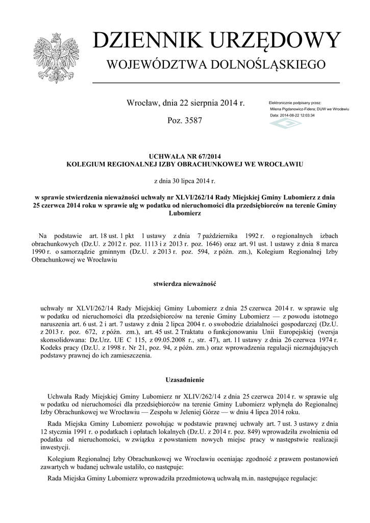DZIENNIK URZĘDOWY WOJEWÓDZTWA DOLNOŚLĄSKIEGO Wrocław, dnia 22 sierpnia 2014 r. Elektronicznie podpisany przez: Milena Pigdanowicz-Fidera; DUW we Wrocławiu Poz. 3587 Data: 2014-08-22 12:03:34 UCHWAŁA NR 67/2014 KOLEGIUM REGIONALNEJ IZBY OBRACHUNKOWEJ WE WROCŁAWIU z dnia 30 lipca 2014 r. w sprawie stwierdzenia nieważności uchwały nr XLVI/262/14 Rady Miejskiej Gminy Lubomierz z dnia 25 czerwca 2014 roku w sprawie ulg w podatku od nieruchomości dla przedsiębiorców na terenie Gminy Lubomierz Na podstawie art. 18 ust. 1 pkt 1 ustawy z dnia 7 października 1992 r. o regionalnych izbach obrachunkowych (Dz.U. z 2012 r. poz. 1113 i z 2013 r. poz. 1646) oraz art. 91 ust. 1 ustawy z dnia 8 marca 1990 r. o samorządzie gminnym (Dz.U. z 2013 r. poz. 594, z późn. zm.), Kolegium Regionalnej Izby Obrachunkowej we Wrocławiu stwierdza nieważność uchwały nr XLVI/262/14 Rady Miejskiej Gminy Lubomierz z dnia 25 czerwca 2014 r. w sprawie ulg w podatku od nieruchomości dla przedsiębiorców na terenie Gminy Lubomierz — z powodu istotnego naruszenia art. 6 ust. 2 i art. 7 ustawy z dnia 2 lipca 2004 r. o swobodzie działalności gospodarczej (Dz.U. z 2013 r. poz. 672, z późn. zm.), art. 45 ust. 2 Traktatu o funkcjonowaniu Unii Europejskiej (wersja skonsolidowana: Dz.Urz. UE C 115, z 09.05.2008 r., str. 47), art. 11 ustawy z dnia 26 czerwca 1974 r. Kodeks pracy (Dz.U. z 1998 r. Nr 21, poz. 94, z późn. zm.) oraz wprowadzenia regulacji nieznajdujących podstawy prawnej do ich zamieszczenia. Uzasadnienie Uchwała Rady Miejskiej Gminy Lubomierz nr XLIV/262/14 z dnia 25 czerwca 2014 r. w sprawie ulg w podatku od nieruchomości dla przedsiębiorców na terenie Gminy Lubomierz wpłynęła do Regionalnej Izby Obrachunkowej we Wrocławiu — Zespołu w Jeleniej Górze — w dniu 4 lipca 2014 roku. Rada Miejska Gminy Lubomierz powołując w podstawie prawnej uchwały art. 7 ust. 3 ustawy z dnia 12 stycznia 1991 r. o podatkach i opłatach lokalnych (Dz.U. z 2014 r. poz. 849) wprowadziła zwolnienia od podatku od nieruchomości, w związku z powstaniem nowych miejsc pracy w następstwie realizacji inwestycji. Kolegium Regionalnej Izby Obrachunkowej we Wrocławiu oceniając zgodność z prawem postanowień zawartych w badanej uchwale ustaliło, co następuje: Rada Miejska Gminy Lubomierz wprowadziła przedmiotową uchwałą m.in. następujące regulacje: Dziennik Urzędowy Województwa Dolnośląskiego –2– Poz. 3587 1) w § 1 pkt 7 nadano definicję nowych miejsc pracy: „miejsca pracy utworzone w trakcie realizacji inwestycji, nie później niż 12 miesięcy od jej zakończenia. Dotyczą pracowników zameldowanych na pobyt stały na terenie Gminy Lubomierz, zatrudnionych na podstawie umowy o pracę u przedsiębiorcy na terenie Gminy Lubomierz”; 2) w § 2 pkt 2 lit. e postanowiono, że uchwała nie ma zastosowania do pracowników przebywających na urlopie macierzyńskim, wychowawczym lub ojcowskim; 3) w § 3 pkt 8 określając okres, na który przysługuje zwolnienie, w zależności od ilości nowych miejsc pracy, ustalono: pod literą c) 2 lata — jeżeli utworzono 5–10 nowych miejsc pracy, pod literą d) 3 lata — jeżeli utworzono powyżej 11 nowych miejsc pracy; 4) w § 4 ust. 2 pkt 2 lit. b zobowiązuje się przedsiębiorcę do złożenia oświadczenia, że jego przedsiębiorstwo nie znajduje się w trudnej sytuacji ekonomicznej, na druku stanowiącym załącznik nr 6, który w swej treści odsyła do regulacji zawartych w Wytycznych wspólnotowych dotyczących pomocy państwa w celu ratowania i restrukturyzacji zagrożonych przedsiębiorstw — Dz.Urz. UE C 244 z 01.10.2004 r.; 5) w załącznikach nr 1, 2, 4 i 6 wprowadzono wymóg złożenia oświadczenia o treści: „Świadomy odpowiedzialności karnej za składanie fałszywych danych (art. 233 k.k.) oświadczam, że [...]” bądź „Świadomy odpowiedzialności karnej za składanie fałszywych zeznań przewidzianej w przepisach art. 233 ustawy z dnia 6 czerwca 1997 kodeks karny (tekst jednolity Dz.U. 1997 Nr 88, poz. 553 ze zm.) — niniejszym oświadczam, że [...]”. Zgodnie z art. 91 ust. 1 ustawy o samorządzie gminnym, stwierdzenie przez organ nadzoru, że stanowiąca przedmiot postępowania uchwała jest sprzeczna z prawem, może skutkować orzeczeniem jej nieważności w całości lub w części. Jak wskazuje ukształtowana linia orzecznicza sądów administracyjnych, do rodzajów naruszeń przepisów skutkujących nieważnością uchwał organów jednostek samorządu terytorialnego zaliczyć należy m.in. naruszenia przepisów prawa materialnego, jak i proceduralnego, polegające w szczególności na wadliwej ich wykładni (por. np. wyrok NSA z dnia 11 lutego 1998 r. sygn. akt II SA/Wr 1459/97). Kolegium Regionalnej Izby Obrachunkowej we Wrocławiu w uchwale będącej przedmiotem nadzoru za istotne naruszenie prawa uznaje: Ad 1) objęcie zwolnieniem od podatku od nieruchomości nowych miejsc pracy, na których mogą być zatrudnieni wyłącznie pracownicy zameldowani na pobyt stały na terenie Gminy Lubomierz, co stanowi ograniczenie zasady swobody działalności gospodarczej i narusza przepis art. 6 ust. 2 ustawy z dnia 2 lipca 2004 r. o swobodzie działalności gospodarczej (Dz.U. z 2013 r. poz. 672, z późn. zm.) oraz naruszenie zasady swobodnego przepływu pracowników, o której mowa w art. 45 ust. 2 Traktatu o funkcjonowaniu Unii Europejskiej (dalej TFUE). Przepis art. 6 ust. 2 ustawy o swobodzie działalności gospodarczej stanowi, że właściwy organ nie może żądać ani uzależniać swojej decyzji w sprawie podjęcia, wykonywania i zakończenia działalności gospodarczej przez zainteresowaną osobę od spełnienia przez nią dodatkowych warunków, w szczególności od przedłożenia dokumentów lub ujawnienia danych, nieprzewidzianych przepisami prawa. W istocie wprowadzone ograniczenie pozbawia przedsiębiorcę swobody w podejmowaniu decyzji w zakresie zatrudniania pracowników stosownie do potrzeb np. 