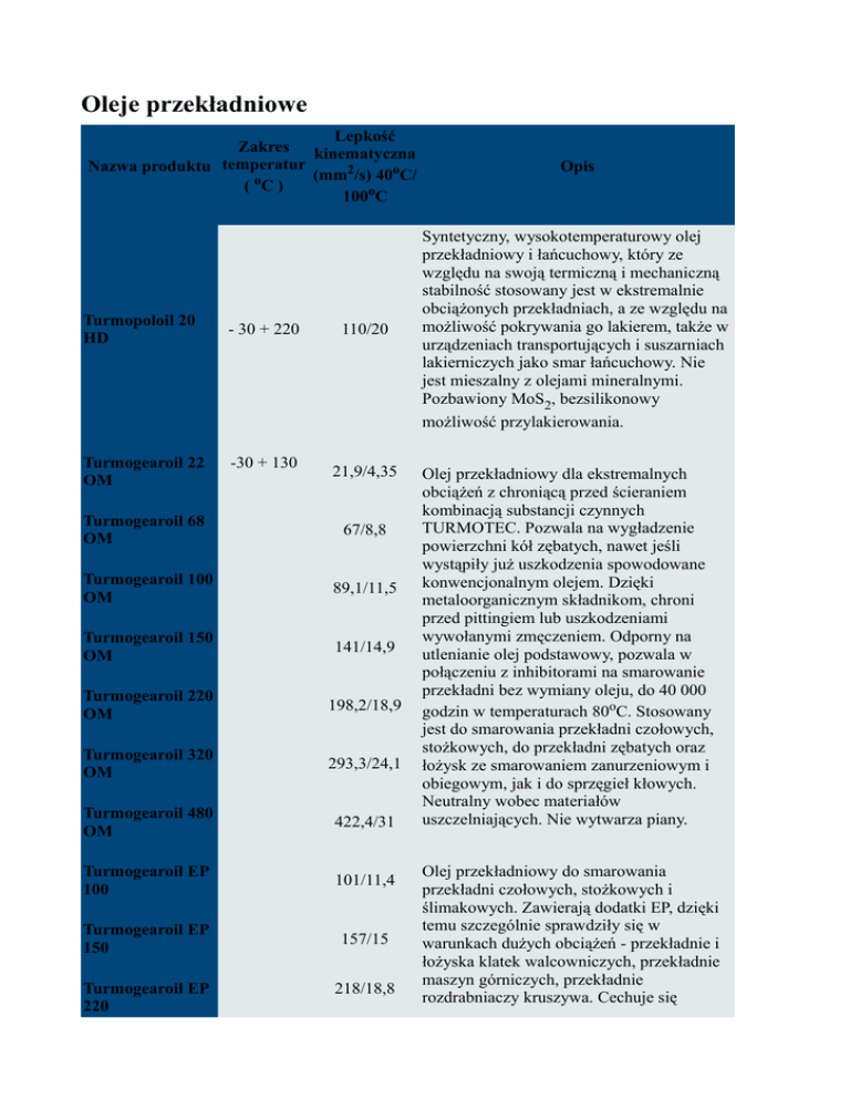 Oleje przekładniowe Lepkość Zakres kinematyczna Nazwa produktu temperatur (mm2/s) 40oC/ ( oC ) 100oC Turmopoloil 20 HD Turmogearoil 22 OM - 30 + 220 -30 + 130 110/20 21,9/4,35 Turmogearoil 68 OM 67/8,8 Turmogearoil 100 OM 89,1/11,5 Turmogearoil 150 OM 141/14,9 Turmogearoil 220 OM 198,2/18,9 Turmogearoil 320 OM 293,3/24,1 Turmogearoil 480 OM 422,4/31 Turmogearoil EP 100 101/11,4 Turmogearoil EP 150 157/15 Turmogearoil EP 220 218/18,8 Opis Syntetyczny, wysokotemperaturowy olej przekładniowy i łańcuchowy, który ze względu na swoją termiczną i mechaniczną stabilność stosowany jest w ekstremalnie obciążonych przekładniach, a ze względu na możliwość pokrywania go lakierem, także w urządzeniach transportujących i suszarniach lakierniczych jako smar łańcuchowy. Nie jest mieszalny z olejami mineralnymi. Pozbawiony MoS2, bezsilikonowy możliwość przylakierowania. Olej przekładniowy dla ekstremalnych obciążeń z chroniącą przed ścieraniem kombinacją substancji czynnych TURMOTEC. Pozwala na wygładzenie powierzchni kół zębatych, nawet jeśli wystąpiły już uszkodzenia spowodowane konwencjonalnym olejem. Dzięki metaloorganicznym składnikom, chroni przed pittingiem lub uszkodzeniami wywołanymi zmęczeniem. Odporny na utlenianie olej podstawowy, pozwala w połączeniu z inhibitorami na smarowanie przekładni bez wymiany oleju, do 40 000 godzin w temperaturach 80oC. Stosowany jest do smarowania przekładni czołowych, stożkowych, do przekładni zębatych oraz łożysk ze smarowaniem zanurzeniowym i obiegowym, jak i do sprzęgieł kłowych. Neutralny wobec materiałów uszczelniających. Nie wytwarza piany. Olej przekładniowy do smarowania przekładni czołowych, stożkowych i ślimakowych. Zawierają dodatki EP, dzięki temu szczególnie sprawdziły się w warunkach dużych obciążeń - przekładnie i łożyska klatek walcowniczych, przekładnie maszyn górniczych, przekładnie rozdrabniaczy kruszywa. Cechuje się Turmogearoil EP 320 323/23,1 wysoką zdolnością znoszenia obciążeń, zapobiega rozruchowemu zacieraniu się, pittingowi przy docieraniu, nie emulguje, dobra ochrona antykorozyjna, dobre Turmofluid GV 22 19/4 Turmofluid GV 46 48/8 Turmofluid GV 68 61,9/9,9 Turmofluid GV 100 96,4/17,4 Turmofluid GV 150 153/21,8 -30 + 120 Turmofluid GV 220 204/26,8 Turmofluid GV 460 496/51,4 Turmofluid GV 680 686/64,2 Turmosol TRAK 50 22/3,7 Syntetyczne oleje uniwersalne do stosowania w niskich i wysokich temperaturach, przy trudnych warunkach pracy, względnie dla stosowania przez dłuższy okres. Gwarantowana jest neutralność wobec elastomerów i tworzyw sztucznych oraz metali kolorowych. Obok dobrych zdolności tłoczenia osiągane są także niskie współczynniki tarcia. Specjalny płyn dla przekładni ciernych. Optymalne przenoszenie mocy poprzez wysokie wartości tarcia, również przy podwyższonej liczbie obrotów.