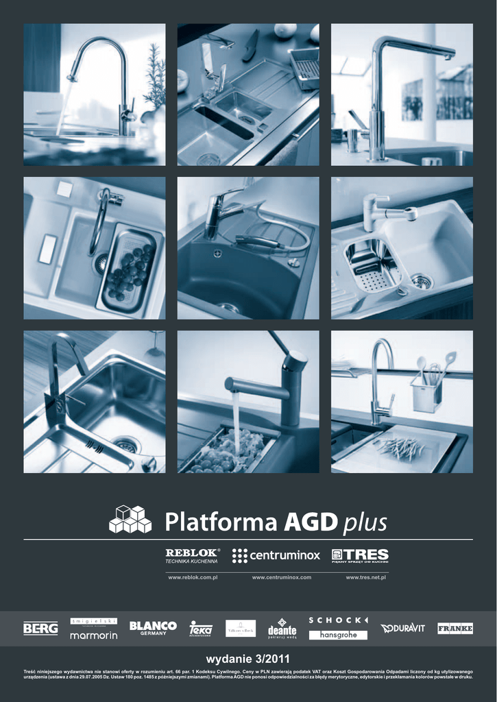 www.reblok.com.pl www.centruminox.com www.tres.net.pl wydanie 3/2011 Treść niniejszego wydawnictwa nie stanowi oferty w rozumieniu art. 66 par. 1 Kodeksu Cywilnego. Ceny w PLN zawierają podatek VAT oraz Koszt Gospodarowania Odpadami liczony od kg utylizowanego urządzenia (ustawa z dnia 29.07.2005 Dz. Ustaw 180 poz. 1485 z późniejszymi zmianami). Platforma AGD nie ponosi odpowiedzialności za błędy merytoryczne, edytorskie i przekłamania kolorów powstałe w druku. CRAFT 577x447 mm ● zlewozmywak stalowy ● cena nie zawiera baterii Circolo średn. 510 mm ● zlewozmywak stalowy ● cena nie zawiera baterii gładki len gładki len 299,349,- craft long 770x480 mm 229,299,- double 780x435 mm gładki ● zlewozmywak stalowy ● cena nie zawiera baterii len gładki ● zlewozmywak stalowy ● cena nie zawiera baterii len 329,379,- 349,399,- Do każdego kompletu zlewozmywak stalowy + bateria BERG (dowolny model) patelnia indukcyjna o średnicy 20 cm GRATIS! 2 PROMOCJA KOREK AUTOMATYCZNY w cenie każdego* zlewozmywaka stalowego BERG * za wyjątkiem modelu Circolo RILL 1,5 compact 780x500 mm ● zlewozmywak stalowy ● cena nie zawiera baterii STRIP 1,5 compact 778x488 mm ● zlewozmywak stalowy ● cena nie zawiera baterii AFFIX 580x488 mm ● zlewozmywak stalowy ● cena nie zawiera baterii gładki len gładki len gładki len 569,589,- RILL 1,5 950x500 mm 439,459,- STRIP 1 780x435 mm 299,349,- TRAP 945x510 mm ● zlewozmywak stalowy ● cena nie zawiera baterii ● zlewozmywak stalowy ● cena nie zawiera baterii ● zlewozmywak stalowy ● cena nie zawiera baterii gładki len gładki len gładki len 639,659,- 299,349,- 679,699,3 NOWOŚĆ NEXT BRN X51 1,5-komorowy z ociekaczem NA WSZYSTKIE ZLEWOZMYWAKI GRANITOWE NOWOŚĆ 869,- ● zlewozmywak granitowy ● 960x480 mm NEXT BRN X11 1-komorowy z ociekaczem 769,- 729,- UNIT BRG X103 1-komorowy ● zlewozmywak granitowy ● 465x465 mm ● zlewozmywak granitowy ● 780x480 mm PROMOCJA do każdego kompletu zlewozmywak granitowy + bateria BERG (dowolny model) patelnia indukcyjna min. 24 cm GRATIS! UNIT BRG X51 1,5-komorowy z ociekaczem 899,- UNIT BRG X11 1-komorowy z ociekaczem 799,- ● zlewozmywak granitowy ● 780x500 mm ● zlewozmywak granitowy ● 1000x500 mm UNIT BRG X11A 1-kom. z małym ociekaczem 759,- ● zlewozmywak granitowy ● 590x480 mm Kolory podstawowe dostępne w ciągłej sprzedaży: SAFARI PIASEK CZARNY BIAŁY Kolor podst dostępny w ciągu 3 tygodni: SZARY Kolory Exclusive za dopłatą 10% dostępne w ciągu 3 tygodni: UNIT BRG X513 1,5-komorowy compact ● zlewozmywak granitowy ● 780x500 mm 4 849,- UNIT BRG X61 Narożny ● zlewozmywak granitowy ● 1000x575 mm 999,- BIAŁY ALABASTER CZARNY METALIK ECRU STALOWY METALIK Bateria SUNGARI WW granit 389,- ● z wyciąganą wylewką ● dostępne kolory: safari, piasek, biały, czarny Bateria EUFRAT WW ● z wyciąganą wylewką Bateria KLARO granit 289,- ● dostępne kolory: safari, piasek, biały, czarny chrom inox chrom inox Bateria FIGARO Bateria SUNGARI chrom inox 259,299,- Bateria EUFRAT 459,529,- Bateria JANGCY 379,469,- Bateria PANDA chrom inox chrom inox chrom inox 179,199,- 399,489,- 349,429,5 PROMOCJA przy zakupie zlewozmywaków Primus lub Signus deska szklana 50% taniej 149,- 1599,- HORIZONT D-100 SMALL 680x500 mm 298,- ● zlewozmywak CRISTADUR® ● dostępny tylko z komorą z prawej strony CRISTADUR® Dostępne kolory: AVORIO POLARIS MAGMA CRYSTALITE+® Nowy, jeszcze bardziej odporny na rysy i zadrapania, łatwiejszy w utrzymaniu czystości. Dostępne kolory: 1699,1369,- SIGNUS D-100 CRISTADUR® PRIMUS D-100 CRYSTALITE® ● zlewozmywak 860x500 mm 1899,1579,- SIGNUS D-150 CRISTADUR® PRIMUS D-150 CRYSTALITE® ● zlewozmywak 1000x500 mm COLORADO ALPINA ONYX NERO Zlewozmywaki w kolorach innych niż prezentowane w katalogu dostępne są na zamówienie w cenach wg aktualnie obowiązującego cennika. Baterie PIEGA kolor dostępne w kolorach: Crystalite+: Colorado, Alpina, Onyx, Nero Cristadur: Avorio, Polaris, Magma Bateria SIMI kolor dostępna w kolorach chrom+Colorado oraz chrom+Onyx ERIS chrom z WW ERIS LED chrom z WW 6 1599,2299,- HEKATE chrom 1499,- z wyciąganą wylewką SIMI chrom SIMI kolor 699,799,- PIEGA 547.000 kolor PIEGA 547.120 kolor z WW 1299,1499,- HORIZONT D-100 780x500 mm 1799,- ● zlewozmywak CRISTADUR® ● dostępny tylko z komorą z prawej strony HORIZONT D-150 1000x500 mm ● zlewozmywak CRISTADUR® ● dostępny tylko z komorą z prawej strony 2099,- DESKA SZKLANA do zlewozmywaków Horizont WKŁADKA STALOWA do zlewozmywaków Horizont 299,349,- 2099,- WKŁADKA ZIELONA do zlew. Waterfall 199,- 1099,- CLASSIC N-150 UB 597x500 mm 1699,- 2399,- CRISTADUR® Nanogranit technologia XXI w. • ekstremalna odporność na uderzenia, zadrapania i ścieranie •100% antybakteryjne - w wyniku dodania do masy nanogranitowej jonów srebra niemożliwy jest rozwój bakterii, co gwarantuje bezpieczeństwo w kontakcie z produktami spożywczymi •wyjątkowa łatwość w utrzymaniu w czystości - poprzez utwardzanie powierzchni zlewozmywaka w procesie nanotechnologicznym staje się on wyjątkowo bezporowy, co skutecznie uniemożliwia wnikanie zabrudzeń, powstawanie trwałych plam i osadzanie kamienia WATERFALL D-150 1000x500 mm ● zlewozmywak CRISTADUR ® SOLIDO N-75 378x378 mm ● komora podwieszana CRYSTALITE+® 999,- 1099,- SOLIDO N-100 502x378 mm ● komora podwieszana CRYSTALITE+® 2499,- 1290,- ● komora podwieszana CRYSTALITE+® ● model niedostępny w kolorach Nero oraz Copper 7 METRA 6S Silgranit® PuraDur 2™ z korkiem automatycznym oraz odsączarką ● zlewozmywak granitowy ● 1000x500 mm bez korka automatycznego oraz odsączarki YPSILON 550 U METRA XL 6S Silgranit® PuraDur 2™ z korkiem automat. ● zlewozmywak granitowy ● 1000x500 mm bez korka automat. 1979,1759,- METRA 5S Silgranit® PuraDur 2™ z korkiem automat. ● zlewozmywak granitowy ● 860x500 mm bez korka automat. 1699,- METRA 45S Silgranit® PuraDur 2™ z korkiem automat.