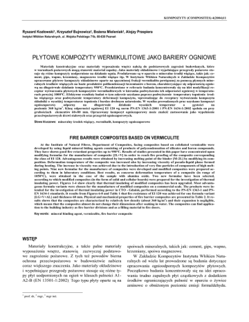 KOMPOZYTY (COMPOSITES) 4(2004)11 Ryszard Kozłowski1, Krzysztof Bujnowicz2, Bożena Mieleniak3, Alojzy Przepiera Instytut Włókien Naturalnych, ul. Wojska Polskiego 71b, 60-630 Poznań PŁYTOWE KOMPOZYTY WERMIKULITOWE JAKO BARIERY OGNIOWE Materiały konstrukcyjne oraz materiały wyposażenia wnętrz należą do podstawowych zagrożeń budowlanych, które w warunkach pożarowych mogą stanowić materiał zapalny. Jako materiały okładzinowe i wypełniające przegrody pożarowe stosuje się różne kompozyty uodpornione na działanie ognia. Produkowane są w oparciu o mineralne środki wiążące, takie jak: cement, gips, wapno, krzemiany, magnezowe środki wiążące itp. W Instytucie Włókien Naturalnych w Zakładzie Kompozytów opracowano płytowe kompozyty okładzinowe oparte na spęcznionej frakcji wermikulitu powiązanej za pomocą płynnych mineralnych środków wiążących na bazie produktów polikondensacji krzemianów z borem, charakteryzujące się odpornością ogniową na długotrwałe działanie temperatury 950°C. Przedstawione w referacie badania koncentrowały się na idei modyfikacji receptur wytwarzania płytowych kompozytów wermikulitowych w kierunku podwyższenia ich odporności ogniowej w temperaturach powyżej 1000°C. Efektywne rezultaty badań w tym zakresie uzyskano poprzez podwyższenie temperatury topnienia środka wiążącego oraz podwyższenie temperatury deformacji kompozytu, wprowadzając do receptury wytwarzania kompozytu składniki o wysokiej temperaturze topnienia i bardzo drobnym uziarnieniu. W wyniku prowadzonych prac uzyskano kompozyt ogniozaporowy odporny na długotrwałe działanie wysokich temperatur o gęstości na poziomie 360 kg/m3. Klasę odporności ogniowej EI 120 wg norm PN-EN 1363-1:2001 i PN-EN 1634-1:2002 spełnia on przy grubościach elementów 60÷80 mm. Opracowany kompozyt ogniozaporowy może znaleźć zastosowanie jako wypełnienie przeciwpożarowych drzwi stalowych oraz przegród ogniozaporowych. Słowa kluczowe: mineralny środek wiążący, wermikulit, kompozyty ogniozaporowe FIRE BARRIER COMPOSITES BASED ON VERMICULITE At the Institute of Natural Fibres, Department of Composites, facing composites based on exfoliated vermiculite were developed by using liquid mineral biding agents consisting of products of polycondensation of silicates and boron compounds. They have shown good fire retardant properties up to 950°C. Results of studies presented in this paper have concentrated upon modifying formulae for the manufacture of composite [2L+V] in order to reach fire proofing of the composite corresponding the class of EI 120. Advantageous results were obtained by increasing melting point of the binder [M-2L] by modifying its composition. Deformation temperature of the composite was increased also by increasing viscosity of pseudo-liquid phase formed during heating. The increase in viscosity was achieved due to the introduction of very fine particles of components of high melting points. Nine new formulae for the manufacture of composites were developed and modified composites were prepared according to them in laboratory conditions. Best results, as concerns deformation temperature of a composite (in range of 1050°C), were obtained in the case of the sample with alumina oxide. Two new formulae have been selected, according to which modified composites (in the form of solid and cellular boards) were prepared for the investigation of thermal insulating power. Figures 1-4 show clearly that thermal insulating of modified composites has been upgraded. Most advantageous formula variants were chosen for the manufacture of modified composites on a commercial scale. The products were intended for the investigation of thermal insulating power in CTO - Gdańsk, performed according to the PN-EN 1363-1 and PNEN 1634-1 standards. It results from Figures 6-8 and Table 1 that fire resistance of EI 120 was achieved for one formula variant [LG+V+AL] and thickness 60 mm. Physical and mechanical properties of fire barrier composites are presented in Table 2. It results shows that the composites are characterized by relatively low density (about 360 kg/m3) and their expansion is negligible, which means that the composites almost do not change their dimensions after soaking in water. The composites can find application to the building industry as fire barrier divisions and as a filling material to fire doors. Key words: mineral binding agent, vermiculite, fire barrier composite WSTĘP Materiały konstrukcyjne, a także palne materiały wyposażenia wnętrz, stanowią zazwyczaj podstawowe zagrożenie pożarowe. Z tych też powodów bierna ochrona przeciwpożarowa w budownictwie nabiera coraz większego znaczenia. Jako materiały okładzinowe i wypełniające przegrody pożarowe stosuje się różne typy płyt uodpornionych na ogień w klasach palności A1A2-B (EN 13501-1:2002). Tego typu płyty oparte są na 1 prof. dr, 2 mgr, 3 mgr inż. spoiwach mineralnych, takich jak: cement, gips, wapno, krzemiany, spoiwa magnezowe. W Zakładzie Kompozytów Instytutu Włókien Naturalnych od wielu lat prowadzone są badania dotyczące opracowania ognioodpornych kompozytów płytowych. Początkowo badania koncentrowały się na idei opracowania trudno zapalnych płyt cząstkowych z dodatkiem środków ograniczających palność w oparciu o żywice aminowe o obniżonym poziomie emisji formaldehydu. 332 R. Kozłowski, K. Bujnowicz, B. Mieleniak, A. Przepiera Następnie prowadzono badania w zakresie wytwarzania ognioodpornych kompozytów płytowych opartych na cząstkach lignocelulozowych (odpadach drzewnych, paździerzach) i wermikulicie. W trakcie tych badań określono wpływ różnych proporcji cząstek mineralnych i ich postaci fizycznej oraz cząstek lignocelulozowych na palność, a także właściwości fizykomechaniczne płyt cząstkowych. W wyniku prowadzonych prac opracowano technologie wytwarzania płyt cząstkowych trudno zapalnych oraz kompozytów płyto