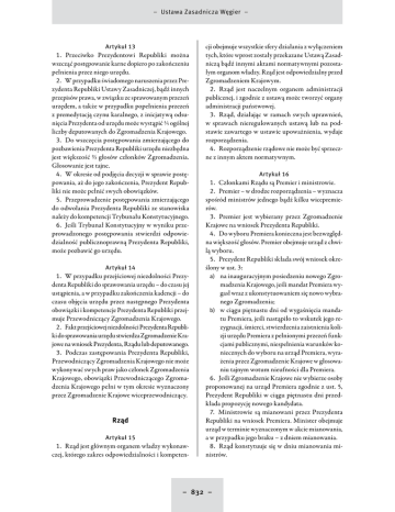 – Ustawa Zasadnicza Węgier – Artykuł 13 1. Przeciwko Prezydentowi Republiki można wszcząć postępowanie karne dopiero po zakończeniu pełnienia przez niego urzędu. 2. W przypadku świadomego naruszenia przez Prezydenta Republiki Ustawy Zasadniczej, bądź innych przepisów prawa, w związku ze sprawowanym przezeń urzędem, a także w przypadku popełnienia przezeń z premedytacją czynu karalnego, z inicjatywą odsunięcia Prezydenta od urzędu może wystąpić 1⁄5 ogólnej liczby deputowanych do Zgromadzenia Krajowego. 3. Do wszczęcia postępowania zmierzającego do pozbawienia Prezydenta Republiki urzędu niezbędna jest większość ⅔ głosów członków Zgromadzenia. Głosowanie jest tajne. 4. W okresie od podjęcia decyzji w sprawie postępowania, aż do jego zakończenia, Prezydent Republiki nie może pełnić swych obowiązków. 5. Przeprowadzenie postępowania zmierzającego do odwołania Prezydenta Republiki ze stanowiska należy do kompetencji Trybunału Konstytucyjnego. 6. Jeśli Trybunał Konstytucyjny w wyniku przeprowadzonego postępowania stwierdzi odpowiedzialność publicznoprawną Prezydenta Republiki, może pozbawić go urzędu. Artykuł 14 1. W przypadku przejściowej niezdolności Prezy- denta Republiki do sprawowania urzędu – do czasu jej ustąpienia, a w przypadku zakończenia kadencji – do czasu objęcia urzędu przez następnego Prezydenta obowiązki i kompetencje Prezydenta Republiki przejmuje Przewodniczący Zgromadzenia Krajowego. 2. Fakt przejściowej niezdolności Prezydenta Republiki do sprawowania urzędu stwierdza Zgromadzenie Krajowe na wniosek Prezydenta, Rządu lub deputowanego. 3. Podczas zastępowania Prezydenta Republiki, Przewodniczący Zgromadzenia Krajowego nie może wykonywać swych praw jako członek Zgromadzenia Krajowego, obowiązki Przewodniczącego Zgromadzenia Krajowego pełni w tym okresie wyznaczony przez Zgromadzenie Krajowe wiceprzewodniczący. Rząd Artykuł 15 1. Rząd jest głównym organem władzy wykonaw- czej, którego zakres odpowiedzialności i kompeten- cji obejmuje wszystkie sfery działania z wyłączeniem tych, które wprost zostały przekazane Ustawą Zasadniczą bądź innymi aktami normatywnymi pozostałym organom władzy. Rząd jest odpowiedzialny przed Zgromadzeniem Krajowym. 2. Rząd jest naczelnym organem administracji publicznej, i zgodnie z ustawą może tworzyć organy administracji państwowej. 3. Rząd, działając w ramach swych uprawnień, w sprawach nieregulowanych ustawą lub na podstawie zawartego w ustawie upoważnienia, wydaje rozporządzenia. 4. Rozporządzenie rządowe nie może być sprzeczne z innym aktem normatywnym. Artykuł 16 1. Członkami Rządu są Premier i ministrowie. 2. Premier – w drodze rozporządzenia – wyznacza spośród ministrów jednego bądź kilku wicepremierów. 3. Premier jest wybierany przez Zgromadzenie Krajowe na wniosek Prezydenta Republiki. 4. Do wyboru Premiera konieczna jest bezwzględna większość głosów. Premier obejmuje urząd z chwilą wyboru. 5. Prezydent Republiki składa swój wniosek określony w ust. 3: a) na inauguracyjnym posiedzeniu nowego Zgromadzenia Krajowego, jeśli mandat Premiera wygasł wraz z ukonstytuowaniem się nowo wybranego Zgromadzenia; b) w ciągu piętnastu dni od wygaśnięcia mandatu Premiera, jeśli nastąpiło to wskutek jego rezygnacji, śmierci, stwierdzenia zaistnienia kolizji urzędu Premiera z pełnionymi przezeń funkcjami publicznymi, niespełnienia warunków koniecznych do wyboru na urząd Premiera, wyrażenia przez Zgromadzenie Krajowe w głosowaniu tajnym wotum nieufności dla Premiera. 6. Jeśli Zgromadzenie Krajowe nie wybierze osoby proponowanej na urząd Premiera zgodnie z ust. 5, Prezydent Republiki w ciągu piętnastu dni przedkłada propozycję nowego kandydata. 7. Ministrowie są mianowani przez Prezydenta Republiki na wniosek Premiera. Minister obejmuje urząd w terminie wyznaczonym w akcie mianowania, a w przypadku jego braku – z dniem mianowania. 8. Rząd konstytuuje się w dniu mianowania ministrów. – 832 – – Magyarország Alaptörvénye – 9. Członkowie rządu składają przysięgę wobec Zgromadzenia Krajowego. cyzyjnym, mającym miejsce w instytucjach Unii Europejskiej, Rząd powinien uwzględniać stanowisko Zgromadzenia. Artykuł 17 1. Liczbę ministerstw reguluje ustawa. 2. W celu wykonania wyznaczonych przez Rząd zadań, może być powołany minister bez teki. 3. Organami rządowymi terytorialnej administracji państwowej o ogólnych kompetencjach są urzędy: stołeczny i wojewódzkie. 4. Przepisy ustawy organicznej określające ministerstwa, ministra bądź organy administracji publicznej mogą być zmienione ustawą. 5. Uprawnienia urzędników administracji rządowej określa ustawa. Artykuł 18 1. Premier określa główne kierunki polityki Rządu. 2. W ramach głównych kierunków polityki Rządu, minister samodzielnie kieruje działalnością podległych mu działów administracji publicznej i podporządkowanych mu organów, a także wykonuje zadania wyznaczone przez Rząd lub Premiera. 3. Członek Rządu, na podstawie swych ustawowych uprawnień bądź uprawnień otrzymanych na mocy rozporządzenia rządowego, działając w ramach swych kompetencji, może samodzielnie albo w porozumieniu z innym ministrem wydać rozporządzenie, które nie może być sprzeczne z ustawą, rozporządzeniem rządowym i rozporządzeniami Prezesa Narodowego Banku Węgierskiego. 4. Członkowie Rządu za swą działalność odpowiedzialni są przed Zgromadzeniem Krajowym, a ministrowie są odpowiedzialni również przed Premierem. Członek Rządu może brać udział w posiedzeniach Zgromadzenia i zabierać głos w trakcie obrad. Zgromadzenie i komisja parlamentarna mogą zobowiązać członka Rządu do obecności na swym posiedzeniu. 5. Szczegółowe przepisy dotyczące uprawnień członka Rządu, jego uposażenia, a także zastępowania ministrów określa ustawa. Artykuł 19 Zgromadzen