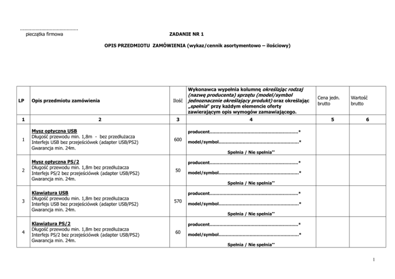 ......................................... pieczątka firmowa ZADANIE NR 1 OPIS PRZEDMIOTU ZAMÓWIENIA (wykaz/cennik asortymentowo – ilościowy) Wykonawca wypełnia kolumnę określając rodzaj LP Opis przedmiotu zamówienia Ilość (nazwę producenta) sprzętu (model/symbol jednoznacznie określający produkt) oraz określając „spełnia” przy każdym elemencie oferty Cena jedn. brutto Wartość brutto zawierającym opis wymogów zamawiającego. 1 1 2 3 4 2 Mysz optyczna USB Długość przewodu min. 1,8m - bez przedłużacza Interfejs USB bez przejeściówek (adapter USB/PS2) Gwarancja min. 24m. Mysz optyczna PS/2 Długość przewodu min. 1,8m bez przedłużacza Interfejs PS/2 bez przejeściówek (adapter USB/PS2) Gwarancja min. 24m. Klawiatura USB Długość przewodu min. 1,8m bez przedłużacza Interfejs USB bez przejeściówek (adapter USB/PS2) Gwarancja min. 24m. Klawiatura PS/2 Długość przewodu min. 1,8m bez przedłużacza Interfejs PS/2 bez przejeściówek (adapter USB/PS2) Gwarancja min. 24m. 3 4 5 6 producent………………………………………………………* 600 model/symbol…………………………………………………* Spełnia / Nie spełnia producent………………………………………………………* 50 model/symbol…………………………………………………* Spełnia / Nie spełnia producent………………………………………………………* 570 model/symbol…………………………………………………* Spełnia / Nie spełnia producent………………………………………………………* 60 model/symbol…………………………………………………* Spełnia / Nie spełnia 1 1 5 6 7 8 9 2 Pamięć flash – Pendrive Pojemność 32GB Interfejs USB 3.0 Gwarancja min. 36m. Pamięć flash – Pendrive Pojemność 16GB Interfejs USB 3.0 Gwarancja min. 36m. Pamięć flash – Pendrive Pojemność 8GB Interfejs USB 3.0 Gwarancja min. 36m. Czytniki kart mikroprocesorowych zewnętrznych USB a) Czytnik kart musi być zgodny ze standardem PC/SC. b) Czytnik kart musi być zgodny ze standardem Microsoft WHQL (Microsoft Windows Hardware Quality Labs). c) Czytnik musi umożliwiać odczyt dostępnych na rynku kart kryptograficznych zgodnych z normą ISO-7816, a w szczególności umożliwiać współpracę z kartą w standardzie PKCS#11 co najmniej w wersji 2.01. d) Czytnik musi posiadać sygnalizację optyczną (np. diodową) akceptacji karty, pracy z kartą. e) Czytnik musi współpracować z kartami mikroprocesorowymi Cryptotech Multisign i Encard. Gwarancja min. 24m. Karta Graficzna Interfejs PCI-Express x16 Zgodność programowa DirectX 11, Shader Model 4.1 Osiągająca w teście wydajności videocadrbenchmark co najmniej wynik 220 punktów G3D Mark. Gwarancja min. 24m. 3 4 5 6 producent………………………………………………………* 30 model/symbol…………………………………………………* Spełnia / Nie spełnia producent………………………………………………………* 40 model/symbol…………………………………………………* Spełnia / Nie spełnia producent………………………………………………………* 65 model/symbol…………………………………………………* Spełnia / Nie spełnia producent………………………………………………………* 10 model/symbol…………………………………………………* Spełnia / Nie spełnia producent………………………………………………………* 110 model/symbol…………………………………………………* Spełnia / Nie spełnia 2 1 10 2 Płyta główna do PC wraz z procesorem Procesor min. 2x2.7 GHz Pamięć RAM DDR 3 min. 4GB Chłodzenie procesora Zintegrowana karta graficzna Gniazda na płycie SATA min. 2 szt. USB 4x Karta sieciowa zintegrowana Gwarancja min. 24m 3 5 6 producent………………………………………………………* 10 model/symbol…………………………………………………* Spełnia / Nie spełnia Płyta DVD-+R Opakowanie Slim 11 4 producent………………………………………………………* 7040 model/symbol…………………………………………………* Spełnia / Nie spełnia Płyta DVD+RW Opakowanie Slim 12 producent………………………………………………………* 50 model/symbol…………………………………………………* Spełnia / Nie spełnia Płyta CD-RW Opakowanie Slim 13 producent………………………………………………………* 50 model/symbol…………………………………………………* Spełnia / Nie spełnia Płyta CD-R Opakowanie Slim 14 producent………………………………………………………* 10540 model/symbol…………………………………………………* Spełnia / Nie spełnia 15 Dysk wewnętrzny 3,5’’ Pojemność min. 500GB Interfejs SATA Gwarancja min. 36m. producent………………………………………………………* 60 model/symbol…………………………………………………* Spełnia / Nie spełnia 3 1 16 2 Dysk wewnętrzny 2,5’’ Pojemność min. 500GB Interfejs SATA Gwarancja min. 36m. 3 4 5 6 producent………………………………………………………* 40 model/symbol…………………………………………………* Spełnia / Nie spełnia 17 Karta sieciowa 10/100/1000 mbit/s Interfejs PCI Wyjście RJ45 Gwarancja min. 24m. producent………………………………………………………* 20 model/symbol…………………………………………………* Spełnia / Nie spełnia 18 Nagrywarka wewnętrzna 5,25’’ DVD-+RW Interfejs SATA Gwarancja min. 24m. producent………………………………………………………* 60 model/symbol…………………………………………………* Spełnia / Nie spełnia 19 Nagrywarka w