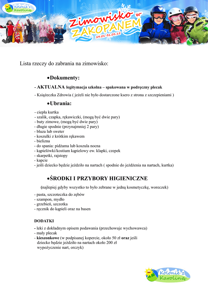 Lista rzeczy do zabrania na zimowisko: • Dokumenty: - AKTUALNA legitymacja szkolna – spakowana w podręczny plecak - Książeczka Zdrowia ( jeżeli nie było dostarczone ksero z strona z szczepieniami ) • Ubrania: - ciepła kurtka - szalik, czapka, rękawiczki, (mogą być dwie pary) - buty zimowe, (mogą być dwie pary) - długie spodnie (przynajmniej 2 pary) - bluza lub sweter - koszulki z krótkim rękawem - bielizna - do spania: pidżama lub koszula nocna - kąpielówki/kostium kąpielowy ew. klapki, czepek - skarpetki, rajstopy - kapcie - jeśli dziecko będzie jeździło na nartach ( spodnie do jeżdżenia na nartach, kurtka) • ŚRODKI I PRZYBORY HIGIENICZNE (najlepiej gdyby wszystko to było zebrane w jedną kosmetyczkę, woreczek) - pasta, szczoteczka do zębów - szampon, mydło - grzebień, szczotka - ręcznik do kąpieli oraz na basen DODATKI - leki z dokładnym opisem podawania (przechowuje wychowawca) - mały plecak - kieszonkowe (w podpisanej kopercie, około 50 zł oraz jeśli dziecko będzie jeździło na nartach około 200 zł wypożyczenie nart, orczyk)