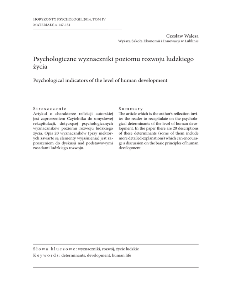 HORYZONTY PSYCHOLOGII, 2014, TOM IV MATERIAŁY, s. 147-151 Czesław Walesa Wyższa Szkoła Ekonomii i Innowacji w Lublinie Psychologiczne wyznaczniki poziomu rozwoju ludzkiego życia Psychological indicators of the level of human development Streszczenie Artykuł o charakterze refleksji autorskiej jest zaproszeniem Czytelnika do umysłowej rekapitulacji, dotyczącej psychologicznych wyznaczników poziomu rozwoju ludzkiego życia. Opis 20 wyznaczników (przy niektórych zawarte są elementy wyjaśnienia) jest zaproszeniem do dyskusji nad podstawowymi zasadami ludzkiego rozwoju. Summary The article which is the author’s reflection invites the reader to recapitulate on the psychological determinants of the level of human development. In the paper there are 20 descriptions of these determinants (some of them include more detailed explanations) which can encourage a discussion on the basic principles of human development. S ł o w a k l u c z o w e : wyznaczniki, rozwój, życie ludzkie K e y w o r d s : determinants, development, human life 148 Cz. Walesa, Psychologiczne wyznaczniki poziomu rozwoju ludzkiego życia HORYZONTY PSYCHOLOGII, 2014, TOM IV – MATERIAŁY Wyznaczniki rozwoju w niniejszym ujęciu zawierają w sobie ładunek informacyjny wskaźników rozwoju i moc sprawczą oraz potencjał uwarunkowań czynników rozwoju. Sposób sformułowania, kolejność i liczba tych wyznaczników rozwoju – stanowią propozycję do przemyślenia i treści do przedyskutowania. Całość jest propozycją i zaproszeniem do refleksji, poszukiwania i wnikliwego wykrywania oraz twórczego kształtowania orientujących jednostek informacyjnych wskazujących na poziom rozwoju ludzkiego życia. Sposób treściowego ujmowania, dyskurs i wywody logiczne utrzymane są w poznawczo-rozwojowej koncepcji człowieka. 1. Pozytywny kierunek zmian w przebiegu ludzkiego życia. W miarę rozwoju ludzkiego życia coraz więcej jest procesów i tendencji pozytywnie ukierunkowanych, które stają się podstawą dalszego rozwoju i nabytków rozwojowych. Uwidaczniają się one w usensownionych formach pełnej ludzkiej aktywności: w zabawie, nauce, pracy, w sposobach spędzania wolnego czasu, w modlitwie – ogólnie w aktywności indywidualnej i podzielanej oraz w swoistym „wywąchiwaniu” kierunku dalszego rozwoju. 2. Tendencje samorozwojowe. Zasadniczo przez całe życie występują z różnym natężeniem i w różnej formie: aktywność własna, inicjatywność, spontaniczność, równoważenie majoryzujące, samosterowność i przekraczanie granic dotychczasowych osiągnięć rozwojowych (transgresja, transcendowanie), samowychowanie i wykraczanie poza siebie (samotranscendencja) – w różnych grupach ludzkich. 3. Intencjonalność w ujmowaniu i kreowaniu zdarzeń życiowych. Intencja bywa złączona z celem danej aktywności, a niekiedy ma charakter autonomiczny. Intencjonalność jest przeniknięta i objęta świadomością i autoświadomością. Niektóre cele są kreowane, a inne przejęte ze środowiska wychowawczego i kulturowego; istnieją też cele pośrednie: często idee i zarysy celu są przejęte ze środowiska, a pozostałe komponenty są kreowane i rozpracowane przez jednostkę. 4. Program własnego działania i życia. Pomyślny przebieg życia człowieka dorosłego, zwłaszcza na poziomie wyższym, wymaga uświadomionego programu własnego rozwoju: człowiek wie, czego w życiu chce i w czym ma się spełnić. 5. Preferencje i wartości. W miarę przebiegu ludzkiego życia następuje ukształtowanie właściwych i adekwatnych preferencji. Wartości jako zasady tych preferencji tworzą odpowiednią hierarchię, tak że wartości instrumentalne podporządkowane są wartościom finalnym i ostatecznym. 6. Informacja i energia. Pomyślny rozwój wymaga nie tylko odpowiedniej informacji, ale i formacji, energii i fascynacji. Jednocześnie powinna wystąpić przewaga informacji nad fascynacją, co przejawia się w tym, że coraz więcej przeżyć ma charakter zjawisk uzasadnionych. W wielu sytuacjach i okolicznościach występuje nadmiar informacji przy jednoczesnym niedoborze energii. Niekiedy dużo wiemy i nic z tego nie wynika. Cz. Walesa, Psychologiczne wyznaczniki poziomu rozwoju ludzkiego życia HORYZONTY PSYCHOLOGII, 2014, TOM IV – MATERIAŁY 149 7. Funkcja celów. Jak funkcja symboliczna we wczesnym dzieciństwie tak funkcja celów we wczesnych okresach dorosłości pełni doniosłą rolę w rozwoju ludzkiego życia. Z funkcją celów łączy się intencjonalność, a z nią poczucie, że się jest podmiotem, który poznając coś i chcąc czegoś – kieruje się i zmierza ku określonemu celowi. 8. Symbolizacja zdarzeń życiowych. Coraz więcej zdarzeń zostaje ujętych w sferze symbolicznej. Podstawowe jest ujmowanie językowe. Istotne są również inne formy symbolicznego ujmowania zdarzeń życiowych, np. graficzne, mimiczne i inne. Czymś doniosłym jest przyjmowanie i asymilowanie symboli kulturowych (wrastanie w daną kulturę). 9. Autonomia i komunikowanie egzystencjalne. W miarę rozwoju ludzkiego życia następuje zwiększanie się autonomii i uniezależnienia od warunków tu i teraz, co sprzyja wymianie osobowej: dawanie swego życia drugiemu i wzajemne branie życia od tego drugiego – w oparciu o wiedzę: „kim jestem” i „kim jest ten drugi”. 10. Kompetencje kompensacyjne. Zwiększają się od początku życia ludzkiego kompetencje kompensacyjne, a dzięki temu – otwartość i elastyczność osobowa, a zarazem, w miarę rozwoju ludzkiego życia, zwłaszcza od okresu dorastania, kształtuje się zdolność do zachowania swojej struktury osobowej i tożsamości. 11. Człowiek jako podmiot i osoba. W miarę rozwoju swego życia człowiek coraz bardziej czuje się podmiotem i osobą, a także odpowiedzialnym sprawcą, co skutkuje coraz lepszymi decyzjami, a zwłaszcza decyzjami życiowo doniosłymi. 12. Ekspresja życiowa. W miarę rozwoju ludzkiego życia udoskonala 