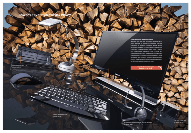 Nowoczesne stanowiska pracy W pełni wyposażone, w pełni funkcjonalne Zero Client firmy Pano Logic, opracowany na potrzeby wirtualizacji desktopów, to najmniejsze i najprostsze urządzenie przeznaczone do współpracy z systemem Windows. Monitor LED Samsung SyncMaster S27A950D zachwyca futurystycznym wzornictwem i doskonałą jakością obrazu. Szybką i wygodną pracę zapewnia skaner dokumentów Canon P-150 oraz bezprzewodowa mysz Arc Touch i klawiatura Arc firmy Microsoft. Większą swobodę ruchów gwarantuje bezprzewodowy zestaw słuchawkowy Jabra PRO 9470 z kolorowym wyświetlaczem dotykowym. Stylowa lampa LED MAULprimus dzięki odpowiedniemu oświetleniu zapewnia ergonomiczną pracę. Skaner dokumentów Canon P-150 Indywidualne doradztwo pod numerem 71 337 26 44 nr Bechtle: 597935 Stylowa lampa LED MAULprimus nr Bechtle: 601943 Monitor LED Samsung SyncMaster S27A950D Mysz Microsoft Arc Touch nr Bechtle: 684066 nr Bechtle: 629051 Klawiatura Microsoft Arc, czarna nr Bechtle: 601945 Zero Client G2 Pano Logic Bezprzewodowy zestaw słuchawkowy Jabra PRO 9470 Mono nr Bechtle: 595421 nr Bechtle: 667233