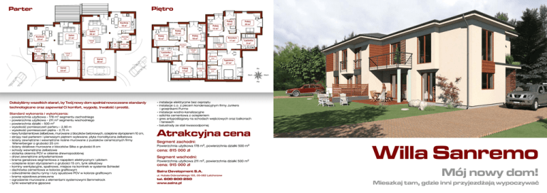 Pietro Parter Kuchnia 10 m2 Salon 31 m2 Kuchnia 24 m2 Salon 44 m2 Wiatrołap 3 m2 Schody 5 m2 , WC 2 m2 Garderoba 3 m2 Wiatrołap 2,5 m2 Garderoba 2,5 m2 WC 2,5 m2 Pokój 15 m2 Pokój 13 m2 Pokój 12 m2 Pokój 18 m2 Schody 5 m2 Pokój 20 m2 Łazienka 9 m2 Schody 5 m2 Garderoba 6 m2 Garaż 40 m2 Garaż 22 m2 Korytarz 11 m2 Korytarz 6 m2 Łazienka 11 m2 Schody 5 m2 Pokój 10 m2 Pokój 17 m2 Garderoba 5 m2 Sypialnia 27 m2 Płn Łazienka 6 m2 Zach Wsch Płd Dołożyliśmy wszelkich starań, by Twój nowy dom spełniał nowoczesne standardy technologiczne oraz zapewniał Ci komfort, wygodę, trwałość i prestiż. Standard wykonania i wykończenia: - powierzchnia użytkowa - 178 m2 segmentu zachodniego powierzchnia użytkowa - 211 m2 segmentu wschodniego powierzchnia działki - 500 m2 wysokość pomieszczeń parteru - 2,90 m wysokość pomieszczeń piętra - 2,75 m ławy fundamentowe żelbetowe, murowane z bloczków betonowych, ocieplone styropianem 10 cm, stropy nad parterem i pierwszym piętrem wylewane; płyta monolityczna żelbetowa ściany zewnętrzne i wewnętrzne nośne murowane z pustaków ceramicznych firmy Wienerberger o grubości 25 cm ściany działowe murowane z bloczków Silka o grubości 8 cm schody wewnętrzne żelbetowe stolarka okienna PCV w okleinie drewnopodobnej drzwi zewnętrzne antywłamaniowe brama garażowa segmentowa z napędem elektrycznym i pilotem ocieplanie ścian styropianem o grubości 15 cm, tynk silikatowy kominy wentylacyjne, spalinowe, miejsce na kominek w systemie Schiedel dachówka cementowa w kolorze grafitowym odwodnienie dachu rynny i rury spustowe PCV w kolorze grafitowym brama wjazdowa przesuwna ogrodzenie murowane z elementami systemowymi Semmelrock tynki wewnętrzne gipsowe - instalacje elektryczne bez osprzętu - instalacje c.o. z piecem kondensacyjnym firmy Junkers i grzejnikami Purmo - instalacje wodno-kanalizacyjne - szlichta cementowa z ociepleniem - gres antypoślizgowy na schodach wejściowych oraz balkonach i tarasach - balustrady ze stali kwasoodpornej Atrakcyjna cena Segment zachodni: Powierzchnia użytkowa 178 m2, powierzchnia działki 500 m2 cena: 815 000 zł Segment wschodni: Powierzchnia użytkowa 211 m2, powierzchnia działki 500 m2 cena: 915 000 zł Sainz Development S.A. ul. Hubala Dobrzańskiego 155, 05-082 Latchorzew tel. 600 800 250 www.sainz.pl Willa Sanremo Mój nowy dom! Mieszkaj tam, gdzie inni przyjezdzaja wypoczywac Lipków Willa Sanremo ul. Lazurowa Stare Babice ul. W arsz rodn ic za awsk a ul. O g icza kiew Rynek ch sk i Śl ą ow a ńc ów di Sien łudnio wa Ra ul .P ow st a ul. yka za owic ul. Po Warszawa enr ul. H ub -Jak Willa Sanremo to budynek bliźniaczy zlokalizowany w Lipkowie przy zachodniej granicy Warszawy w otulinie Kampinowskiego Parku Narodowego. Najbliższe sąsiedztwo to wyłącznie niska zabudowa jednorodzinna. Położenie w pobliżu szkół, przedszkoli i sklepów oraz komunikacji miejskiej ułatwia codzienne życie. Architekturę domów wyróżnia nowoczesna forma oraz dbałość o szczegóły architektoniczne, które sprawiają, że czuje się komfort i wygodę mieszkania w wysokiej jakości domach. alisa asch ul. P Willa Sanremo ul. Karabeli S8 ska ul. Górczew Mój nowy dom • • • • indywidualny projekt wysoki standard wykonania dbałość o szczegóły ergonomiczne i komfortowe zagospodarowanie powierzchni dla Twojej rodziny Komfort zycia Willa Lipkowa Willa Sanremo to nie tylko piękna i funkcjonalna architektura! Liczy się Twoje wygodne życie i możliwości rozwoju dla Ciebie i Twojej rodziny. Ciesz się życiem u boku czystej natury i jednoczesną bliskością wielkiego miasta. W • • • • • pobliżu: Las - 200 m Szkoła i przedszkole - 2,5 km Supermarket Marcpol - 2 km Trasa szybkiego ruchu S8 - 6 km Przystanek autobusowy - 400 m