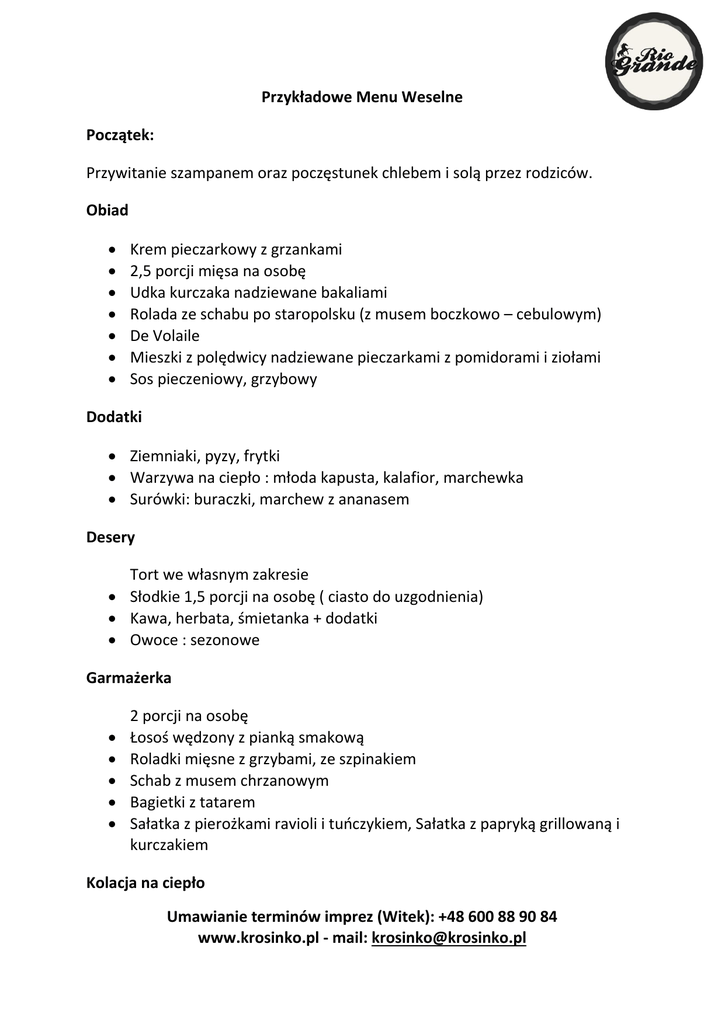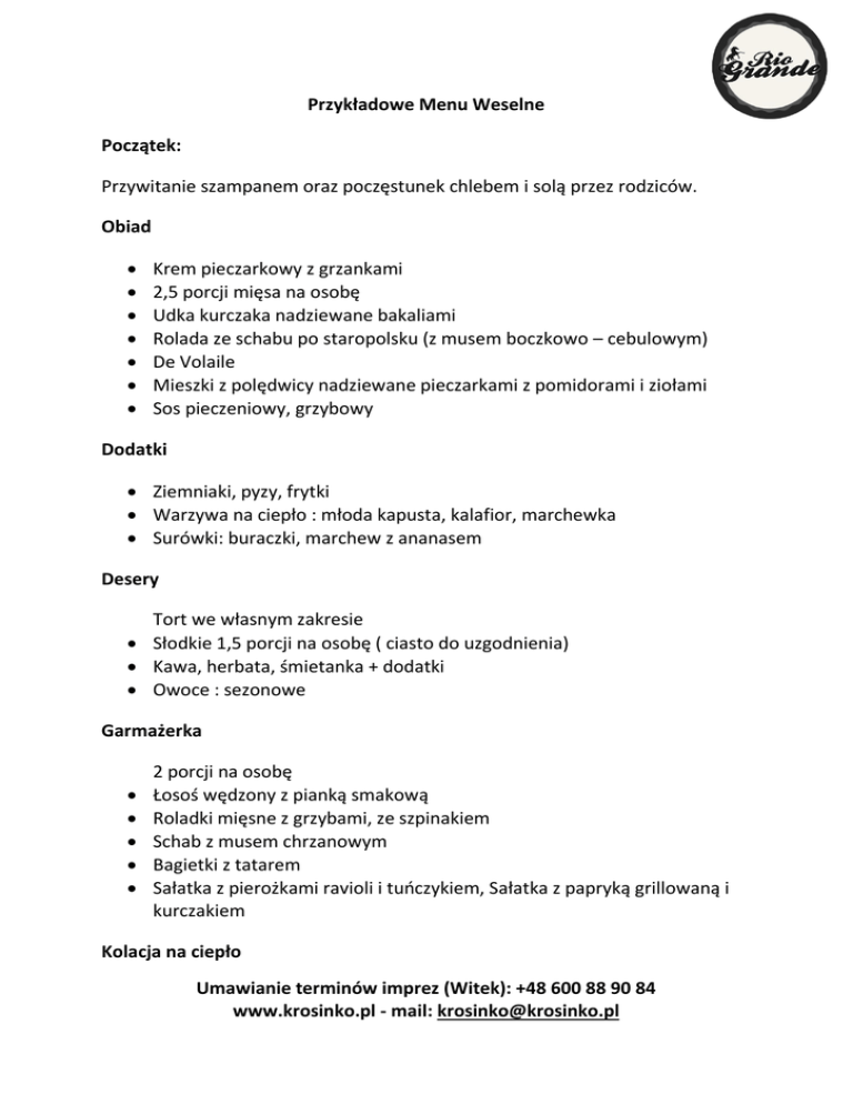 Przykładowe Menu Weselne Początek: Przywitanie szampanem oraz poczęstunek chlebem i solą przez rodziców. Obiad Krem pieczarkowy z grzankami 2,5 porcji mięsa na osobę Udka kurczaka nadziewane bakaliami Rolada ze schabu po staropolsku (z musem boczkowo – cebulowym) De Volaile Mieszki z polędwicy nadziewane pieczarkami z pomidorami i ziołami Sos pieczeniowy, grzybowy Dodatki Ziemniaki, pyzy, frytki Warzywa na ciepło : młoda kapusta, kalafior, marchewka Surówki: buraczki, marchew z ananasem Desery Tort we własnym zakresie Słodkie 1,5 porcji na osobę ( ciasto do uzgodnienia) Kawa, herbata, śmietanka + dodatki Owoce : sezonowe Garmażerka 2 porcji na osobę Łosoś wędzony z pianką smakową Roladki mięsne z grzybami, ze szpinakiem Schab z musem chrzanowym Bagietki z tatarem Sałatka z pierożkami ravioli i tuńczykiem, Sałatka z papryką grillowaną i kurczakiem Kolacja na ciepło Umawianie terminów imprez (Witek): +48 600 88 90 84 www.krosinko.pl - mail: [email protected] Barszcz z krokietem Golonka faszerowana kapustą kwaszoną. Soki, woda, napoje gazowane bez limitu podczas całej imprezy Cena za osobę 130 zł Dodatkowo: ognisko ( rozpalone ok. 22:00) wraz z kiełbaskami dostępnymi u obsługi – gratis wystrojenie Sali w kwiaty, stroiki, świece itp. – 700 zł. przedłużenie trwania przyjęcia 150 zł/h przejazd bryczką dla gości po okolicy 1 h + przejazd z kościoła do lokalu – 200 zł dzieci do lat 6 nie uwzględnione w rozliczeniu orkiestra – wyżywienie – 50% stawki podstawowej We własnym zakresie: alkohol, napoje gazowane, dj lub orkiestra. Na zewnątrz przygotowane będzie boisko do piłki nożnej, kometki, batuta Menu jest przygotowywane z niezwykłą starannością pod indywidualne życzenia i gusta naszych gości, a w smaku potraw odkryjecie prawdziwą rozkosz. MENU do wyboru Zupy (do wyboru) Krem szparagowy z groszkiem ptysiowym Krem pieczarkowy z grzankami Krem pomidorowy z serkiem mascarpone i bazylią Delikatna zupa cebulowa z grzanką serową Zupa grzybowa z pianką ziołową Drugie danie (do wyboru) Kaczka faszerowana w całości Koperty z kurczaka nadziewane szpinakiem, karczochami i suszonymi pomidorami Cygara z polędwiczki wieprzowej nadziewane serem pleśniowym i szynką Umawianie terminów imprez (Witek): +48 600 88 90 84 www.krosinko.pl - mail: [email protected] Mieszki z polędwiczki nadziewane pieczarkami z pomidorami i ziołami Udka z kurczaka nadziewane bakaliami Trio mięsne (schab, polędwiczki, drób) zawinięte w kształcie chruścika Rolady ze schabu po staropolsku ( z musem boczkowo – cebulowym) De Volaile Panierowane koperty ze schabu lub indyka z szynką, serem i pomidorem z ziołami Łosoś z sosem cytrusowym Roladki z pstrąga ze szpinakiem, suszonymi pomidorami i migdałami Uda z kaczki w sosie pieczeniowo – pomarańczowym Roladki z kurczaka nadziewane warzywami i serem Żeberka w miodzie z ryżem tureckim Kofty wieprzowe z nutą mięty Szaszłyki orientalne z udek kurczaka Zraz staropolski ze schabu w sosie pieczeniowo – śmietanowym Duet rybny na sposób włoski z suszonymi pomidorami i mozzarellą Łosoś zapiekany w pergaminie z sosem cytrusowym i makaronem precle Medaliony z indyka we włoskiej panierce Dorsz w aromatycznej chrupiącej kukurydzianej panierce Przysmak z polędwiczki wieprzowej a’lastrogonow Nadziewana pierś z indyka w cieście piwnym Warzywa na ciepło (do wyboru) Szparagi, kapusta czerwona z jabłkami, młoda kapusta, kalafior, młoda marchew Surówki (do wyboru) Buraki z jabłkami, por z kukurydzą, marchew z selera i ananasem Dodatki (do wyboru) Kulki ziemniaczane, młode ziemniaki z koperkiem, pyzy, frytki, kopytka Sosy Pieczeniowy, grzybowy, kurki w śmietanie z koperkiem Kolacja na zimno Umawianie terminów imprez (Witek): +48 600 88 90 84 www.krosinko.pl - mail: [email protected] Ryby w galarecie (łosoś, sandacz, tilapia, pstrąg) Łosoś wędzony z pianką smakową (koperkowa, ziołowa, cytrusowa) Roladki mięsne: z grzybami, z bakaliami, ze szpinakiem, rostbef na czerwono, schab z musem (chrzanowym, pieprzowym) Taca serów z owocami Sałatki: z pierożkami ravioli i tuńczykiem, z papryką grillowaną z indykiem , z marynowanym łososiem w soku cytrusowym, serowa z mixem serów, sałatka tajska z rostbefem Sałatka z wędzonego kurczaka i ananasa Sałatka makaronowa z brokułami i serem Sałatka ziemniaczana w towarzystwie ryb wędzonych Sałatka meksykańska z kurczakiem i kukurydzą Koktajl z krewetek lub indyka Mięsa na ciepło Golonka po bawarsku faszerowana kapustą kwaszoną, strogonow z borowikami Tarta z boczkiem i grzybami Tarta z brokułami i serem pleśniowym Są to tylko niektóre z naszych propozycji. Jeżeli zapragną Państwo innych potraw z przyjemnością je przygotujemy. Na specjalne życzenia przyrządzamy pieczonego prosiaka, szynkę, dziczyzną – jak szeryf ją upoluje. Umawianie terminów imprez (Witek): +48 600 88 90 84 www.krosinko.pl - mail: [email protected]