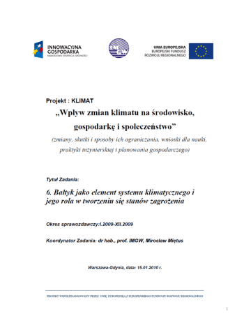 1 Wpływ zmian klimatycznych na zmiany średniego poziomu i występowania jego ekstremalnych wartości w rejonie polskiego wybrzeża Morza Bałtyckiego oraz scenariusze zmian PODZADANIE 6.1. 1. Cel badań Głównym celem pracy jest określenie relacji pomiędzy regionalnym czynnikiem wymuszającym a zmianami poziomów morza w rejonie polskiego wybrzeża Morza Bałtyckiego za pomocą statystyczno - empirycznych modeli (statystyczny downscaling) oraz ocena długoterminowych zmian intensywności występowania poziomów morza. Ponadto celem pracy jest między innymi określenie związku pomiędzy częstością i wysokością wezbrań sztormowych, wieloletnimi zmianami średniego poziomu morza a także występowaniem niskich poziomów morza a regionalnymi procesami atmosferycznymi. Prowadzone były także badania nad przystosowaniem modeli hydrodynamicznych do modelowania zmian poziomów morza wymuszonych zmianami klimatycznymi. 2. Zakres wykonywanych prac W okresie I.2009-XII.2009 zrealizowano następujące zadania: Uzupełniono bazę danych w zakresie średnich i ekstremalnych dobowych wartości poziomu morza dla wybranych stacji polskiego wybrzeża dla okresu 1951-2008 i wyznaczono wskaźniki charakterystyczne (poziom średni miesięczny, kwantyl 5% poziomu minimalnego, kwanty 95% i 99% poziomu maksymalnego) Pozyskano ze światowych centrów danych dane niezbędne do opisu cyrkulacji atmosferycznej w rejonie Europy i Północnego Atlantyku Skonstruowano analogowy model opisujący relację „cyrkulacja atmosferyczna – poziom morza” dla średniego poziomu i występowania jego ekstremalnych wartości dla okresu 19711990 oraz dokonano jego weryfikacji Dokonano oceny zmienności średnich i ekstremalnych poziomów morza na polskim wybrzeżu w okresie 1951-2008, wyznaczono współczynniki trendu i wykonano wykresy Wyznaczono funkcje własne (EOF) poziomów morza na polskim wybrzeżu w okresie 19512008 oraz dokonano oceny ich zmienności w oparciu o składowe główne: wyznaczono współczynniki trendu składowych głównych obliczono zmiany poziomu morza na podstawie danych obserwacyjnych i analizy EOF 2 utworzono wykresy zmian poziomu morza dla miesięcy, sezonów i roku w okresie 19512008 Wyznaczono relacje między polem regionalnym a polem lokalnym na podstawie metody korelacji kanonicznych i analizy redundancyjnej w okresie 1971-1990 dla miesięcy, pór roku i sezonów Wykreślono w programie Gradsc mapy kanonicznego i redundancyjnego pola regionalnego nad Europą i północnym Atlantykiem dla średniego, maksymalnego (kwantyl 95% i 99%) i minimalnego (kwantyl 5%) poziomu morza dla każdego miesiąca, pór roku, sezonów oraz roku Dokonano weryfikacji klimatycznych modeli dotyczących zmian poziomu morza w oparciu o metodę CCA i RDA - poziom średni, kwantyl 5% poziom minimalny, kwantyl 95% i 99% poziom maksymalny Obliczono ilość reprodukowanej wariancji w odtworzonych na podstawie modelu CCA i RDA seriach średniego, maksymalnego i minimalnego poziomu morza dla okresu referencyjnego 1971-1990 oraz dla okresu pełnego Pozyskano wyniki globalnych modeli klimatycznych dla wybranych scenariuszy emisyjnych ze światowych centrów bazodanowych niezbędne do opisu cyrkulacji atmosferycznej dla rejonu europejsko-atlantyckiego. Rozpoczęto procedurę przygotowywania plików wsadowych/PRN niezbędnych do opracowania scenariuszy zmian charakterystyk poziomu morza w oparciu o modele statystyczno-empirycznego downscalingu Wyznaczono funkcje własne pola ciśnienia dla okresu 2011-2030 na podstawie danych z globalnego modelu Echam5 dla scenariusza emisyjnego 1% CO2 do 2x (run 1, run 2 i run 3) i B1 (run 1 i run 3) oraz A1B. Ponadto rozpoczęto wykreślanie w programie Gradsc map funkcji własnych pola ciśnienia Wyznaczono funkcje własne pola ciśnienia dla okresu 1971-1990 na podstawie danych z reanalizy NCEP/NCAR oraz wykreślono w programie Gradsc mapy funkcji własnych pola ciśnienia Ocena długoterminowych zmian intensywności występowania poziomów morza w rejonie polskiego wybrzeża Morza Bałtyckiego w latach 1955-2008 Przystosowanie modeli hydrodynamicznych do modelowania zmian poziomów morza wymuszonych zmianami klimatycznymi. 3 3. Opis metodyki badań Analizie poddano średni miesięczny poziom morza, jak również maksymalne (kwantyl 95% i 99%) i minimalne (kwantyl 5%) wartości tego elementu za okres 1951-2008 na wybranych stanowiskach, rozmieszczonych wzdłuż polskiego wybrzeża Bałtyku (Świnoujście, Kołobrzeg, Ustka, Łeba, Władysławowo, Hel, Gdynia, Gdańsk Port Północny, Gdańsk Ujście Wisły). Poddane analizie serie pochodziły ze zweryfikowanej jednorodnej bazy danych Oddziału Morskiego Instytutu Meteorologii i Gospodarki Wodnej. Głównym kryterium doboru stacji była jak najmniejsza ilość braków w seriach danych. W celu znalezienia związku między lokalną cyrkulacją atmosferyczną nad południowym Bałtykiem a zmianami poziomu morza na polskim wybrzeżu dokonano konstrukcji modelu analogowego „cyrkulacja atmosferyczna w skali lokalnej – poziom morza”. Do opisu lokalnej cyrkulacji atmosferycznej wykorzystano wartości wektora wiatru geostroficznego, obliczone na podstawie wartości ciśnienia atmosferycznego w trzech stacjach: Świnoujście, Hel i Visby. Danymi wejściowymi do modelu były średnie miesięczne, sezonowe i roczne wartości składowej południkowej i strefowej wiatru geostroficznego. Dane charakteryzujące zmiany poziomu morza pochodziły z 9 wyżej wymienionych stacji. Wykorzystano dane o poziomie średnim w skali miesięcznej, sezonowej oraz rocznej, stany ekstremalne zostały opisano poprzez wartości kwantyla 95% i 5%. Wpływ lokalnej cyrkulacji atmosferycznej został określony w wyniku skonstruowania równań regresji wielokrotnej. Stopień dopasowania zmiennych oceniono na podstawie wartości współczynnika determinacji (R2). Do konstrukcji modelu wykorzystano dane z przyjętego okresu referencyjnego 1971-1990. Skonstruowano ta