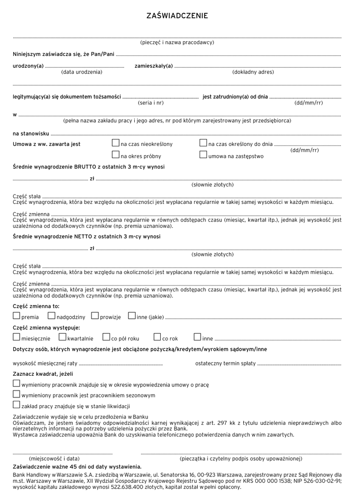ZAŚWIADCZENIE .............................................................................................................................................................................................................................................................................. (pieczęć i nazwa pracodawcy) Niniejszym zaświadcza się, że Pan/Pani ......................................................................................................................................................................................... urodzony(a) ................................................................. (data urodzenia) zamieszkały(a) ......................................................................................................................................... (dokładny adres) .............................................................................................................................................................................................................................................................................. legitymujący(a) się dokumentem tożsamości ...................................................................... jest zatrudniony(a) od dnia .................................................................. (seria i nr) (dd/mm/rr) w ......................................................................................................................................................................................................................................................................... (pełna nazwa zakładu pracy i jego adres, nr pod którym zarejestrowany jest przedsiębiorca) na stanowisku ............................................................................................................................................................................................................................................... na czas nieokreślony Umowa z ww. zawarta jest na okres próbny na czas określony do dnia ....................................................... (dd/mm/rr) umowa na zastępstwo Średnie wynagrodzenie BRUTTO z ostatnich 3 m-cy wynosi .............................................................. zł .......................................................................................................................................................................................................... (słownie złotych) Część stała ...................................................................................................................................................................................................................................................... Część wynagrodzenia, która bez względu na okoliczności jest wypłacana regularnie w takiej samej wysokości w każdym miesiącu. Część zmienna .............................................................................................................................................................................................................................................. Część wynagrodzenia, która jest wypłacana regularnie w równych odstępach czasu (miesiąc, kwartał itp.), jednak jej wysokość jest uzależniona od dodatkowych czynników (np. premia uznaniowa). Średnie wynagrodzenie NETTO z ostatnich 3 m-cy wynosi .............................................................. zł .......................................................................................................................................................................................................... (słownie złotych) Część stała ...................................................................................................................................................................................................................................................... Część wynagrodzenia, która bez względu na okoliczności jest wypłacana regularnie w takiej samej wysokości w każdym miesiącu. Część zmienna .............................................................................................................................................................................................................................................. Część wynagrodzenia, która jest wypłacana regularnie w równych odstępach czasu (miesiąc, kwartał itp.), jednak jej wysokość jest uzależniona od dodatkowych czynników (np. premia uznaniowa). Część zmienna to: premia nadgodziny prowizje inne (jakie) ................................................................................................................................................. Część zmienna występuje: miesięcznie kwartalnie co pół roku co rok inne ........................................................................................................ Dotyczy osób, których wynagrodzenie jest obciążone pożyczką/kredytem/wyrokiem sądowym/inne wysokość miesięcznej raty ........................................................................ ostateczny termin spłaty ........................................................................ Zaznacz kwadrat, jeżeli wymieniony pracownik znajduje się w okresie wypowiedzenia umowy o pracę wymieniony pracownik jest pracownikiem sezonowym zakład pracy znajduje się w stanie likwidacji Zaświadczenie wydaje się w celu przedłożenia w Banku Oświadczam, że jestem świadomy odpowiedzialności karnej wynikającej z art. 297 kk z tytułu udzielenia nieprawdziwych albo nierzetelnych informacji na potrzeby udzielenia pożyczki przez Bank. Wystawca zaświadczenia upoważnia Bank do uzyskiwania telefonicznego potwierdzenia danych w nim zawartych. .................................................................................. (miejscowość i data) .............................................................................................................................