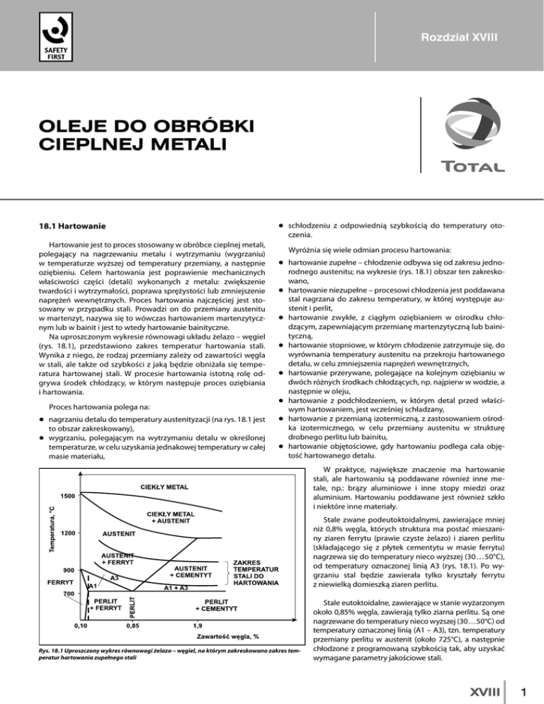 Rozdział XVIII: Oleje do obróbki cieplnej metali Rozdział XVIII OLEJE DO OBRÓBKI CIEPLNEJ METALI 18.1 Hartowanie Hartowanie jest to proces stosowany w obróbce cieplnej metali, polegający na nagrzewaniu metalu i wytrzymaniu (wygrzaniu) w temperaturze wyższej od temperatury przemiany, a następnie oziębieniu. Celem hartowania jest poprawienie mechanicznych właściwości części (detali) wykonanych z metalu: zwiększenie twardości i wytrzymałości, poprawa sprężystości lub zmniejszenie naprężeń wewnętrznych. Proces hartowania najczęściej jest stosowany w przypadku stali. Prowadzi on do przemiany austenitu w martenzyt, nazywa się to wówczas hartowaniem martenzytycznym lub w bainit i jest to wtedy hartowanie bainityczne. Na uproszczonym wykresie równowagi układu żelazo – węgiel (rys. 18.1), przedstawiono zakres temperatur hartowania stali. Wynika z niego, że rodzaj przemiany zależy od zawartości węgla w stali, ale także od szybkości z jaką będzie obniżała się temperatura hartowanej stali. W procesie hartowania istotną rolę odgrywa środek chłodzący, w którym następuje proces oziębiania i hartowania. Proces hartowania polega na: q nagrzaniu detalu do temperatury austenityzacji (na rys. 18.1 jest to obszar zakreskowany), q wygrzaniu, polegającym na wytrzymaniu detalu w określonej temperaturze, w celu uzyskania jednakowej temperatury w całej masie materiału, q schłodzeniu z odpowiednią szybkością do temperatury otoczenia. Wyróżnia się wiele odmian procesu hartowania: q hartowanie zupełne – chłodzenie odbywa się od zakresu jednorodnego austenitu; na wykresie (rys. 18.1) obszar ten zakreskowano, q hartowanie niezupełne – procesowi chłodzenia jest poddawana stal nagrzana do zakresu temperatury, w której występuje austenit i perlit, q hartowanie zwykłe, z ciągłym oziębianiem w ośrodku chłodzącym, zapewniającym przemianę martenzytyczną lub bainityczną, q hartowanie stopniowe, w którym chłodzenie zatrzymuje się, do wyrównania temperatury austenitu na przekroju hartowanego detalu, w celu zmniejszenia naprężeń wewnętrznych, q hartowanie przerywane, polegające na kolejnym oziębianiu w dwóch różnych środkach chłodzących, np. najpierw w wodzie, a następnie w oleju, q hartowanie z podchłodzeniem, w którym detal przed właściwym hartowaniem, jest wcześniej schładzany, q hartowanie z przemianą izotermiczną, z zastosowaniem ośrodka izotermicznego, w celu przemiany austenitu w strukturę drobnego perlitu lub bainitu, q hartowanie objętościowe, gdy hartowaniu podlega cała objętość hartowanego detalu. W praktyce, największe znaczenie ma hartowanie stali, ale hartowaniu są poddawane również inne metale, np.: brązy aluminiowe i inne stopy miedzi oraz aluminium. Hartowaniu poddawane jest również szkło i niektóre inne materiały. Stale zwane podeutoktoidalnymi, zawierające mniej niż 0,8% węgla, których struktura ma postać mieszaniny ziaren ferrytu (prawie czyste żelazo) i ziaren perlitu (składającego się z płytek cementytu w masie ferrytu) nagrzewa się do temperatury nieco wyższej (30 … 50°C), od temperatury oznaczonej linią A3 (rys. 18.1). Po wygrzaniu stal będzie zawierała tylko kryształy ferrytu z niewielką domieszką ziaren perlitu. Rys. 18.1 Uproszczony wykres równowagi żelazo – węgiel, na którym zakreskowano zakres temperatur hartowania zupełnego stali Stale eutoktoidalne, zawierające w stanie wyżarzonym około 0,85% węgla, zawierają tylko ziarna perlitu. Są one nagrzewane do temperatury nieco wyższej (30…50°C) od temperatury oznaczonej linią (A1 – A3), tzn. temperatury przemiany perlitu w austenit (około 725°C), a następnie chłodzone z programowaną szybkością tak, aby uzyskać wymagane parametry jakościowe stali. XVIII 1 Austenit – roztwór stały węgla w żelazie, o sieci regularnej, sześciennej i centrowanych ścianach, występuje jako odrębna faza w układzie Fe-Fe3C. Atomy węgla zajmują położenie w lukach oktaedetrycznych, tworząc roztwór stały, miedzywęzłowy. W austenicie gęstość ułożenia atomów jest większa niż w ferrycie, stąd podczas przemiany austenitu w ferryt zachodzi zwiększenie objętości właściwej. Bainit – produkt przemiany bainitycznej, powstający w wyniku tworzenia się igieł ferrytu przesyconego węglem, przy czym nadmiar węgla zostaje usunięty z roztworu w wyniku powstawania wydzielin cementytu wewnątrz igieł ferrytu. Wyróżnia się bainit dolny – występujący w dolnym zakresie temperatury przemiany oraz bainit górny – występujący w górnym zakresie temperatury przemiany. Cementyt (cementyt pierwotny, pierwszorzędowy) – węglik żelaza wydzielający się z fazy ciekłej podczas krzepnięcia w układzie Fe-Fe3C. Występuje w stopach o zawartości węgla w granicach 4,3 … 6,67%. Wyróżnia się cementyt wtórny wydzielający się z austenitu i cementyt trzeciorzędowy wydzielający się z ferrytu. Ferryt – roztwór stały węgla w żelazie, o sieci regularnej sześciennej, przestrzennie centrowanej, występuje jako odrębna faza w czystych stopach Fe-Fe3C. Ze względu na odkształcenie sieci spowodowane obecnością atomów węgla, jego rozpuszczalność w żelazie jest mała. Martenzyt – przesycony roztwór stały węgla w żelazie o sieci tetragonalnej, powstający jako wynik bezdyfuzyjnej przemiany austenitu, w przemianie martenzytycznej. Perlit – składnik struktury w układzie Fe-Fe3C, stanowiący eutektoidalną mieszaninę ferrytu i cementytu o budowie płytkowej i zawartości 0,77% C (warunki równowagi). Perlit istnieje w temperaturze poniżej 727°C, w stopach o zawartości węgla w granicach 0,022 … 4,3%. W zależności od grubości płytek cementytu wyróżnia się: perlit gruby, perlit drobny (zwany sorbitem hartowania) oraz perlit bardzo drobny zwany troostytem. Stale nadeutektoidalne, zawierające perlit i cementyt, są nagrzewane do tej samej temperatury co s
