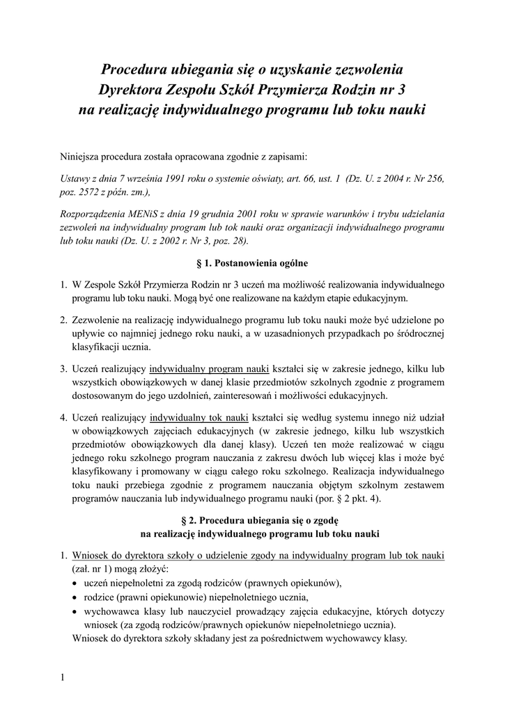 Procedura ubiegania się o uzyskanie zezwolenia Dyrektora Zespołu Szkół Przymierza Rodzin nr 3 na realizację indywidualnego programu lub toku nauki Niniejsza procedura została opracowana zgodnie z zapisami: Ustawy z dnia 7 września 1991 roku o systemie oświaty, art. 66, ust. 1 (Dz. U. z 2004 r. Nr 256, poz. 2572 z późn. zm.), Rozporządzenia MENiS z dnia 19 grudnia 2001 roku w sprawie warunków i trybu udzielania zezwoleń na indywidualny program lub tok nauki oraz organizacji indywidualnego programu lub toku nauki (Dz. U. z 2002 r. Nr 3, poz. 28). § 1. Postanowienia ogólne 1. W Zespole Szkół Przymierza Rodzin nr 3 uczeń ma możliwość realizowania indywidualnego programu lub toku nauki. Mogą być one realizowane na każdym etapie edukacyjnym. 2. Zezwolenie na realizację indywidualnego programu lub toku nauki może być udzielone po upływie co najmniej jednego roku nauki, a w uzasadnionych przypadkach po śródrocznej klasyfikacji ucznia. 3. Uczeń realizujący indywidualny program nauki kształci się w zakresie jednego, kilku lub wszystkich obowiązkowych w danej klasie przedmiotów szkolnych zgodnie z programem dostosowanym do jego uzdolnień, zainteresowań i możliwości edukacyjnych. 4. Uczeń realizujący indywidualny tok nauki kształci się według systemu innego niż udział w obowiązkowych zajęciach edukacyjnych (w zakresie jednego, kilku lub wszystkich przedmiotów obowiązkowych dla danej klasy). Uczeń ten może realizować w ciągu jednego roku szkolnego program nauczania z zakresu dwóch lub więcej klas i może być klasyfikowany i promowany w ciągu całego roku szkolnego. Realizacja indywidualnego toku nauki przebiega zgodnie z programem nauczania objętym szkolnym zestawem programów nauczania lub indywidualnego programu nauki (por. § 2 pkt. 4). § 2. Procedura ubiegania się o zgodę na realizację indywidualnego programu lub toku nauki 1. Wniosek do dyrektora szkoły o udzielenie zgody na indywidualny program lub tok nauki (zał. nr 1) mogą złożyć: uczeń niepełnoletni za zgodą rodziców (prawnych opiekunów), rodzice (prawni opiekunowie) niepełnoletniego ucznia, wychowawca klasy lub nauczyciel prowadzący zajęcia edukacyjne, których dotyczy wniosek (za zgodą rodziców/prawnych opiekunów niepełnoletniego ucznia). Wniosek do dyrektora szkoły składany jest za pośrednictwem wychowawcy klasy. 1 2. Do wniosku o udzielenie zgody na realizację indywidualnego programu lub toku nauki wychowawca klasy dołącza opinię o uczniu – jego dotychczasowych osiągnięciach, predyspozycjach, możliwościach i oczekiwaniach. 3. Nauczyciel prowadzący zajęcia edukacyjne, których dotyczy wniosek o udzielenie zezwolenia na indywidualny program, opracowuje propozycję indywidualnego programu nauki dla ucznia z zakresu danego przedmiotu. W przypadku, gdy uczeń objęty indywidualnym programem nauki w trakcie roku szkolnego zmienia szkołę, nauczyciel przedmiotu, o którym mowa, akceptuje indywidualny program nauki opracowany poza szkołą, który uczeń ma realizować pod jego kierunkiem. 4. Dyrektor Szkoły, po otrzymaniu wymienionych wyżej dokumentów, zasięga w tej sprawie opinii rady pedagogicznej, a także opinii poradni psychologiczno-pedagogicznej (dokument z poradni powinien być dostarczony przez rodziców ucznia do szkoły). 5. Jeśli opinia rady pedagogicznej i poradni psychologiczno-pedagogicznej są pozytywne, dyrektor szkoły udziela zezwolenia na realizację przez ucznia indywidualnego programu lub toku nauki (zał. nr 2). 6. W przypadku, gdy wniosek o zezwolenie na realizowanie indywidualnego toku lub programu nauczania dotyczy ucznia klasy IV, dyrektor szkoły zobowiązuje nauczyciela prowadzącego zajęcia edukacyjne, których dotyczy wniosek, do diagnozy umiejętności i predyspozycji ucznia. Szczegółowe formy diagnozowania określa dyrektor szkoły w porozumieniu z nauczycielem, uwzględniając specyfikę danego przedmiotu. 7. Po przeprowadzonej diagnozie trwającej do śródrocznej klasyfikacji ucznia – dyrektor szkoły zapoznaje się z opinią nauczyciela, popartą opinią zespołu uczącego w danej klasie. Opinia zostaje podana do wiadomości radzie pedagogicznej. 8. W przypadku przyznania uczniowi indywidualnego toku nauki, umożliwiającego realizację programu nauczania z zakresu więcej niż dwóch klas w ciągu jednego roku szkolnego, wymagana jest też pozytywna opinia organu sprawującego nadzór pedagogiczny nad szkołą. 9. Zezwolenie, o którym mowa w pkt. 6., wydawane jest na czas określony – nie krótszy niż jeden rok szkolny. § 3. Organizacja indywidualnego programu lub toku nauki 1. Po udzieleniu zezwolenia na realizację indywidualnego programu lub toku nauki dyrektor szkoły wyznacza uczniowi nauczyciela – opiekuna. 2. Opiekunem ucznia może zostać nauczyciel przedmiotu, z którego realizowany jest indywidualny program lub tok nauki, wychowawca klasy, pedagog lub psycholog szkolny. 2 3. Do zadań opiekuna ucznia realizującego program lub tok nauki należy: opracowanie indywidualnego programu nauki, zawierającego informacje dotyczące tematów, form, metod oraz terminów realizacji programu, uzyskanie akceptacji programu przez Radę Pedagogiczną, wspomaganie ucznia przy realizacji programu, organizowanie dodatkowych spotkań konsultacyjnych z uczniem w zależności od jego aktualnych potrzeb, współdziałanie z pedagogiem szkolnym, psychologiem, wychowawcą, nauczycielami innych przedmiotów i rodzicami ucznia w celu zapewnienia mu zrównoważonego rozwoju umysłowego i psychofizycznego, udzielanie informacji na posiedzeniach rady pedagogicznej i zebraniach zespołów przedmiotowych o podejmowanych i zrealizowanych zadaniach, uzyskiwanych osiągnięciach, kierowanie ucznia na pozalekcyjne i pozaszkolne formy rozwijania jego zainteresowań i umiejętności, systematyczne dokonywanie ewaluacji postępów ucznia, eksponowanie i promowanie umiejętności, zainteresowań i osiągnięć ucznia na te